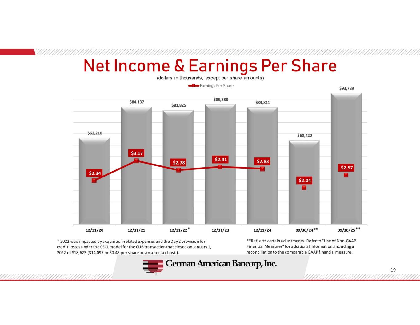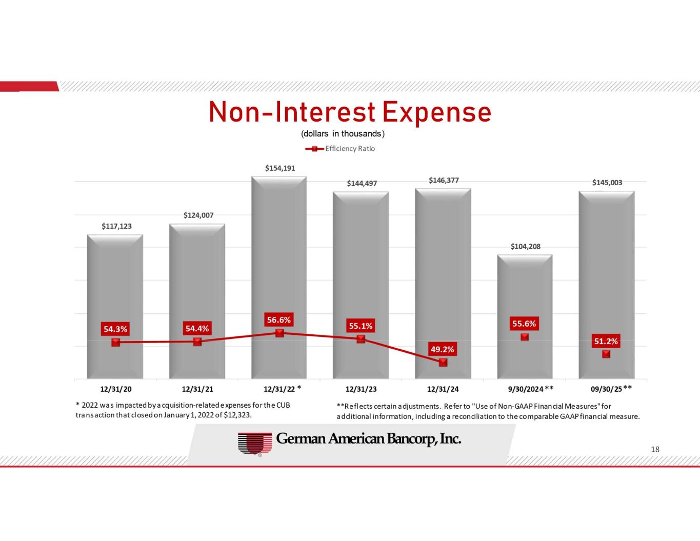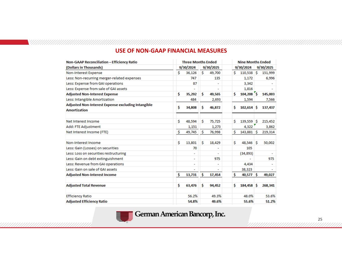 USE OF NON-GAAP FINANCIAL MEASURES The accounting and reporting policies of German American Bancorp, Inc. (the “Company”) conform to U.S. generally accepted accounting principles (“GAAP”) and general practices within the banking industry. As a supplement to GAAP, the Company has provided certain, non-GAAP financial measures, which it believes are useful because they assist investors in assessing the Company’s operating performance. Specifically, the Company has presented its net income, earnings per share, provision for credit losses, non-interest expense, non-interest income, efficiency ratio, and net interest margin on an as adjusted basis for the periods set forth below to reflect the exclusion of the following items: (1) the Current Expected Credit Losses (“CECL”) “Day 2” provision expense for acquired loans that have only insignificant credit deterioration (i.e., non-PCD loans) related to the Heartland merger; (2) non-recurring expenses related to the Heartland merger; (3) the gain on the extinguishment of debt resulting from the redemption of certain subordinated notes on September 15, 2025; (4) the operating results for German American Insurance, Inc. (“GAI”), whose assets were sold effective June 1, 2024; (5) the gain on the sale of GAI assets; and (6) the loss related to the securities portfolio restructuring transaction that occurred in the second quarter of 2024. Management believes excluding such items from these financial measures may be useful in assessing the Company’s underlying operational performance since the applicable transactions do not pertain to its core business operations and exclusion may facilitate better comparability between periods. In addition, management believes that by excluding such items the measures are useful to the Company, as well as analysts and investors, in assessing operating performance. Management also believes excluding these items may enhance comparability for peer comparison purposes. Management believes that it is standard practice in the banking industry to present the efficiency ratio and net interest margin on a fully tax- equivalent basis and that, by doing so, it may enhance comparability for peer comparison purposes. The tax-equivalent adjustment to net interest income (for purposes of the efficiency ratio) and net interest margin recognizes the income tax savings when comparing taxable and tax-exempt assets. Interest income and yields on tax-exempt securities and loans are presented using the current federal income tax rate of 21%. Although intended to enhance investors’ understanding of the Company’s business and performance, these non-GAAP financial measures should not be considered an alternative to GAAP. 23