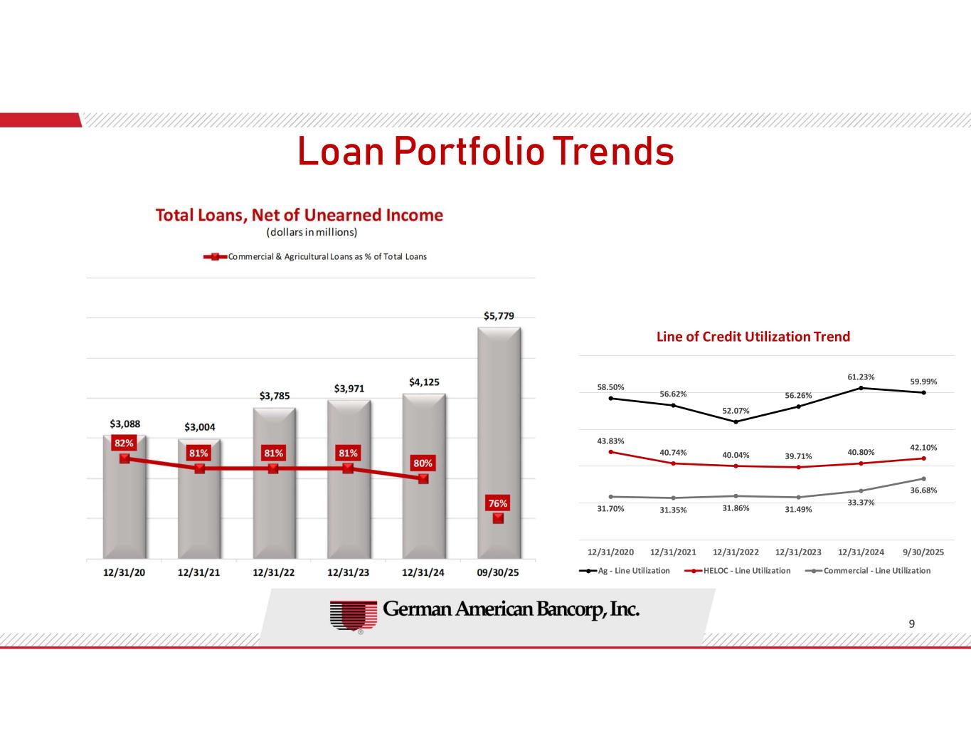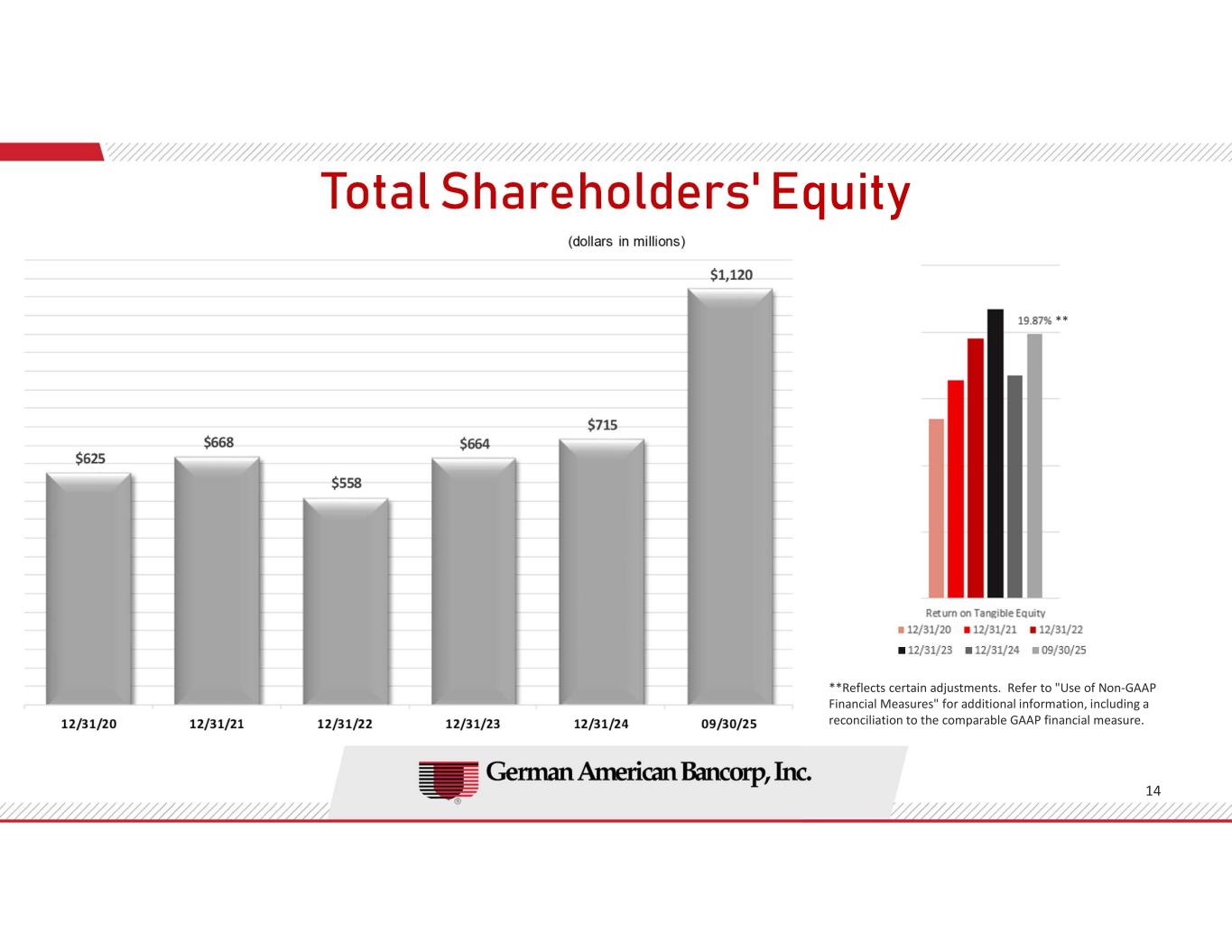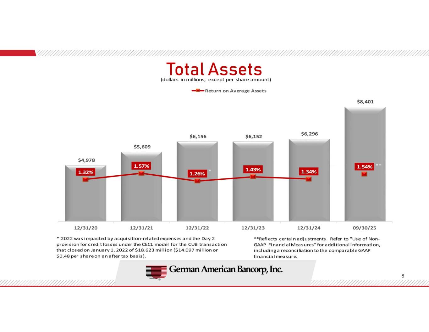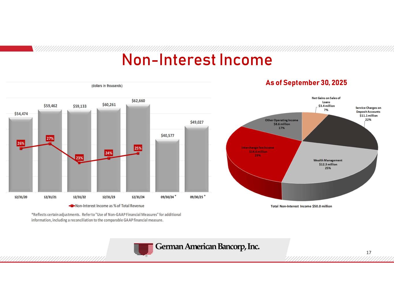 USE OF NON-GAAP FINANCIAL MEASURES The accounting and reporting policies of German American Bancorp, Inc. (the “Company”) conform to U.S. generally accepted accounting principles (“GAAP”) and general practices within the banking industry. As a supplement to GAAP, the Company has provided certain, non-GAAP financial measures, which it believes are useful because they assist investors in assessing the Company’s operating performance. Specifically, the Company has presented its net income, earnings per share, provision for credit losses, non-interest expense, non-interest income, efficiency ratio, and net interest margin on an as adjusted basis for the periods set forth below to reflect the exclusion of the following items: (1) the Current Expected Credit Losses (“CECL”) “Day 2” provision expense for acquired loans that have only insignificant credit deterioration (i.e., non-PCD loans) related to the Heartland merger; (2) non-recurring expenses related to the Heartland merger; (3) the gain on the extinguishment of debt resulting from the redemption of certain subordinated notes on September 15, 2025; (4) the operating results for German American Insurance, Inc. (“GAI”), whose assets were sold effective June 1, 2024; (5) the gain on the sale of GAI assets; and (6) the loss related to the securities portfolio restructuring transaction that occurred in the second quarter of 2024. Management believes excluding such items from these financial measures may be useful in assessing the Company’s underlying operational performance since the applicable transactions do not pertain to its core business operations and exclusion may facilitate better comparability between periods. In addition, management believes that by excluding such items the measures are useful to the Company, as well as analysts and investors, in assessing operating performance. Management also believes excluding these items may enhance comparability for peer comparison purposes. Management believes that it is standard practice in the banking industry to present the efficiency ratio and net interest margin on a fully tax- equivalent basis and that, by doing so, it may enhance comparability for peer comparison purposes. The tax-equivalent adjustment to net interest income (for purposes of the efficiency ratio) and net interest margin recognizes the income tax savings when comparing taxable and tax-exempt assets. Interest income and yields on tax-exempt securities and loans are presented using the current federal income tax rate of 21%. Although intended to enhance investors’ understanding of the Company’s business and performance, these non-GAAP financial measures should not be considered an alternative to GAAP. 23