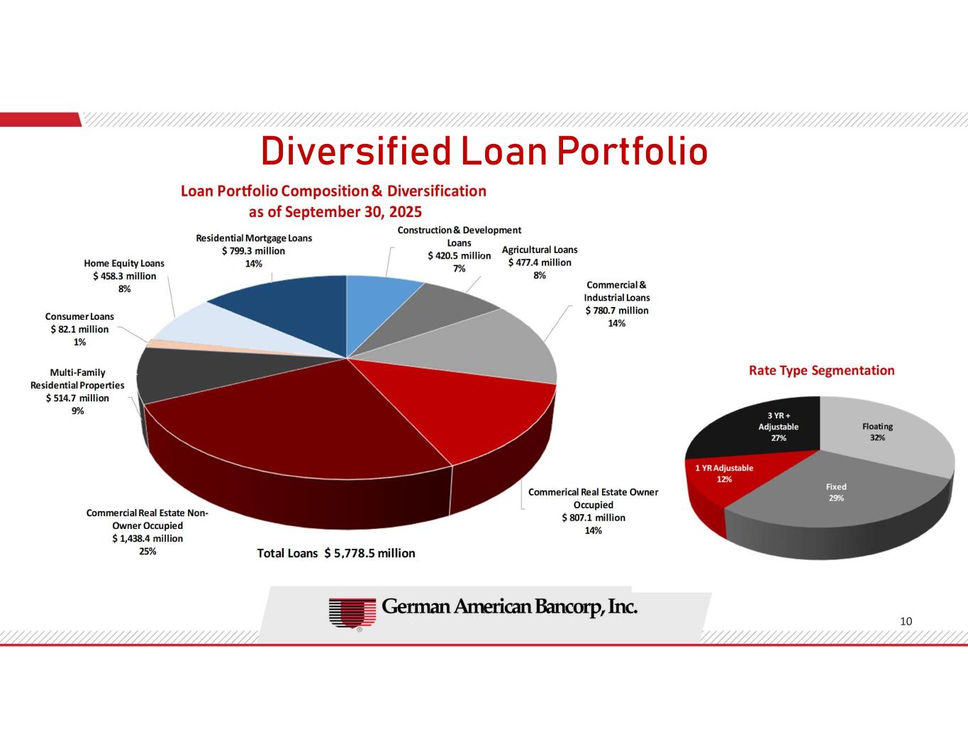 Loan Portfolio Trends 9 58.50% 56.62% 52.07% 56.26% 61.23% 59.99% 43.83% 40.74% 40.04% 39.71% 40.80% 42.10% 31.70% 31.35% 31.86% 31.49% 33.37% 36.68% 12/31/2020 12/31/2021 12/31/2022 12/31/2023 12/31/2024 9/30/2025 Line of Credit Utilization Trend Ag - Line Utilization HELOC - Line Utilization Commercial - Line Utilization