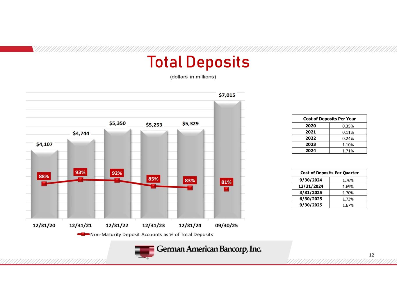Total Deposits 12 Cost of Deposits Per Year 0.35%2020 0.11%2021 0.24%2022 1.10%2023 1.71%2024 9/30/2024 1.76% 12/31/2024 1.69% 3/31/2025 1.70% 6/30/2025 1.73% 9/30/2025 1.67% Cost of Deposits Per Quarter