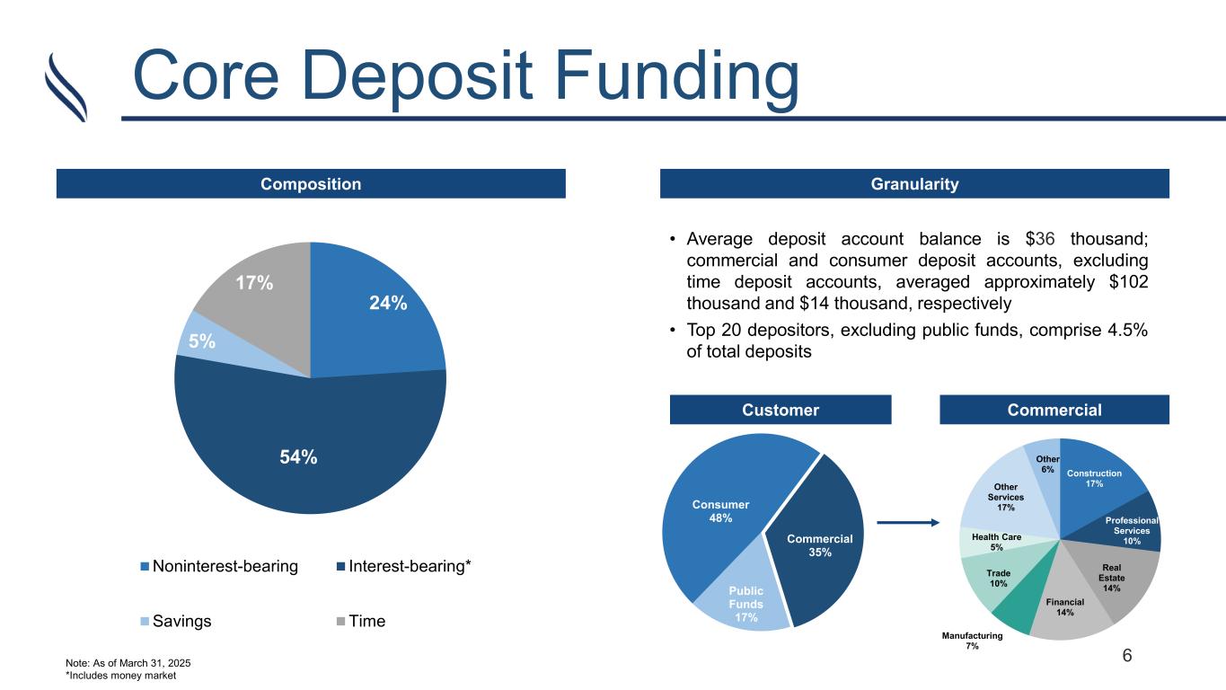 -2025年3月31日現在の預金残高は、連動四半期ベースで1億9950万ドル増加した。無利息預金は連動して四半期ベースで1億3,740万ドル増加し、2025年3月31日現在の預金総額の24.0%を占め た。