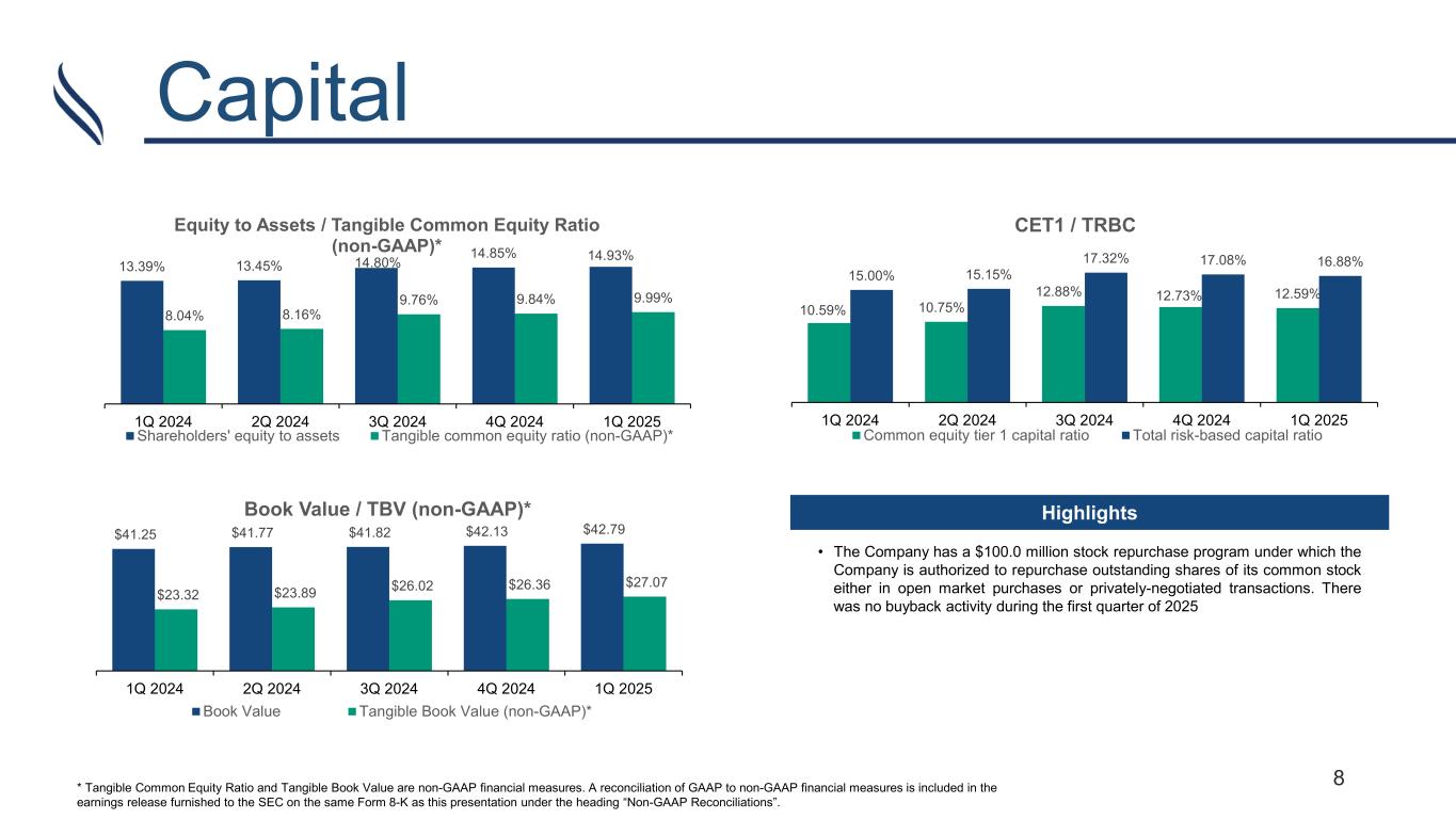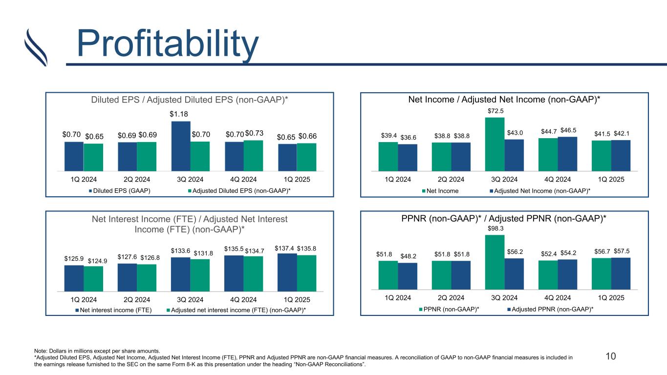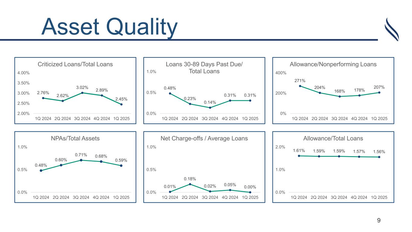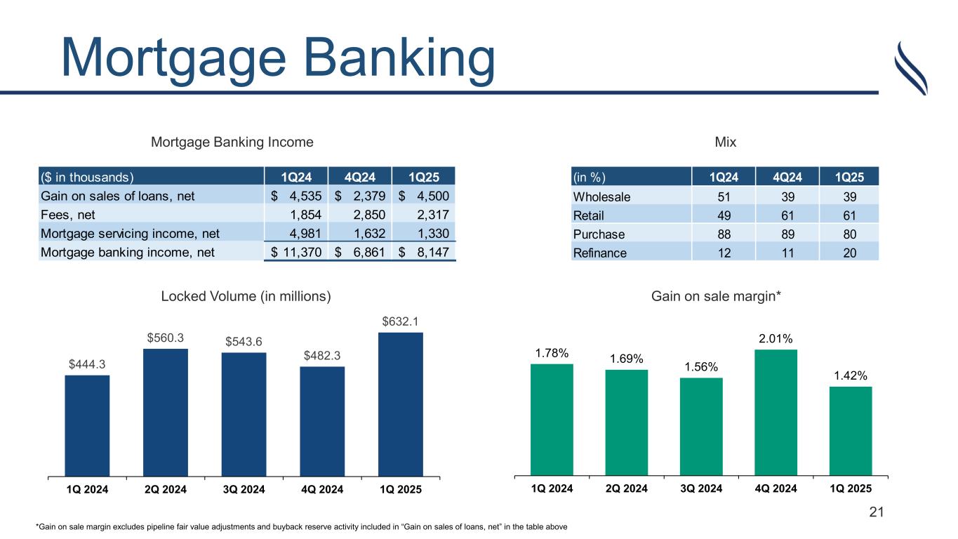 -モーゲージ・バンキング収益は連動四半期で130万ドル増加した。モーゲージ部門の 2025 年第 1 四半期の金利ロック取引高は 6 億 3,210 万ドルとなり、連動して 1 億 4,980 万ドル増加した。2025 年第 1 四半期の売却益マージンは 1.42%となり、連動四半期比で 59bp 低下した。