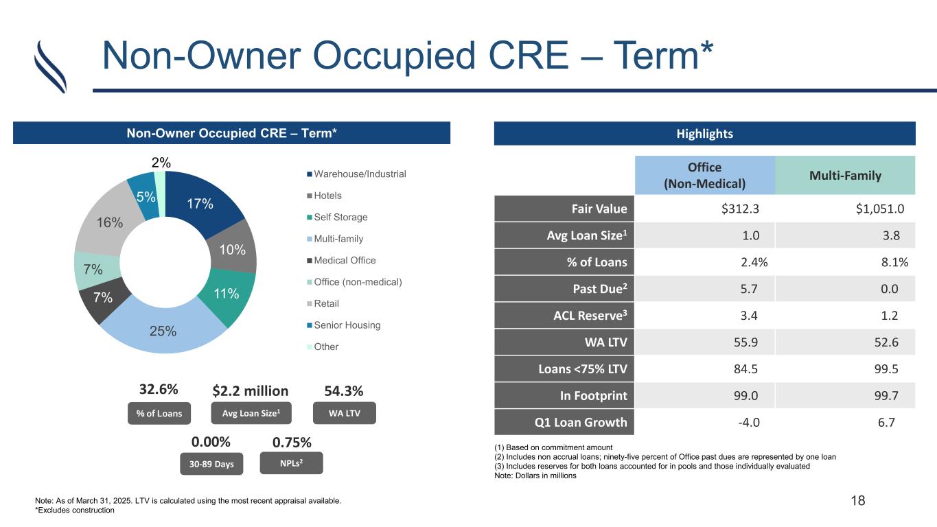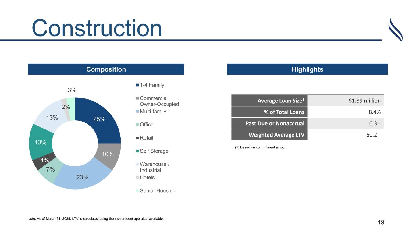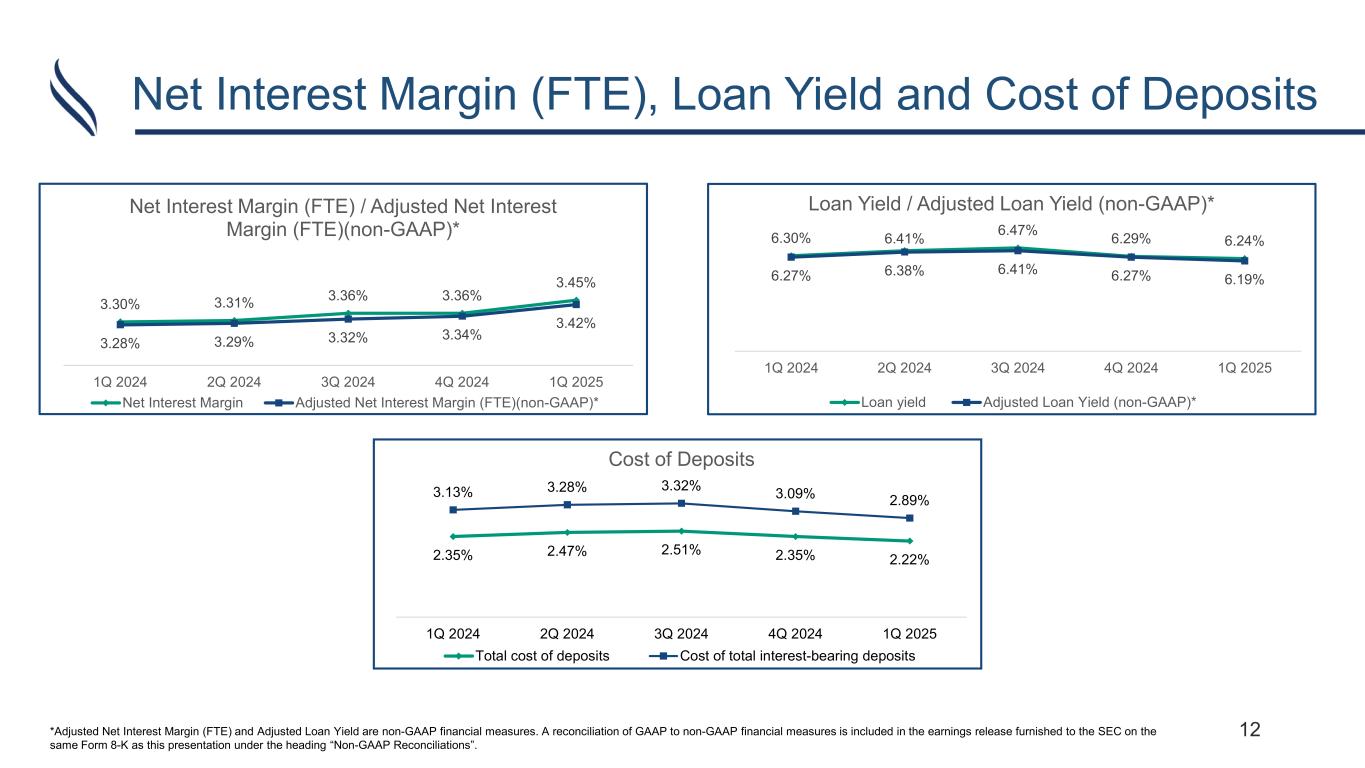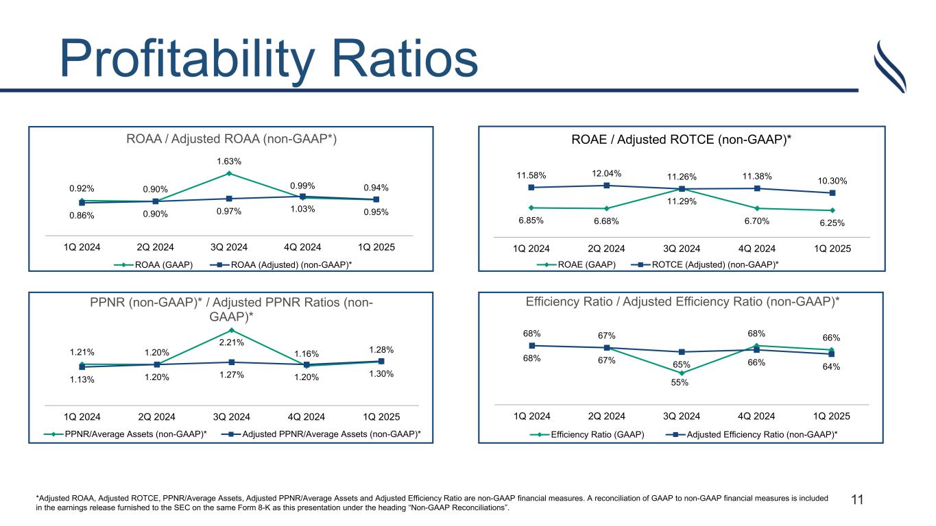 -モーゲージ・バンキング収益は連動四半期で130万ドル増加した。モーゲージ部門の 2025 年第 1 四半期の金利ロック取引高は 6 億 3,210 万ドルとなり、連動して 1 億 4,980 万ドル増加した。2025 年第 1 四半期の売却益マージンは 1.42%となり、連動四半期比で 59bp 低下した。