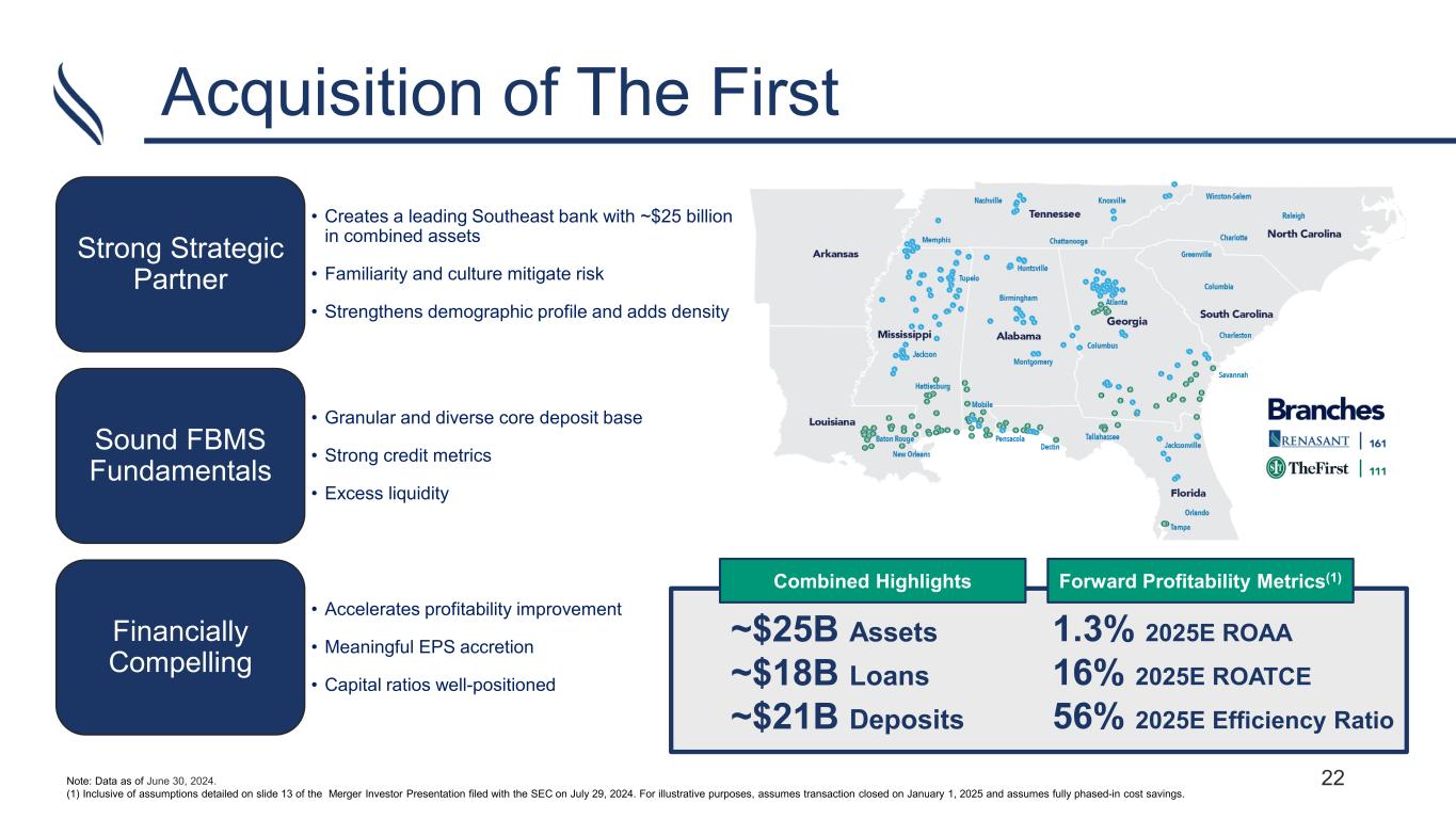 -当社は2025年4月1日、ザ・ファースト・バンクシェアーズ・インク(以下「ザ・ファースト」)との合併を完了した。買収日現在、ザ・ファーストはルイジアナ州、ミシシッピ州、アラバマ州、ジョージア州、フロリダ州で116拠点を運営しており、買収会計調整前の資産は約80億ドル(うち貸出金約54億ドル)、預金約65億ドルであった。