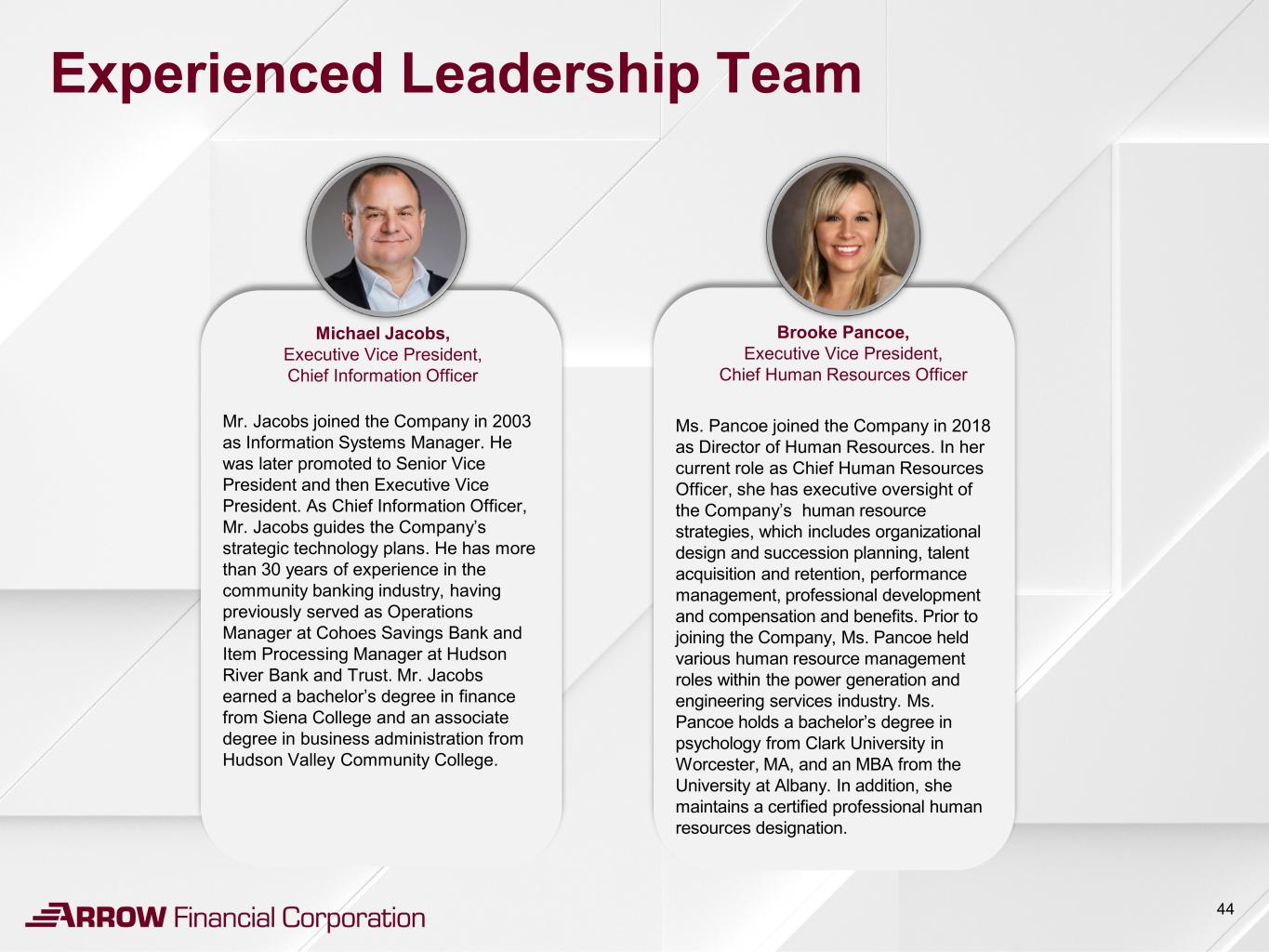 ミラー取締役が退任へ。 2026年1月28日、エリザベス・A・ミラーはアロー・フィナンシャル・コーポレーション(以下「当社」)の取締役会に対し、2026年定時株主総会をもって任期満了となる取締役職を退任する旨を通知しました。ミラー氏は2017年より当社の取締役を務めてまいりました。長年にわたる当社への貢献に感謝するとともに、今後のご活躍をお祈り申し上げます。