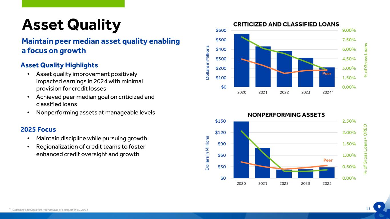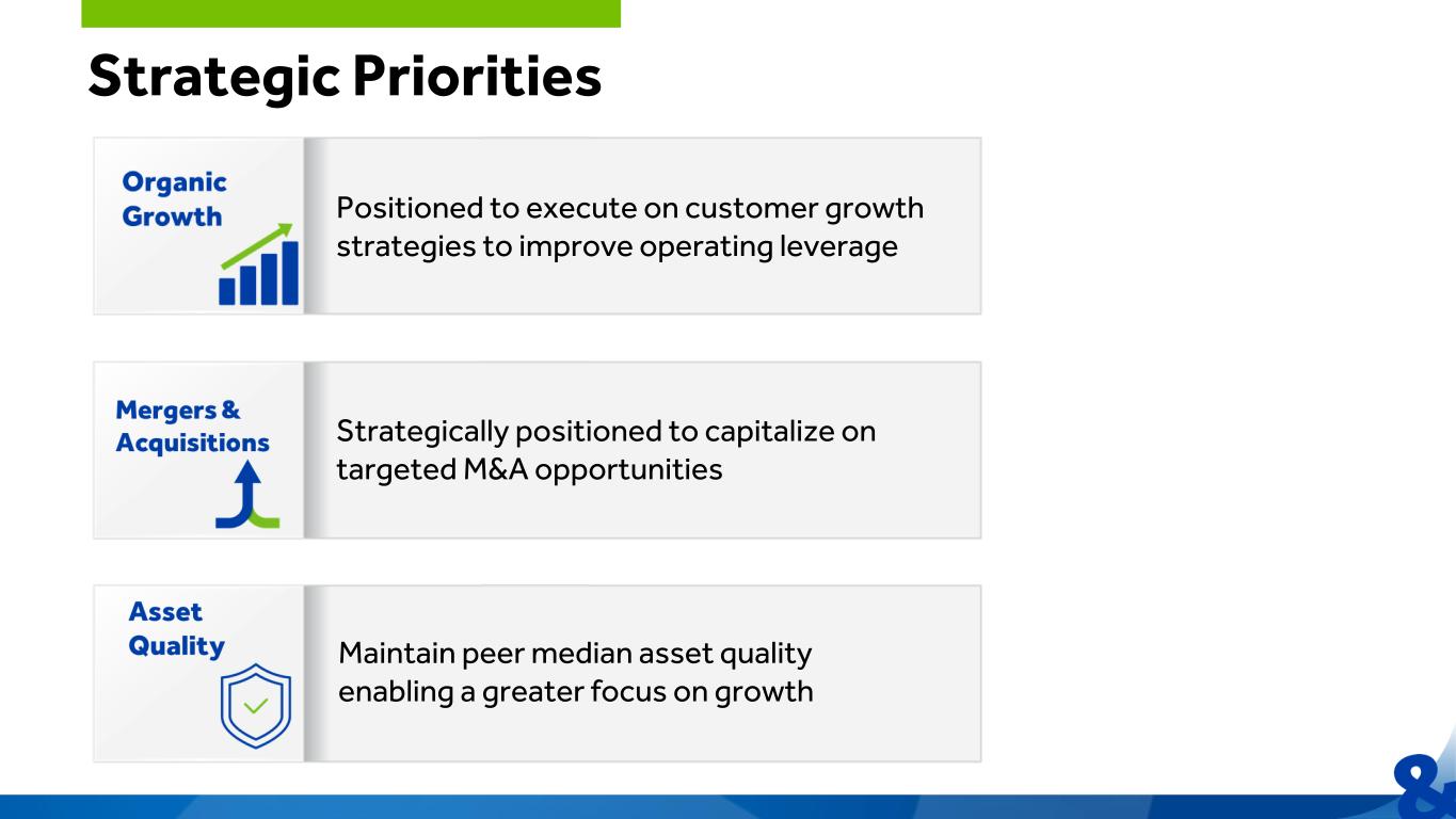 Strategic Priorities Positioned to execute on customer growth strategies to improve operating leverage Maintain peer median asset quality enabling a greater focus on growth Strategically positioned to capitalize on targeted M&A opportunities