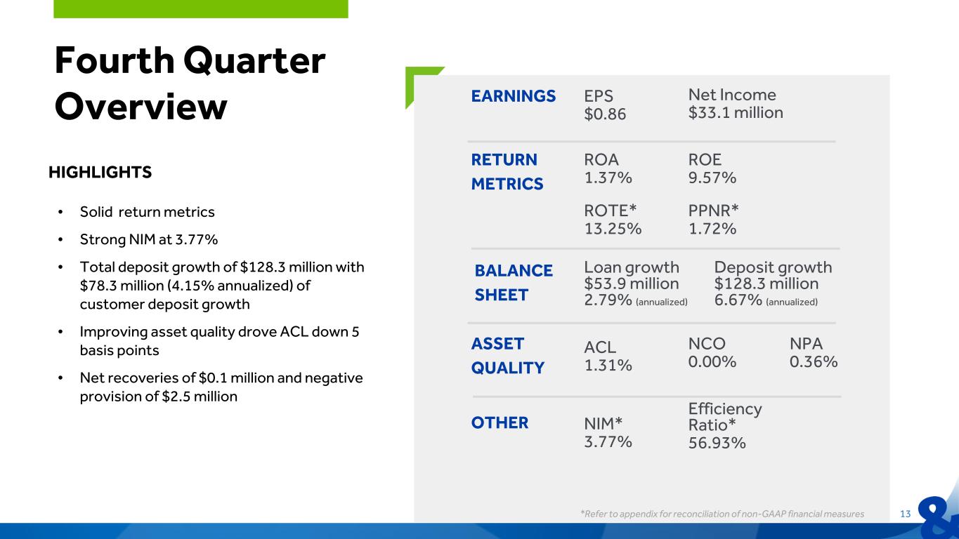 12 Full Year Overview RETURN METRICS EARNINGS *Refer to appendix for reconciliation of non-GAAP financial measures EPS $3.41 Net Income $131.3 million ROA 1.37% ROE 9.86% ROTE* 13.84% PPNR* 1.77% HIGHLIGHTS • Solid return metrics • Positioned for growth with strong capital levels • Strong NIM of 3.82% • Total deposit growth of $261.3 million with $411.7 million (5.76%) of customer deposit growth • Higher-costing wholesale funding decreased $404 million • Significant improvement in asset quality drove meaningful earnings impact NIM* 3.82% NCO 0.11% OTHER Efficiency Ratio* 55.99% BALANCE SHEET Loan growth $89.6 million 1.17% Deposit growth $261.3 million 3.47% ASSET QUALITY ACL 1.31% NPA 0.36%