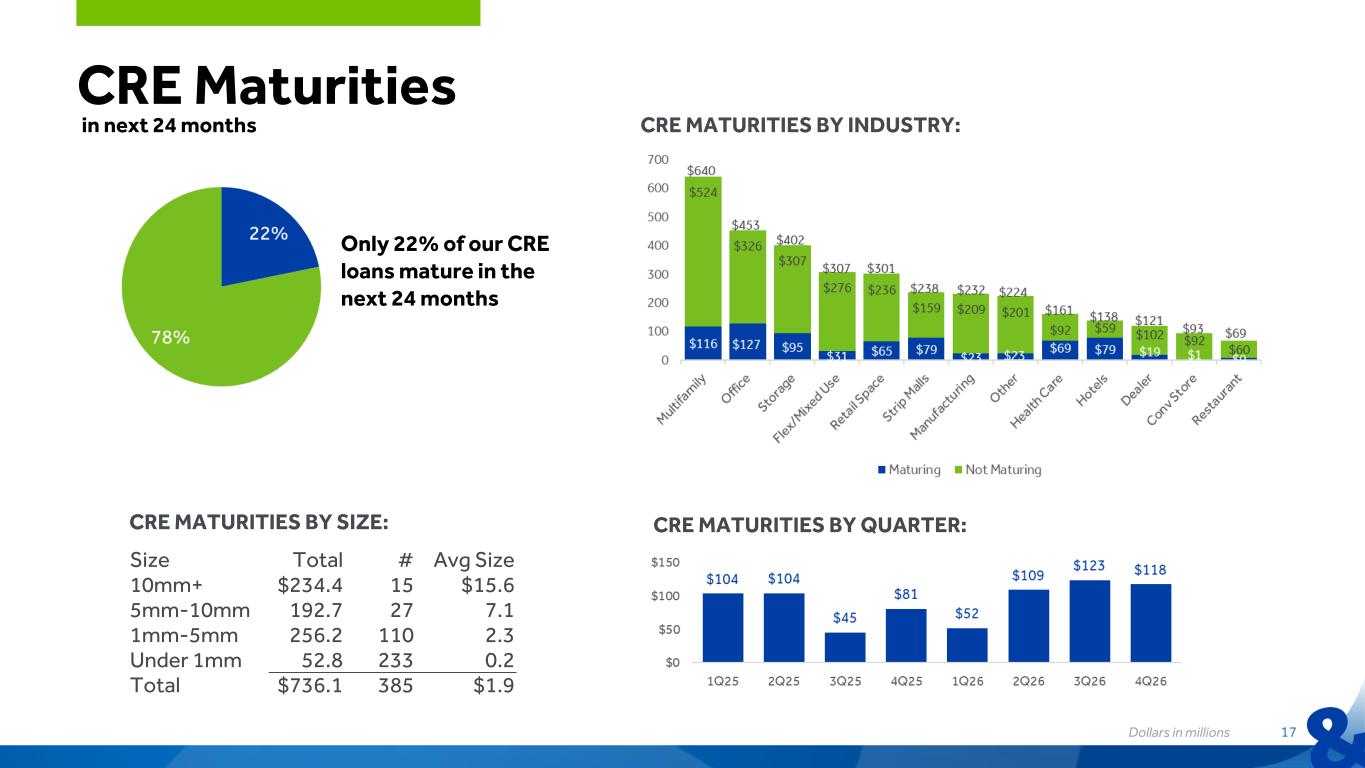 CRE Maturities Dollars in millions 17 CRE MATURITIES BY SIZE: CRE MATURITIES BY INDUSTRY: Size Total # Loans Avg Size 10mm+ $234.4 15 $15.6 5mm-10mm 192.7 27 7.1 1mm-5mm 256.2 110 2.3 Under 1mm 52.8 233 0.2 Total $736.1 385 $1.9 in next 24 months CRE MATURITIES BY QUARTER: Only 22% of our CRE loans mature in the next 24 months 16%
