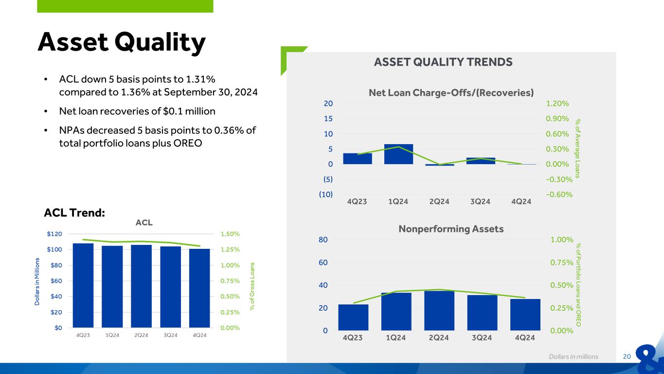 Asset Quality 2024 2023 2022 2021 2020 Dollars in thousands Total Nonaccrual Loans $27,937 $22,946 $19,052 $66,291 $146,774 Nonaccrual Loans/Total Loans 0.36% 0.30% 0.27% 0.95% 2.03% Nonperforming Assets/Total Loans + OREO 0.36% 0.30% 0.31% 1.13% 2.06% Net Charge-offs/Average Loans 0.11% 0.18% 0.04% 0.49% 1.40% Allowance for Credit Losses/Total Portfolio Loans 1.31% 1.41% 1.41% 1.41% 1.63% Allowance for Credit Losses/Nonaccrual Loans 363% 471% 532% 149% 80% Financial Data 32