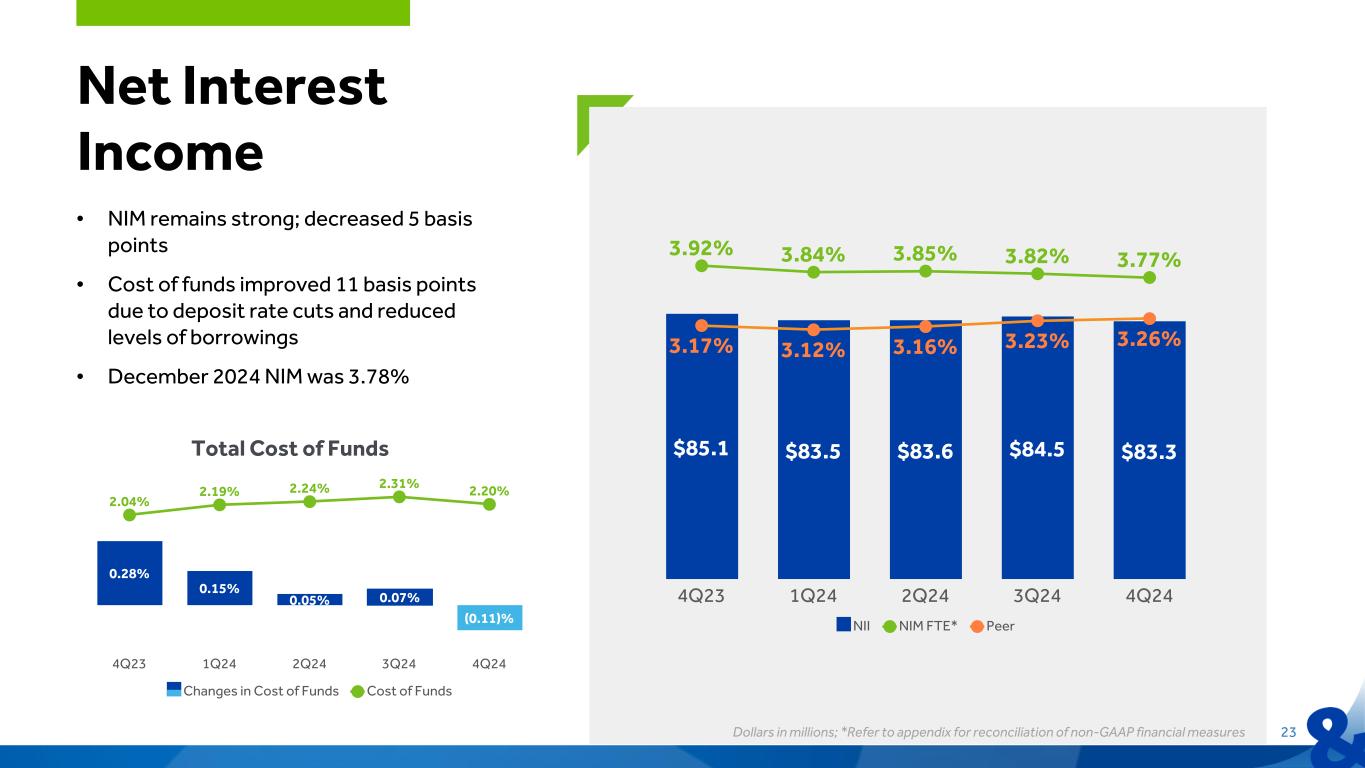 • NIM remains strong; decreased 5 basis points • Cost of funds improved 11 basis points due to deposit rate cuts and reduced levels of borrowings • December 2024 NIM was 3.78% Net Interest Income Dollars in millions; *Refer to appendix for reconciliation of non-GAAP financial measures 23 $85.1 $83.5 $83.6 $84.5 $83.3 3.92% 3.84% 3.85% 3.82% 3.77% 3.17% 3.12% 3.16% 3.23% 3.26% NII NIM FTE* Peer 4Q23 1Q24 2Q24 3Q24 4Q24 Total Cost of Funds 0.28% 0.15% 0.05% 0.07% (0.11)% 2.04% 2.19% 2.24% 2.31% 2.20% Changes in Cost of Funds Cost of Funds 4Q23 1Q24 2Q24 3Q24 4Q24