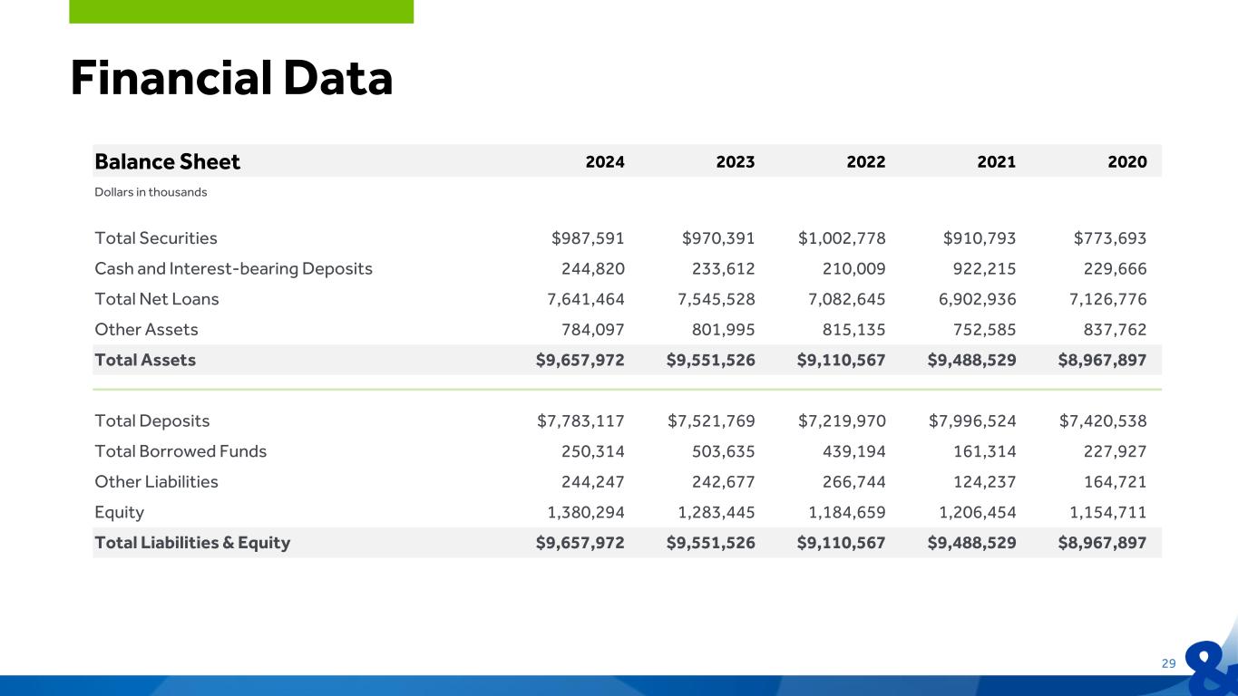 Financial Data 29 Balance Sheet 2024 2023 2022 2021 2020 Dollars in thousands Total Securities $987,591 $970,391 $1,002,778 $910,793 $773,693 Cash and Interest-bearing Deposits 244,820 233,612 210,009 922,215 229,666 Total Net Loans 7,641,464 7,545,528 7,082,645 6,902,936 7,126,776 Other Assets 784,097 801,995 815,135 752,585 837,762 Total Assets $9,657,972 $9,551,526 $9,110,567 $9,488,529 $8,967,897 Total Deposits $7,783,117 $7,521,769 $7,219,970 $7,996,524 $7,420,538 Total Borrowed Funds 250,314 503,635 439,194 161,314 227,927 Other Liabilities 244,247 242,677 266,744 124,237 164,721 Equity 1,380,294 1,283,445 1,184,659 1,206,454 1,154,711 Total Liabilities & Equity $9,657,972 $9,551,526 $9,110,567 $9,488,529 $8,967,897