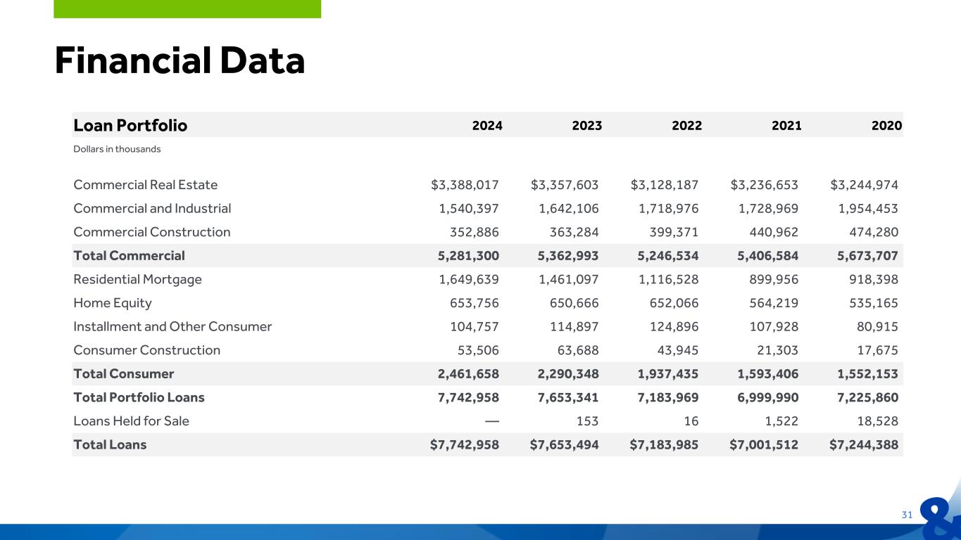 Financial Data 31 Loan Portfolio 2024 2023 2022 2021 2020 Dollars in thousands Commercial Real Estate $3,388,017 $3,357,603 $3,128,187 $3,236,653 $3,244,974 Commercial and Industrial 1,540,397 1,642,106 1,718,976 1,728,969 1,954,453 Commercial Construction 352,886 363,284 399,371 440,962 474,280 Total Commercial 5,281,300 5,362,993 5,246,534 5,406,584 5,673,707 Residential Mortgage 1,649,639 1,461,097 1,116,528 899,956 918,398 Home Equity 653,756 650,666 652,066 564,219 535,165 Installment and Other Consumer 104,757 114,897 124,896 107,928 80,915 Consumer Construction 53,506 63,688 43,945 21,303 17,675 Total Consumer 2,461,658 2,290,348 1,937,435 1,593,406 1,552,153 Total Portfolio Loans 7,742,958 7,653,341 7,183,969 6,999,990 7,225,860 Loans Held for Sale — 153 16 1,522 18,528 Total Loans $7,742,958 $7,653,494 $7,183,985 $7,001,512 $7,244,388