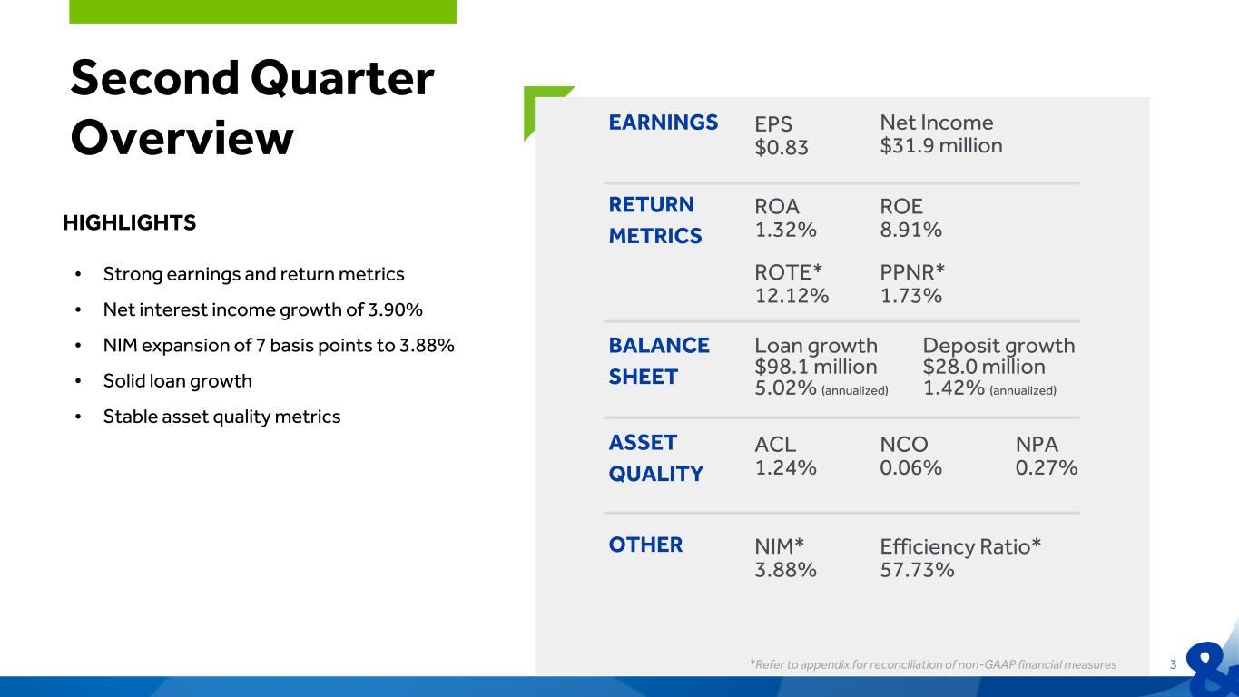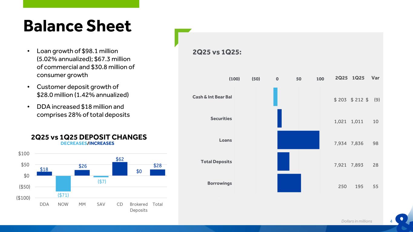 2025年6月30日現在の総資産は、2025年3月31日現在の97億ドルに対して98億ドルであった。ポートフォリオ・ローン総額は2025年3月31日時点と比べ9,810万ドル(年率5.02%)増加した。商業用ローン・ポートフォリオは、商業用不動産が5,800万ドル、商業用建設が1,770万ドル増加し、6,730万ドル増加しました。消費者ローン・ポートフォリオは2025年3月31日に比べ3,080万ドル増加した。預金総額は2025年3月31日比2,800万ドル(年率1.42%)増加した。2025年3月31日比では、無利息要求払預金が1,790万ドル、マネー・マーケットが2,620万ドル、CDが6,210万ドル増加したが、有利子要求払預金が7,150万ドル、貯蓄預金が670万ドル減少したことにより相殺された。借入金合計は、貸出金の増加資金を調達するため、2025年3月31日時点の1億9,530万ドルから5,500万ドル増加し、2億5,030万ドルとなった。