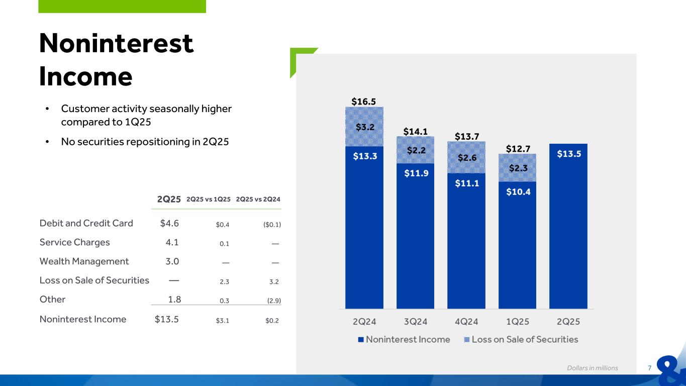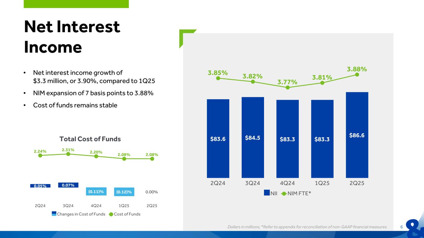 資産の質は2025年第2四半期も引き続き堅調であった。2025年6月30日現在の貸倒引当金(ACL)は9,860万ドル、ポートフォリオ・ローン合計の1.24%であった(2025年3月31日時点は9,900万ドル、1.26%)。貸倒引当金繰入額は、2025 年第 1 四半期のマイナス 300 万ドルに対し、2025 年第 2 四半期は 200 万ドルでした。2025年第1四半期の引当金のマイナスは、正味回収額および特定引当金の減少420万ドルに関連するものでした。正味償却額は、2025 年第 1 四半期の正味回収額に対し 120 万ドル(平均貸出金の 0.06%)でした。不良資産は、2025 年 3 月 31 日時点の 2,240 万ドル(0.29%)から 110 万ドル減少し、2,130 万ドル(貸出金+OREO の 0.27%)となった。