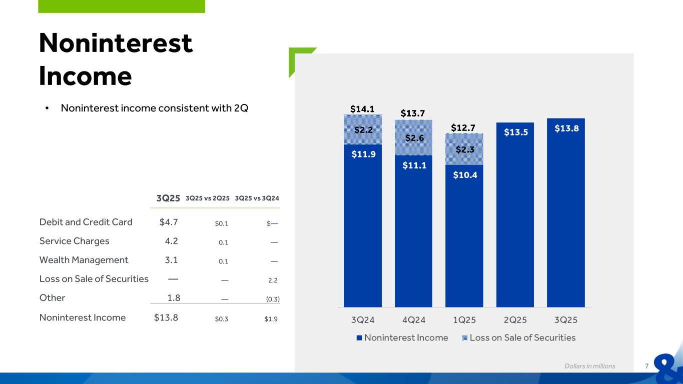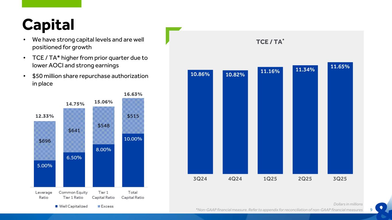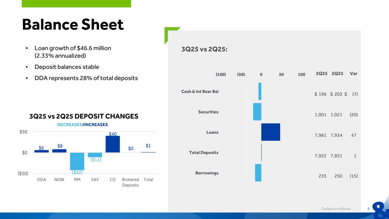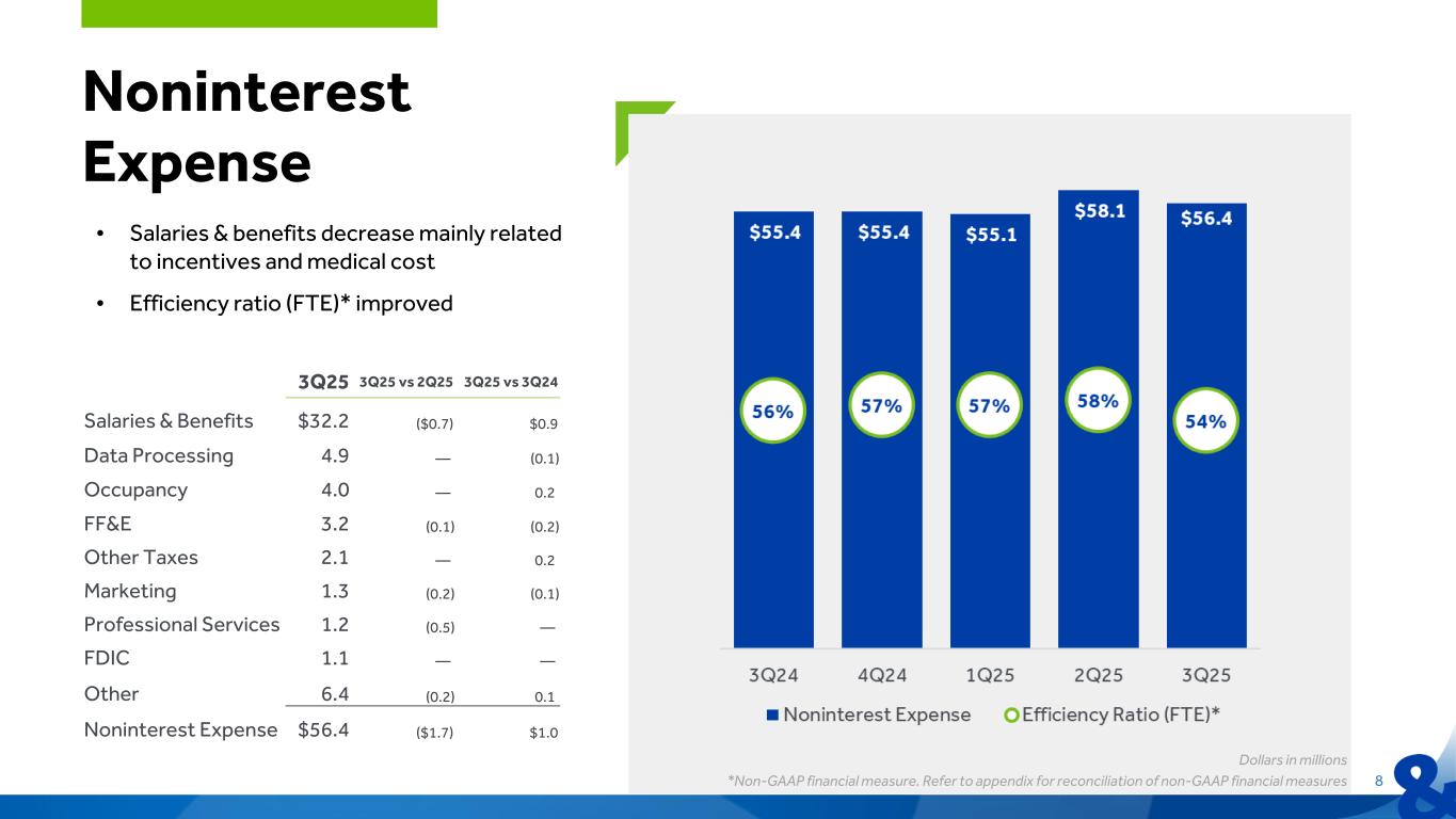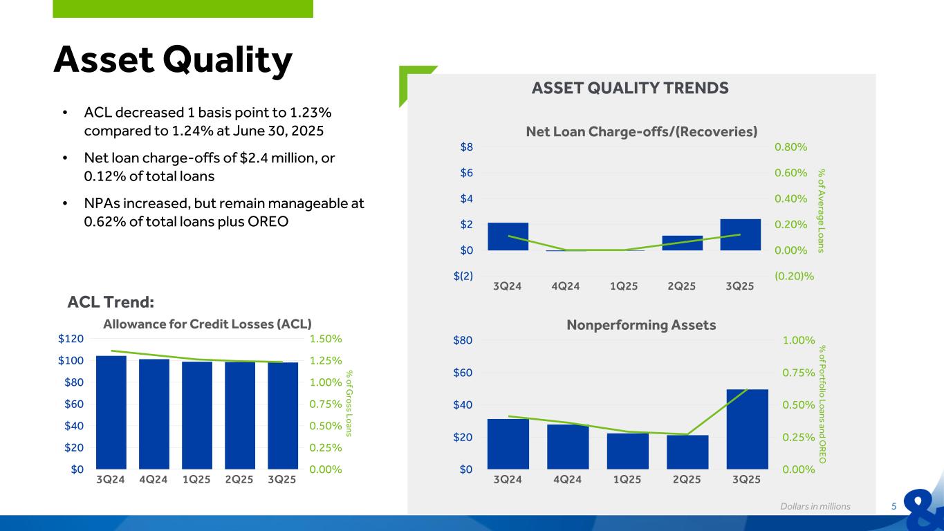 信用損失引当金(ACL)は、2025年6月30日時点の9,860万ドル(1.24%)に対し、2025年9月30日時点では9,820万ドル(1.23%)であった。貸倒引当金繰入額は、2025 年第 2 四半期の 200 万ドルに対し、2025 年第 3 四半期は 280 万ドルでした。正味貸倒引当金は、2025 年第 2 四半期の 120 万ドル(平均貸出金の 0.06%)に対し、2025 年第 3 四半期は 240 万ドル(平均貸出金の 0.12%)でした。不良資産(NPA)は、2025年6月30日時点の2,130万ドル(0.27%)に対し、2,830万ドル増加し、4,960万ドル(貸出金+OREO合計の0.62%)となりました。NPA総額は管理可能な水準を維持している。