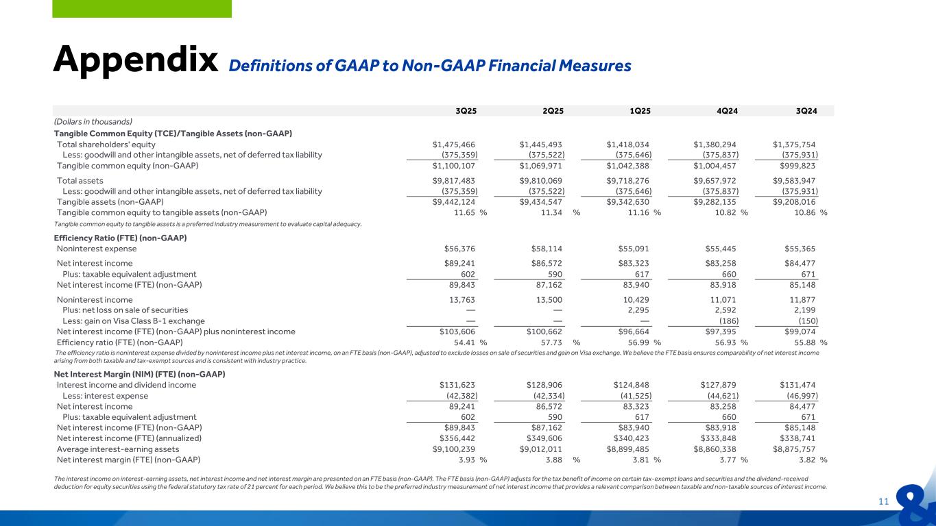 -純金利収入は260万ドル(3.00%)増加し、NIM(FTE)(非GAAP基準)の純金利マージンは2025年第2四半期の3.88%から5ベーシス・ポイント拡大し3.93%となった。