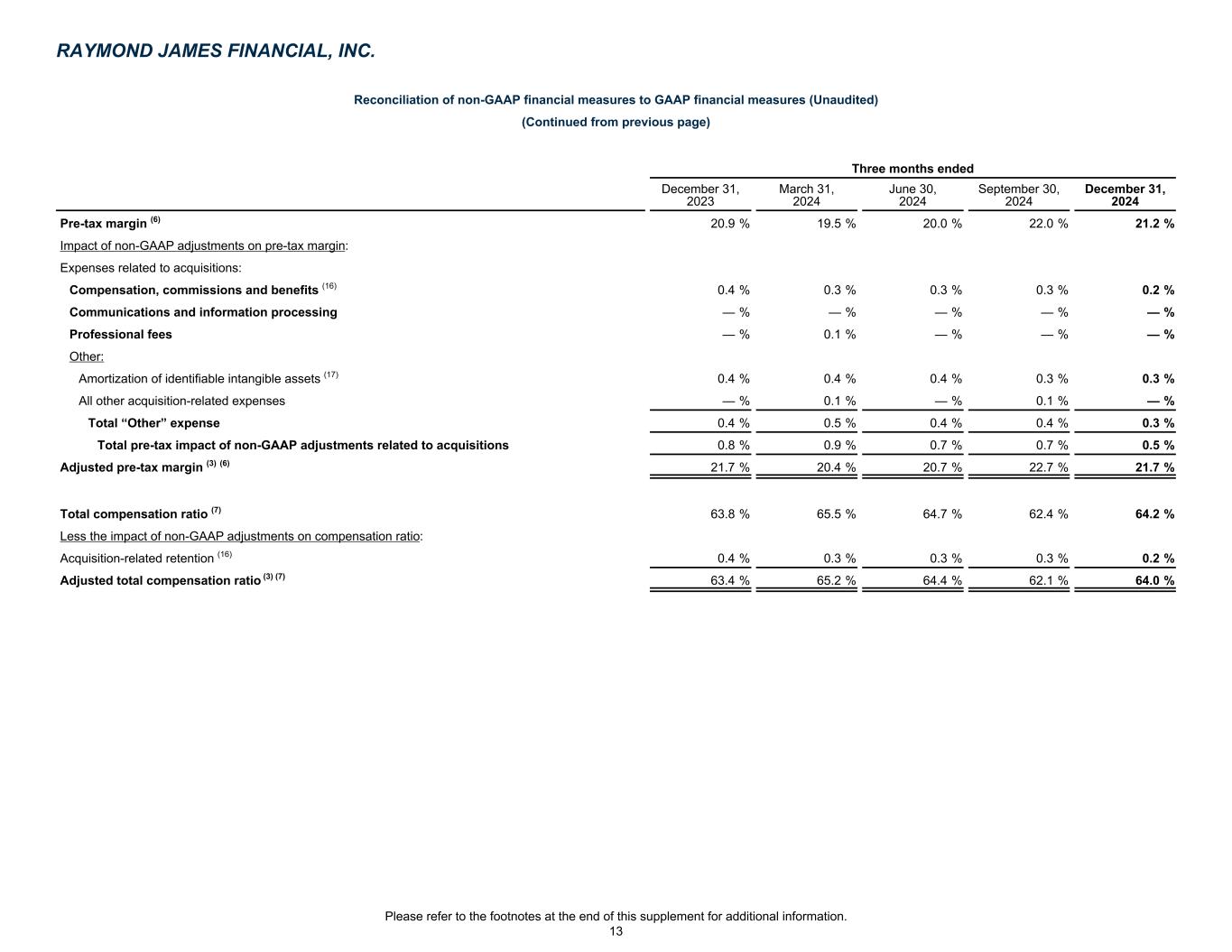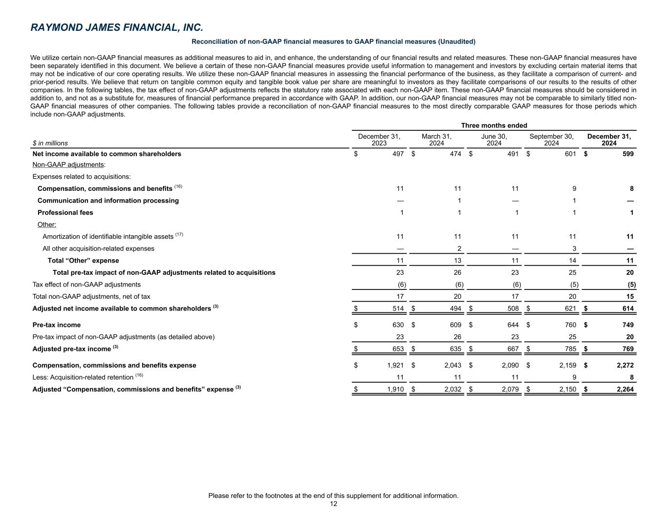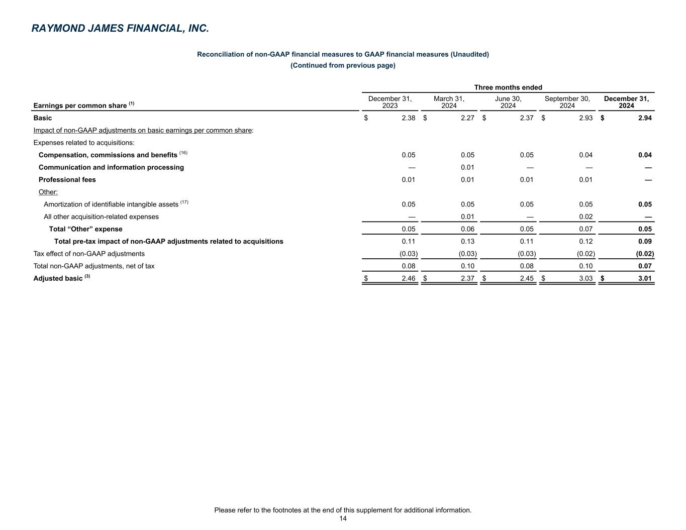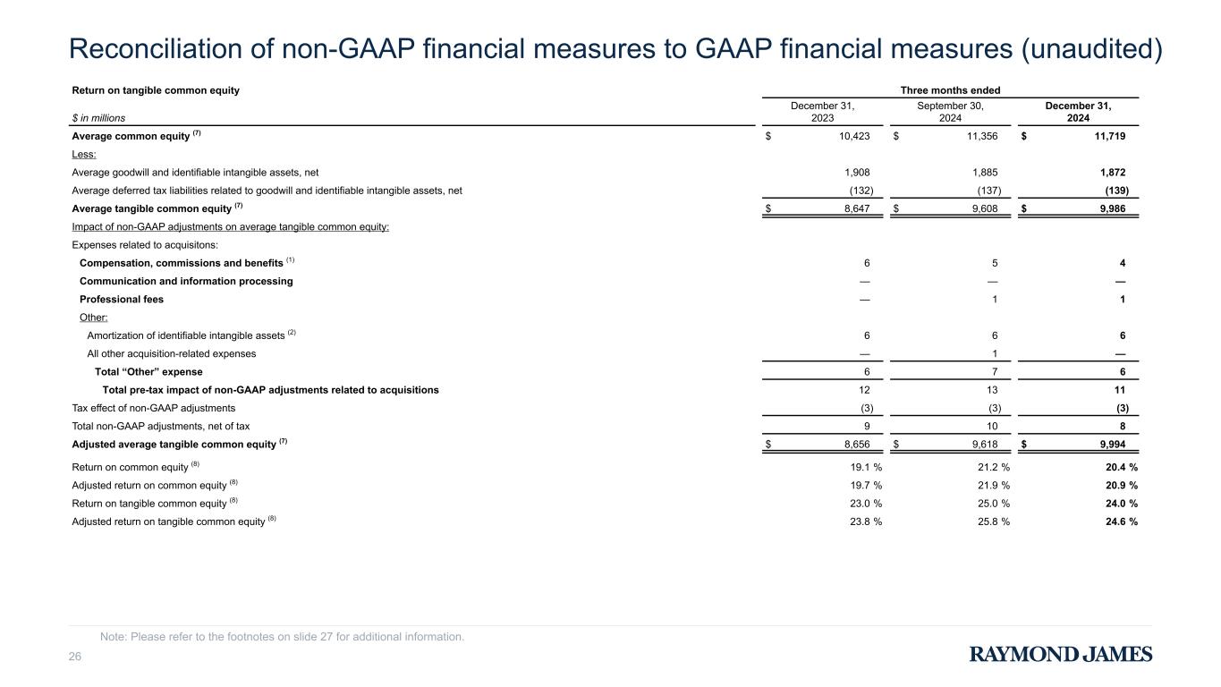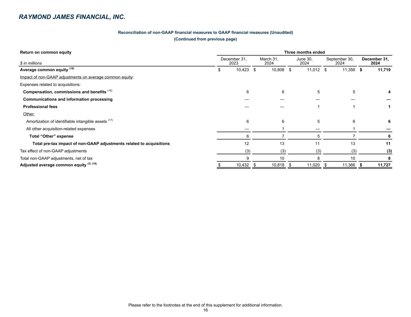 | (21) | Average common equity is computed by adding the total common equity attributable to Raymond James Financial, Inc. as of the date indicated to the prior quarter-end total, and dividing by two, or in the case of average tangible common equity, computed by adding tangible common equity as of the date indicated to the prior quarter-end total, and dividing by two. Adjusted average common equity is computed by adjusting for the impact on average common equity of the non-GAAP adjustments, as applicable for each respective period. Adjusted average tangible common equity is computed by adjusting for the impact on average tangible common equity of the non-GAAP adjustments, as applicable for each respective period. | |||||||