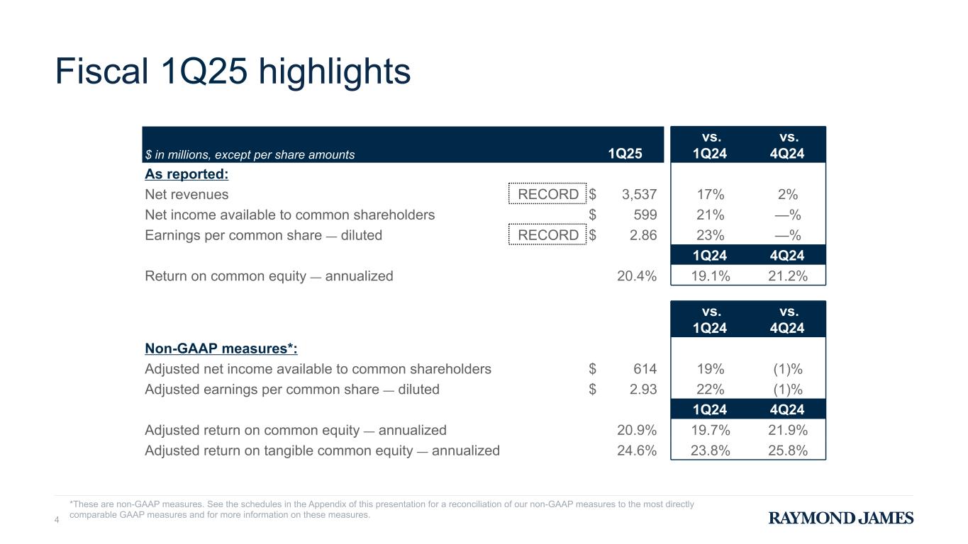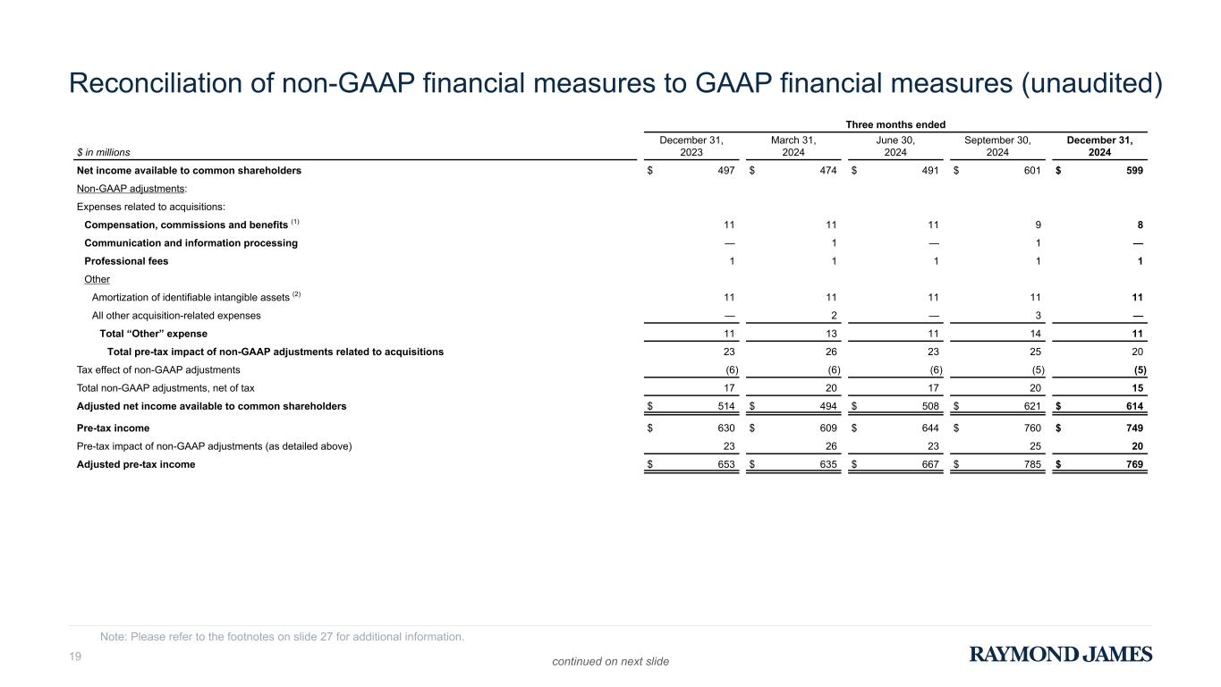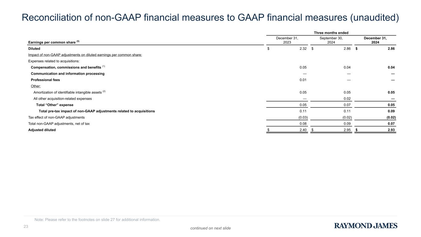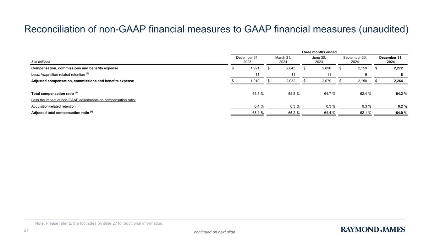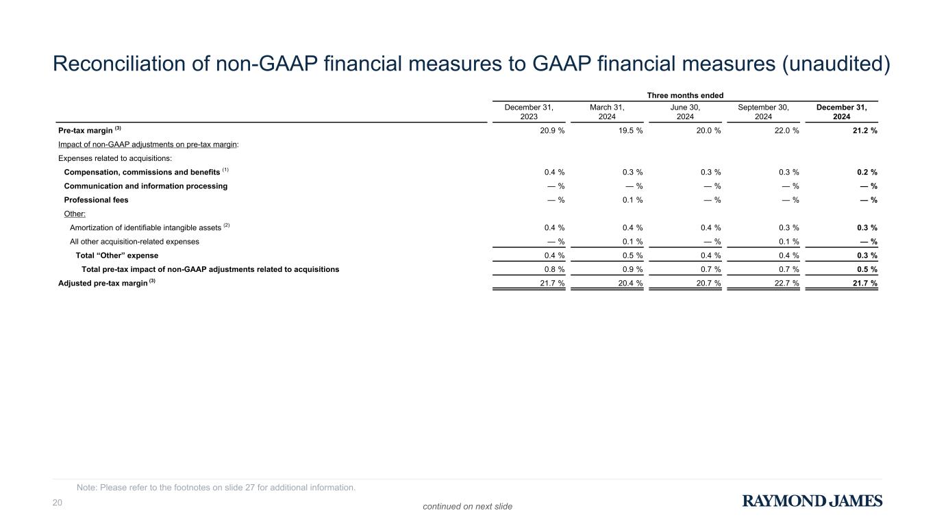 | (21) | Average common equity is computed by adding the total common equity attributable to Raymond James Financial, Inc. as of the date indicated to the prior quarter-end total, and dividing by two, or in the case of average tangible common equity, computed by adding tangible common equity as of the date indicated to the prior quarter-end total, and dividing by two. Adjusted average common equity is computed by adjusting for the impact on average common equity of the non-GAAP adjustments, as applicable for each respective period. Adjusted average tangible common equity is computed by adjusting for the impact on average tangible common equity of the non-GAAP adjustments, as applicable for each respective period. | |||||||