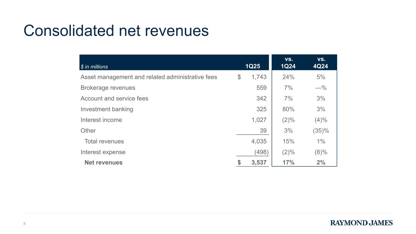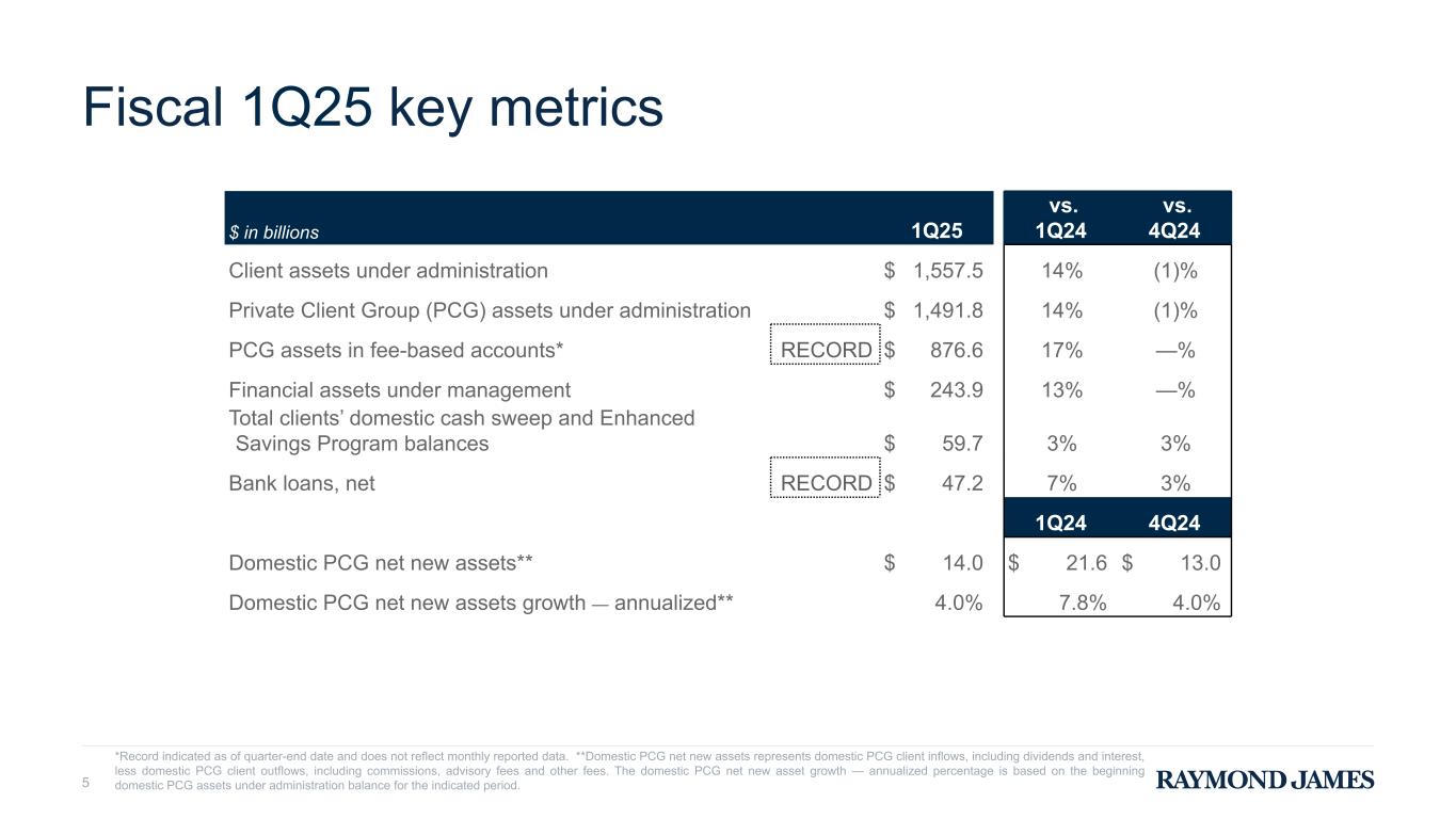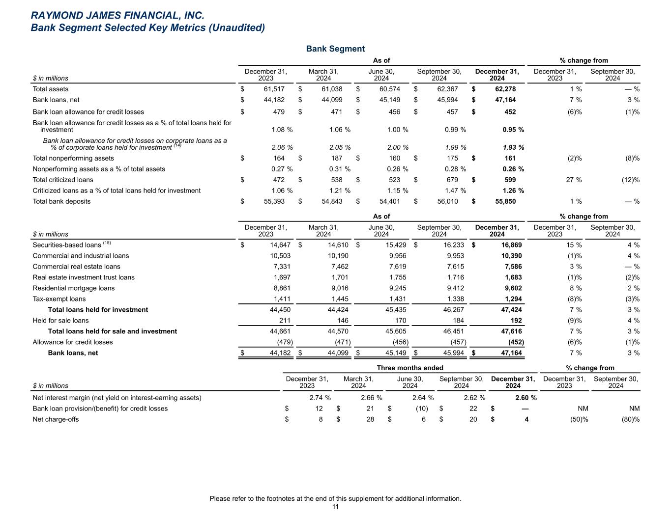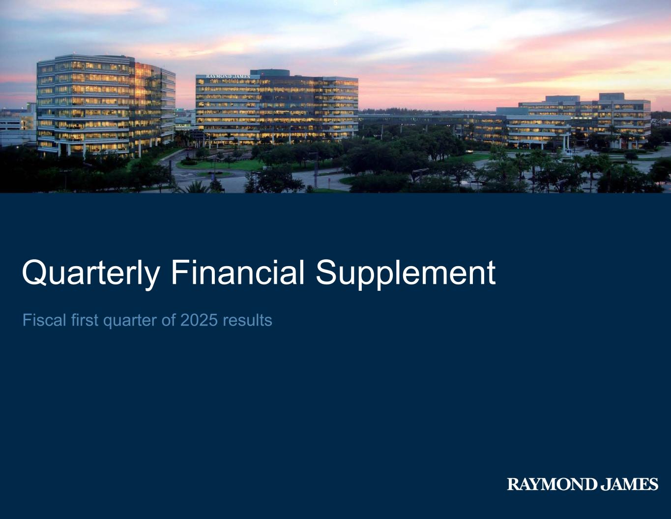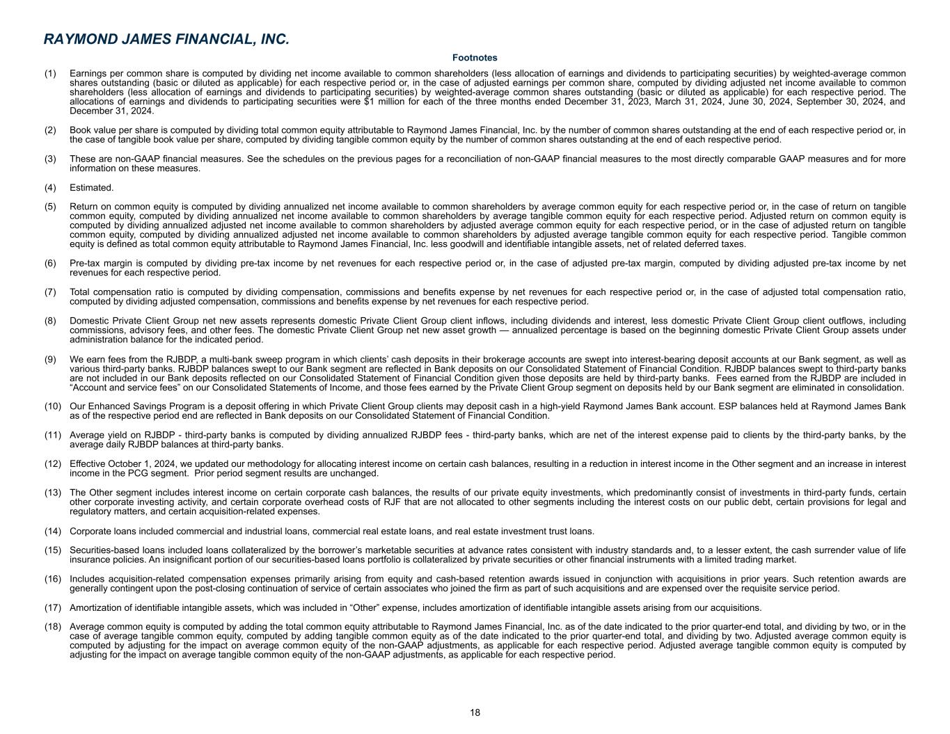 | (9) | We earn fees from the RJBDP, a multi-bank sweep program in which clients’ cash deposits in their brokerage accounts are swept into interest-bearing deposit accounts at our Bank segment, as well as various third-party banks. RJBDP balances swept to our Bank segment are reflected in Bank deposits on our Consolidated Statement of Financial Condition and within money market and other savings accounts in our net interest disclosures in this release. RJBDP balances swept to third-party banks are not included in our Bank deposits on our Consolidated Statement of Financial Condition given those deposits are held by third-party banks. Fees earned from the RJBDP are included in “Account and service fees” on our Consolidated Statements of Income, and those fees earned by the Private Client Group segment on deposits held by our Bank segment are eliminated in consolidation. |
