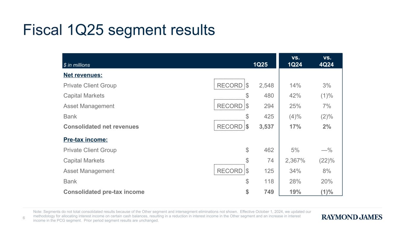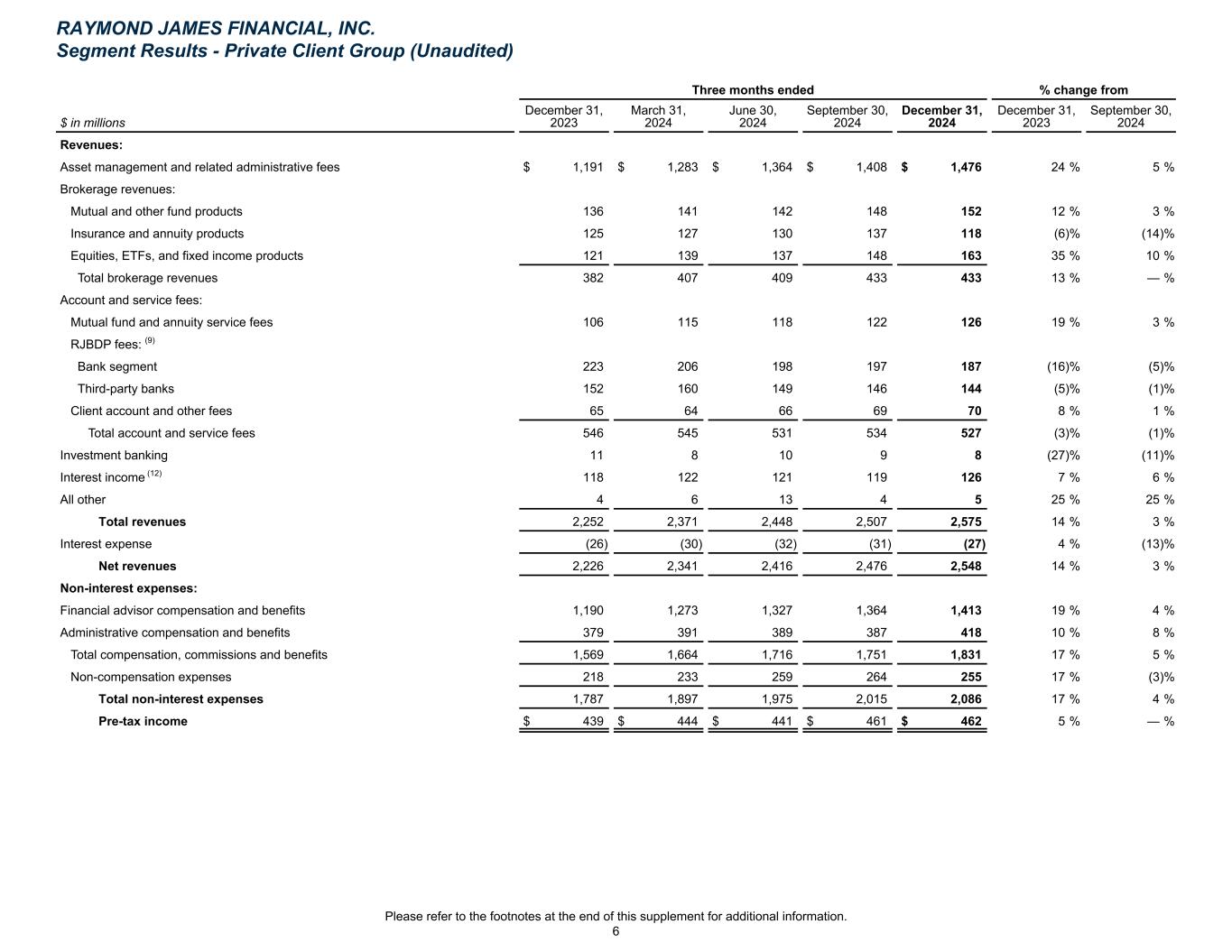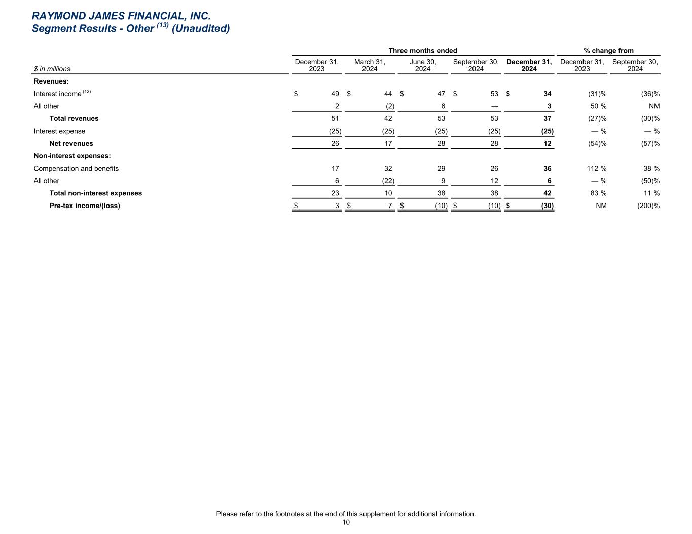 | (16) | The Other segment includes interest income on certain corporate cash balances, the results of our private equity investments, which predominantly consist of investments in third-party funds, certain other corporate investing activity, and certain corporate overhead costs of RJF that are not allocated to other segments including the interest costs on our public debt, certain provisions for legal and regulatory matters, and certain acquisition-related expenses. |