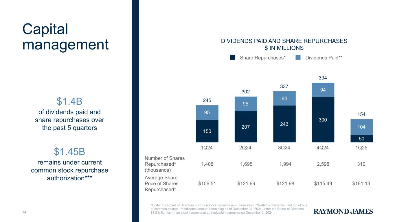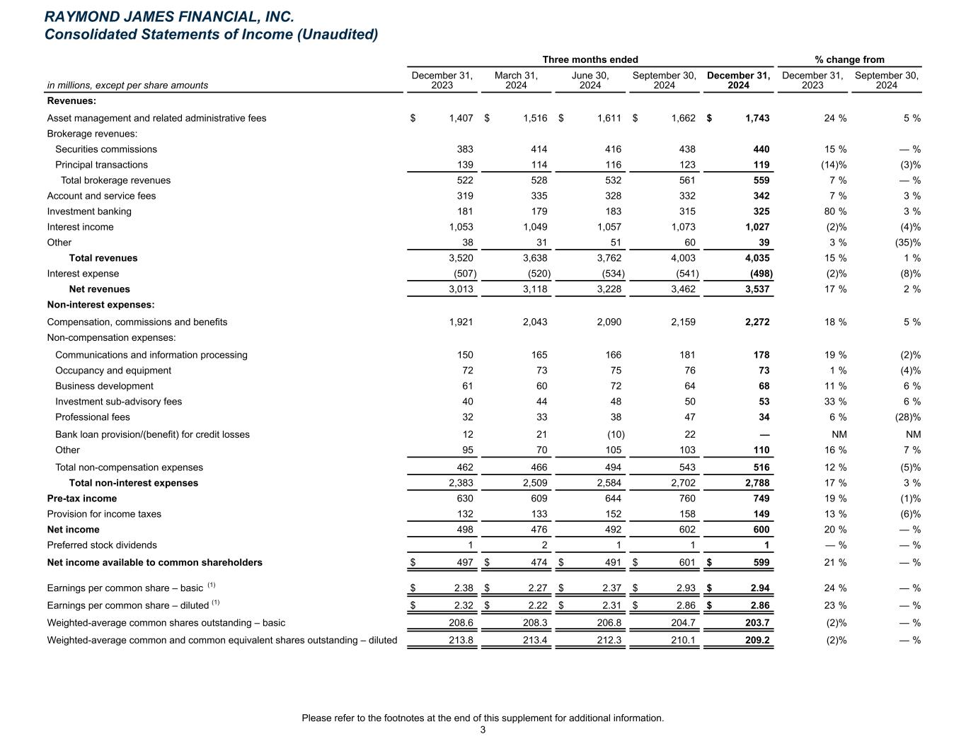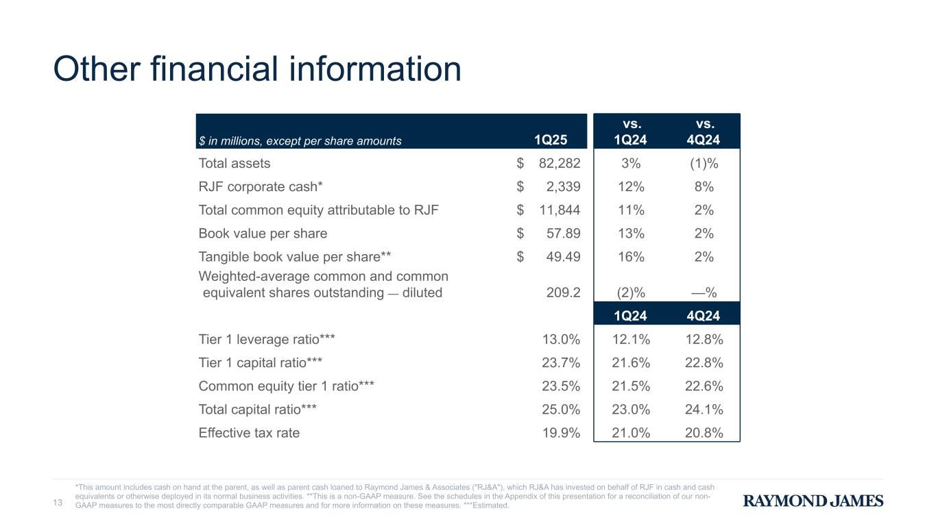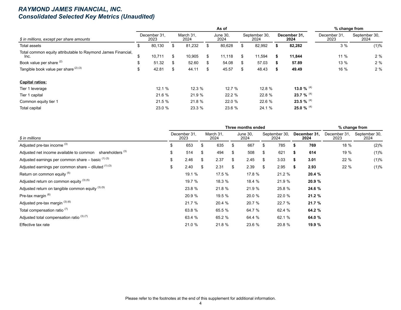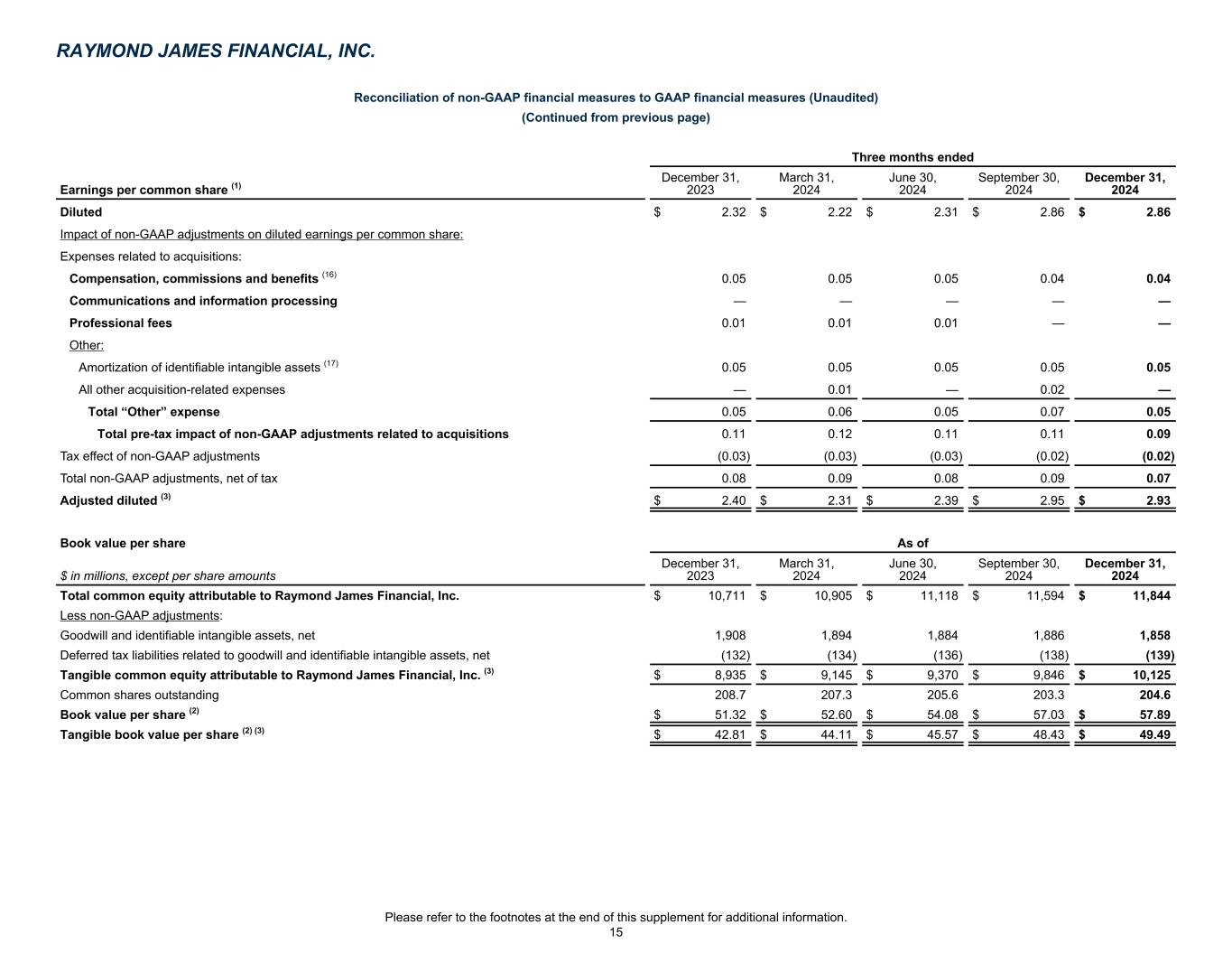 | (8) | Book value per share is computed by dividing total common equity attributable to Raymond James Financial, Inc. by the number of common shares outstanding at the end of each respective period or, in the case of tangible book value per share, computed by dividing tangible common equity by the number of common shares outstanding at the end of each respective period. | |||||||