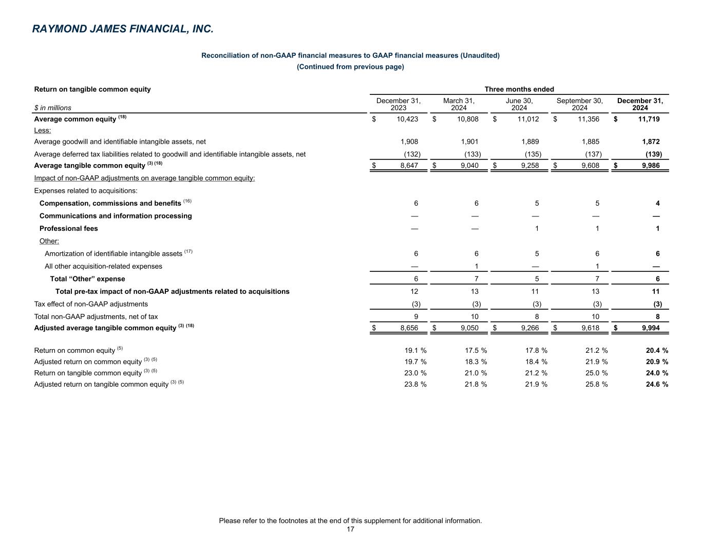 | (5) | Return on common equity is computed by dividing annualized net income available to common shareholders by average common equity for each respective period or, in the case of return on tangible common equity, computed by dividing annualized net income available to common shareholders by average tangible common equity for each respective period. Adjusted return on common equity is computed by dividing annualized adjusted net income available to common shareholders by adjusted average common equity for each respective period, or in the case of adjusted return on tangible common equity, computed by dividing annualized adjusted net income available to common shareholders by adjusted average tangible common equity for each respective period. Tangible common equity is defined as total common equity attributable to Raymond James Financial, Inc. less goodwill and identifiable intangible assets, net of related deferred taxes. | |||||||