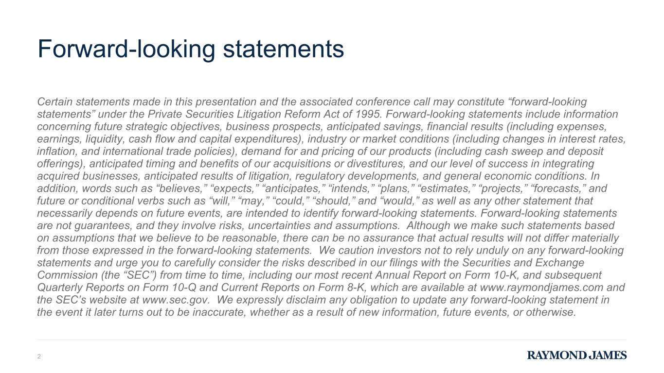 本プレスリリースに記載されている一部の記述は、1995年米国私募証券訴訟改革法(Private Securities Litigation Reform Act of 1995)に基づく「将来の見通しに関する記述」に該当する可能性があります。将来の見通しに関する記述には、将来の戦略目標、事業見通し、予想される貯蓄、業績(費用、収益、流動性、キャッシュフロー、資本支出を含む)、業界または市場の状況(金利、インフレ、国際貿易政策の変化を含む)、当行の商品(キャッシュ・スイープおよび預金募集を含む)の需要および価格設定、当行による買収の予想時期および利益、買収した事業の統合の成功度合い、訴訟の予想結果、規制当局の動向、一般的な経済状況に関する情報が含まれます。また、「予想される」などの言葉や、「だろう」、「かもしれない」、「かもしれない」、「はずだ」、「だろう」などの未来形または条件付きの動詞、さらに将来の事象に必然的に依存するその他の記述は、将来の見通しに関する記述を識別するためのものです。将来予想に関する記述は保証ではなく、リスク、不確実性、仮定を伴います。当社は合理的と思われる仮定に基づいてこのような記述を行っていますが、実際の結果が将来の見通しに関する記述に示されたものと大きく異なるという保証はありません。当社は、投資家の皆様が将来の見通しに関する記述に過度に依存しないよう注意し、当社の最新の年次報告書(フォーム10-K)、その後の四半期報告書(フォーム10-Q)および最新報告書(フォーム8-K)(www.raymondjames.comおよびSECのウェブサイトwww.sec.gov)を含め、適宜SEC(米国証券取引委員会)に提出する書類に記載されているリスクを慎重に検討されるようお勧めします。当社は、新たな情報、将来の出来事、その他の結果にかかわらず、将来予想に関する記述が後に不正確であることが判明した場合、その記述を更新する義務を明示的に否認します。
