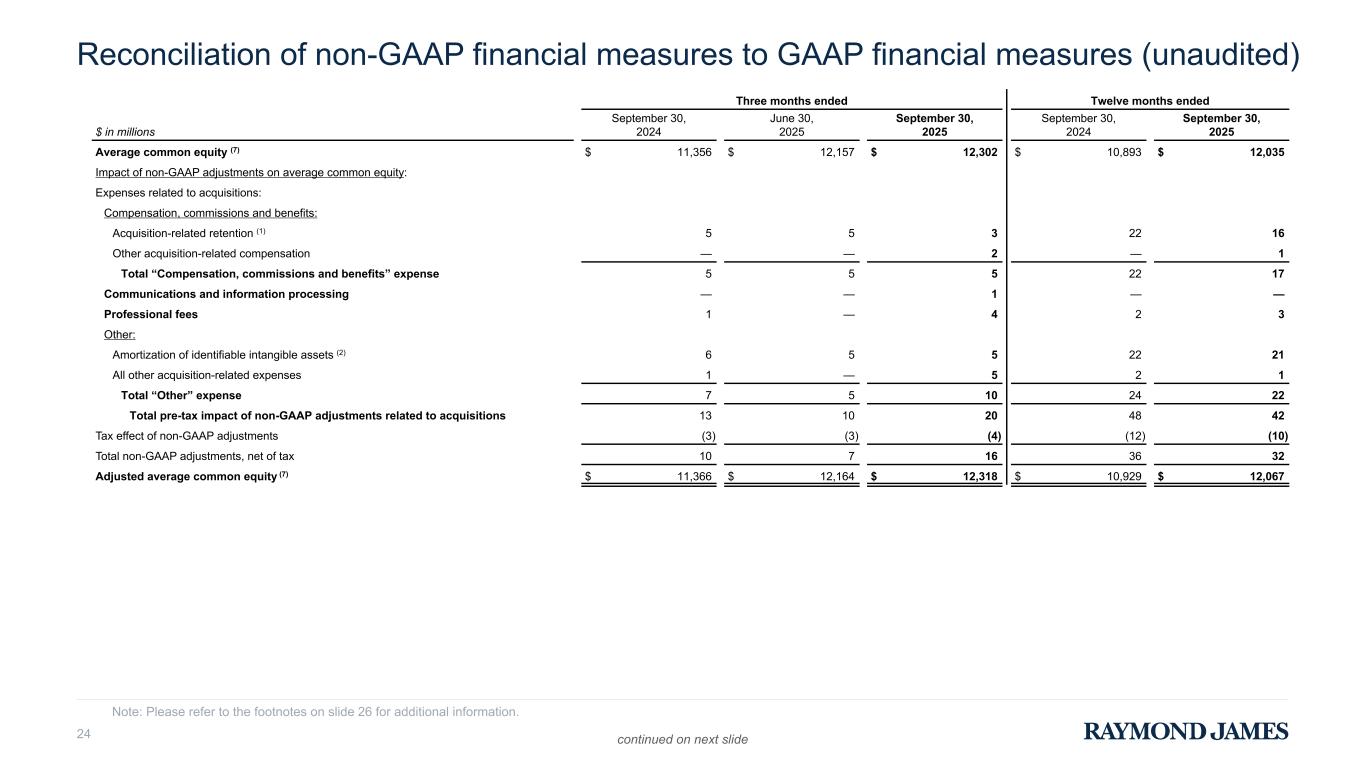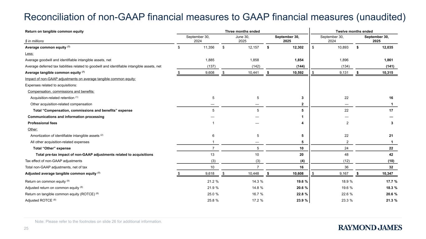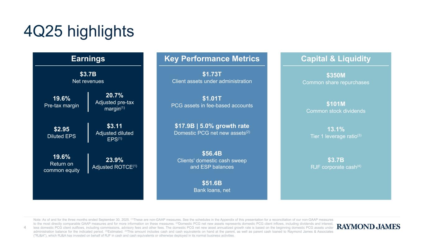 セントピーターズバーグレイモンド・ジェームズ・ファイナンシャル(NYSE: RJF)は本日、2025年9月30日に終了した第4四半期の純収入37億3,000万ドル、普通株主に帰属する当期純利益6億300万ドル(希薄化後1株当たり2.95ドル)を計上しました。買収関連費用3,900万ドルを除くと、普通株主に帰属する調整後純利益は6億3,500万ドル(1)、希薄化後1株当たり3.11ドル(1)となりました。