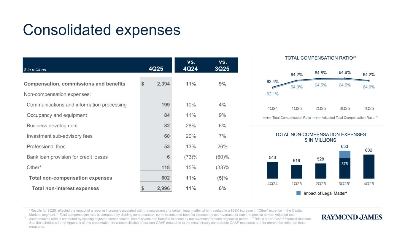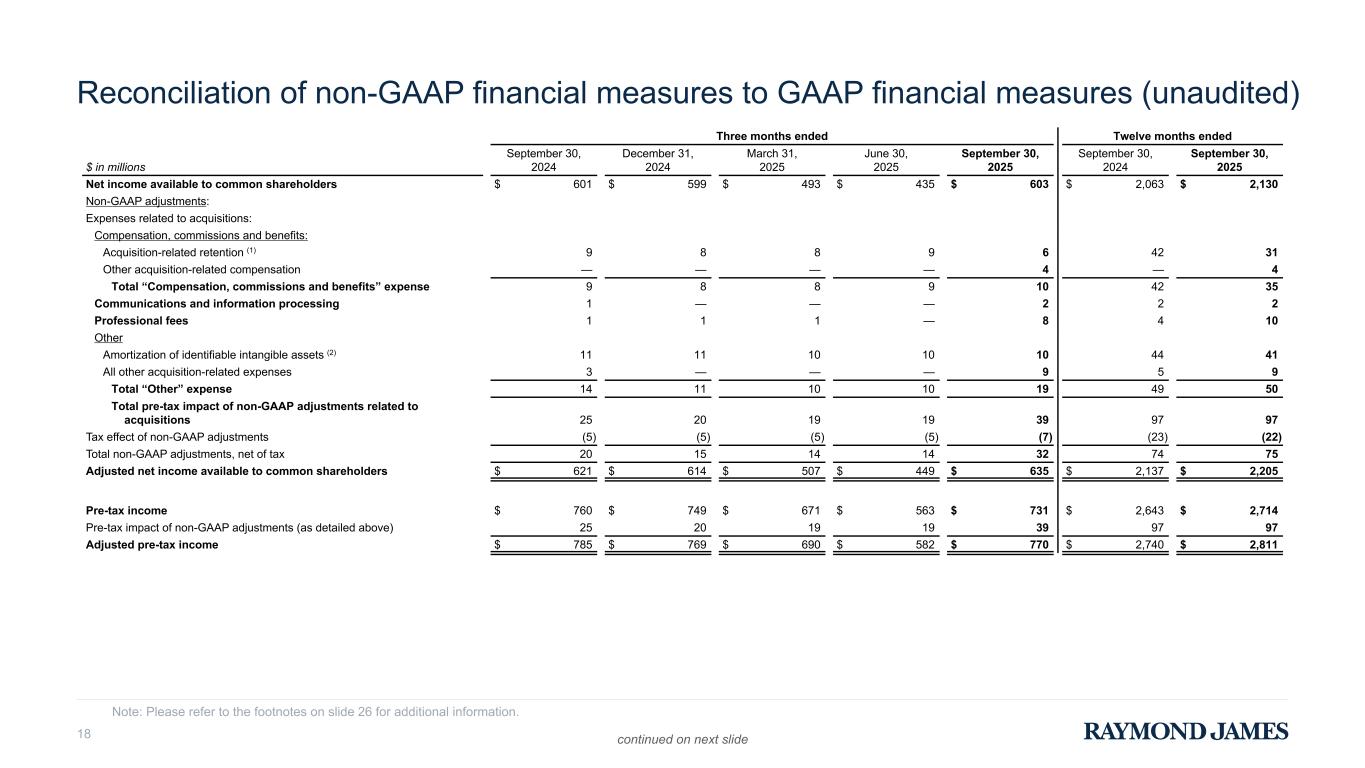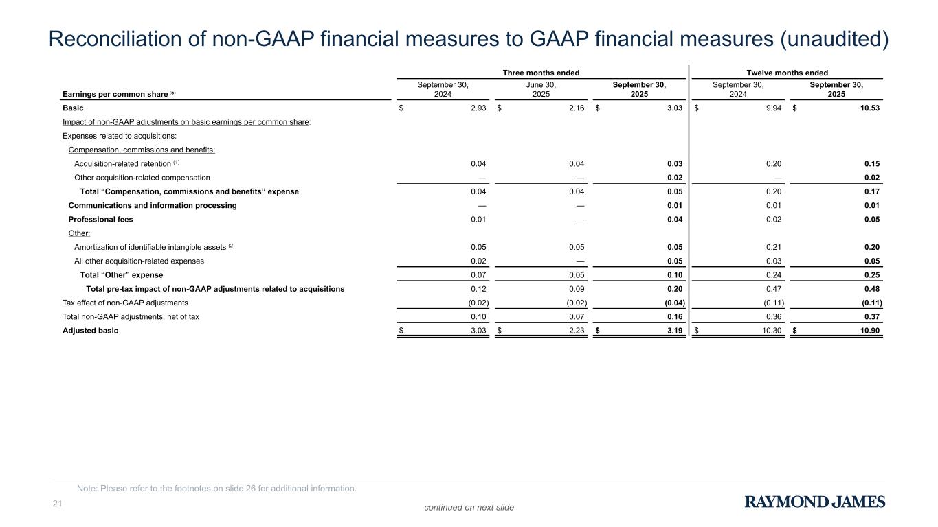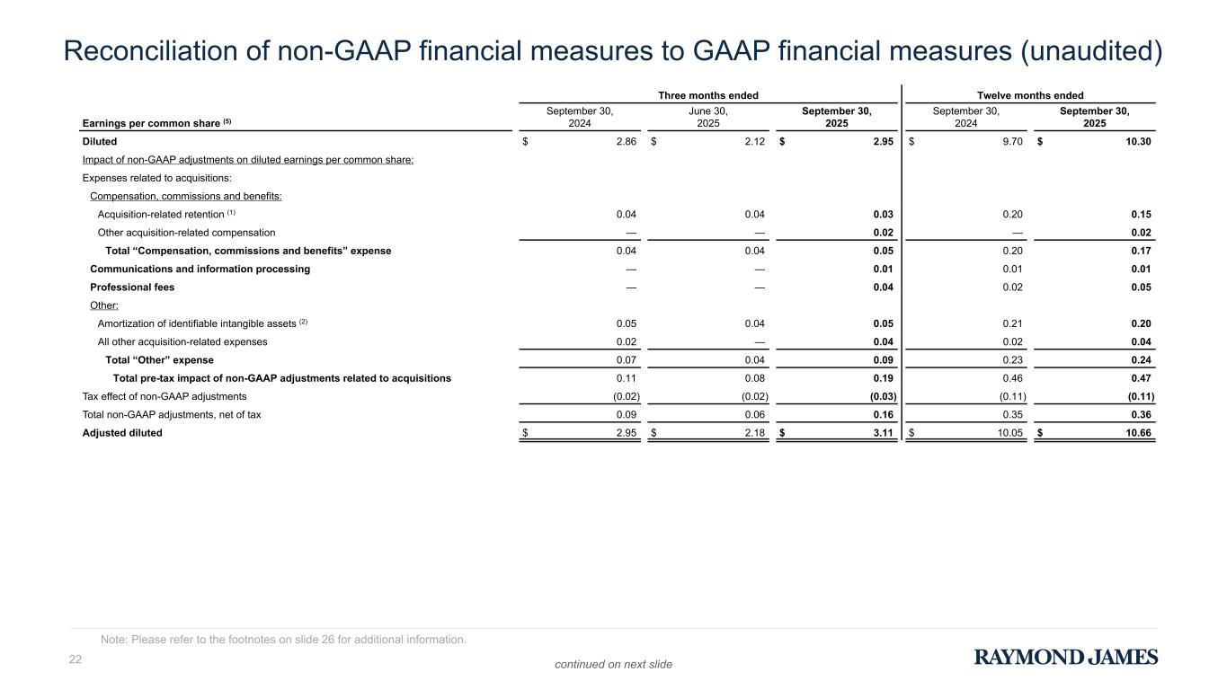 セントピーターズバーグレイモンド・ジェームズ・ファイナンシャル(NYSE: RJF)は本日、2025年9月30日に終了した第4四半期の純収入37億3,000万ドル、普通株主に帰属する当期純利益6億300万ドル(希薄化後1株当たり2.95ドル)を計上しました。買収関連費用3,900万ドルを除くと、普通株主に帰属する調整後純利益は6億3,500万ドル(1)、希薄化後1株当たり3.11ドル(1)となりました。