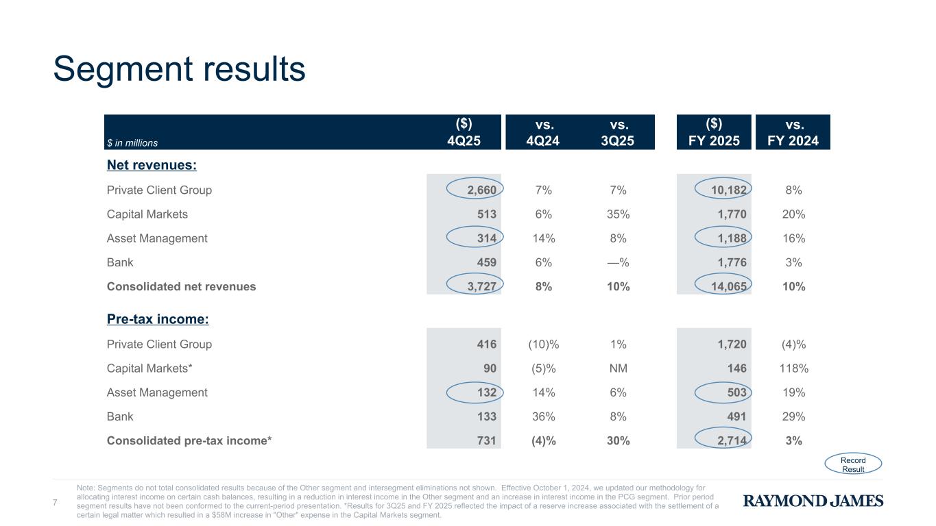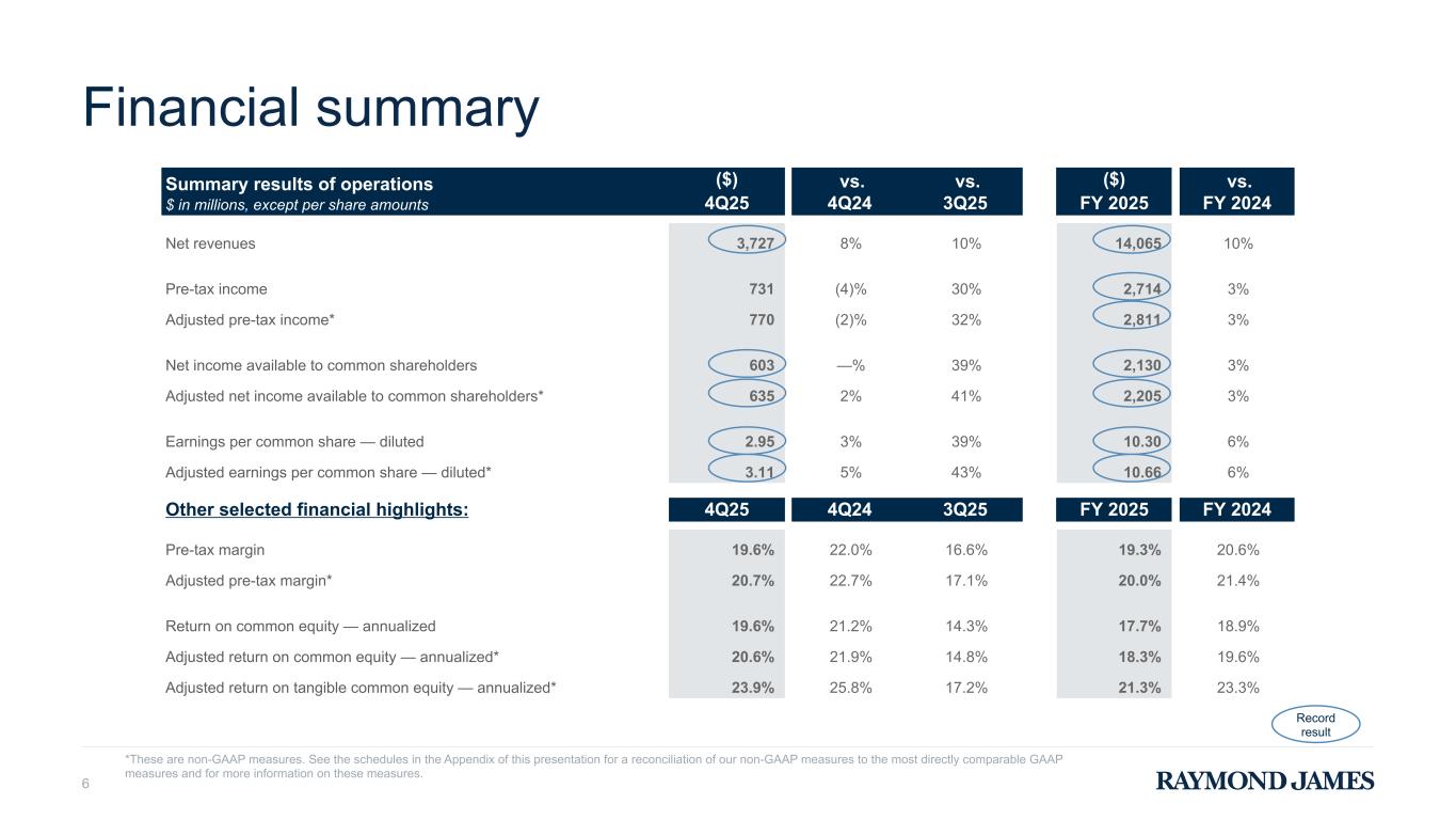 「ポール・シュクリ最高経営責任者(CEO)は「ファイナンシャル・アドバイザー、バンカー、アソシエイトが常に顧客第一主義に徹し、揺るぎないコミットメントを示したことが、2025年第4四半期および会計年度において、過去最高の純収入と過去最高の純利益を達成することにつながりました。「市場環境が大きく異なる中、5年連続で過去最高の年間業績を達成したことは、多様で相互補完的な事業を通じて深い人間関係を築き、長期的に持続可能な成長を実現することに一貫して注力してきたことを示すものです。2025年度のファイナンシャル・アドバイザーのリクルート実績が過去最高を記録したことは、当社独自のサービス第一の企業文化、包括的な能力、そして強固なバランスシートの証です。"