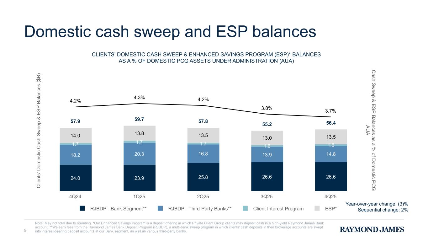 -顧客の国内キャッシュ・スイープおよび強化貯蓄プログラムの総残高は564億ドルで、前年同期比3%減少、前四半期比では2%増加した。
