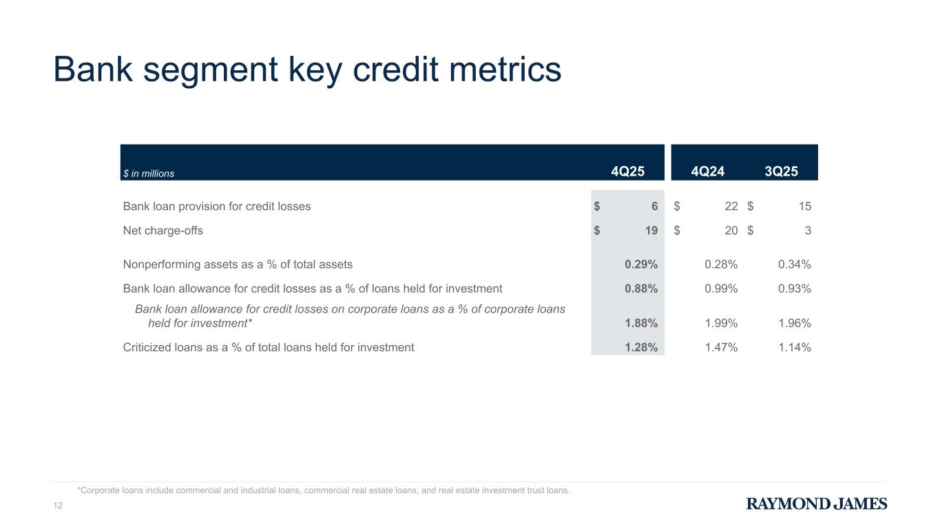 通期では、記録的な純収益140億7,000万ドルで2024年度比10%増、記録的な希薄化後1株当たり利益10.30ドルおよび記録的な調整後希薄化後1株当たり利益10.66ドル(1)でそれぞれ6%増となった。プライベート・クライアント・グループは過去最高の純収入を計上し、アセット・マネジメント部門は2025年度に過去最高の純収入と税引前利益を計上した。2025年度の株主資本利益率は17.7%、調整後有形株主資本利益率は21.3%(1)であった。