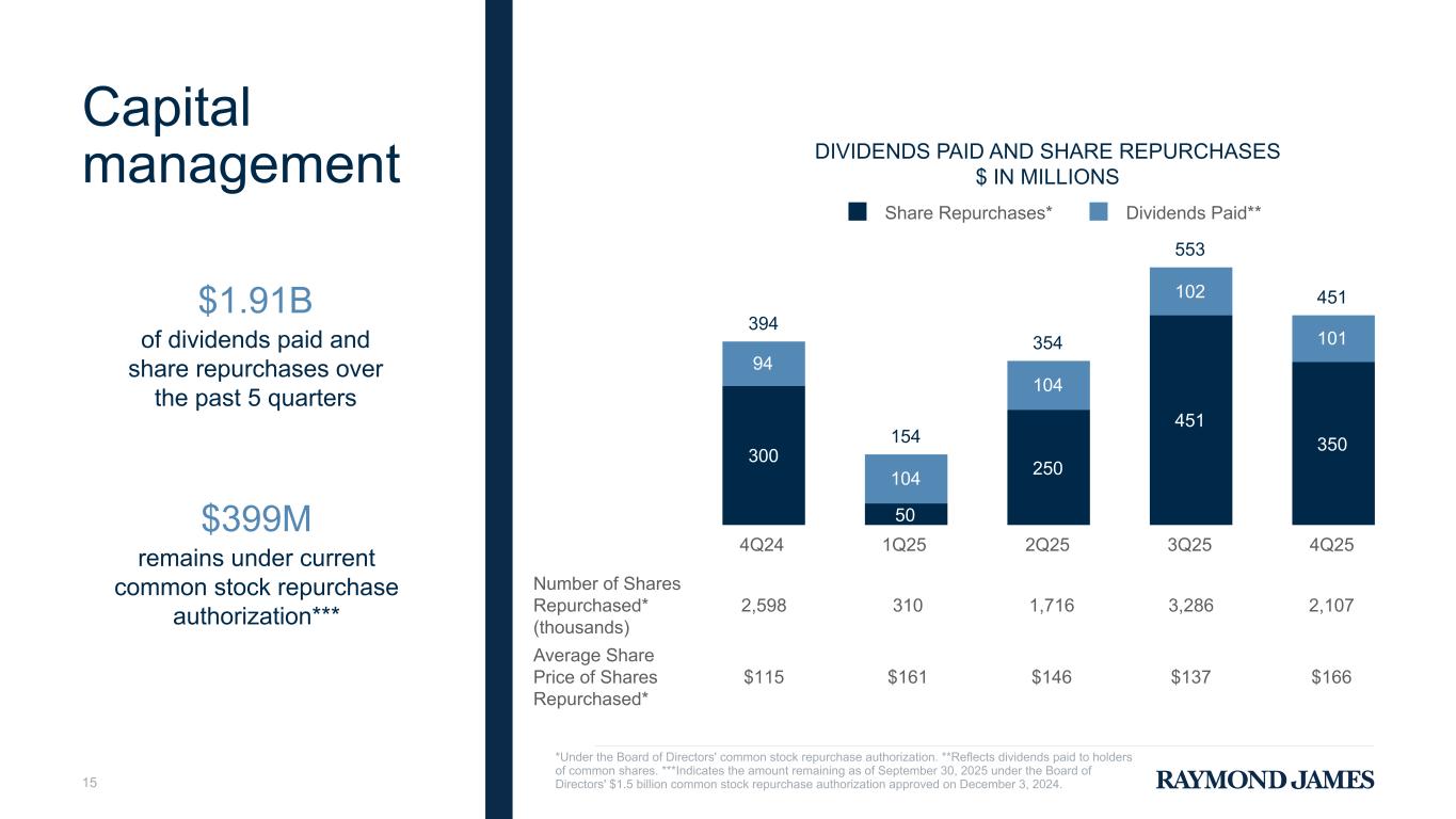 第4四半期中、当社は普通株式3億5,000万ドルを1株当たり平均価格166ドルで買い戻した。2025年9月30日現在、取締役会承認の普通株式買戻し枠は3億9900万ドル残っている。これとは別に、変動利付劣後債(元本総額9,800万ドル)を機動的に全額償還した。当四半期末時点の自己資本比率は24.1%(3) 、Tier1レバレッジ比率は13.1%(3) と、いずれも規制要件を大幅に上回った。