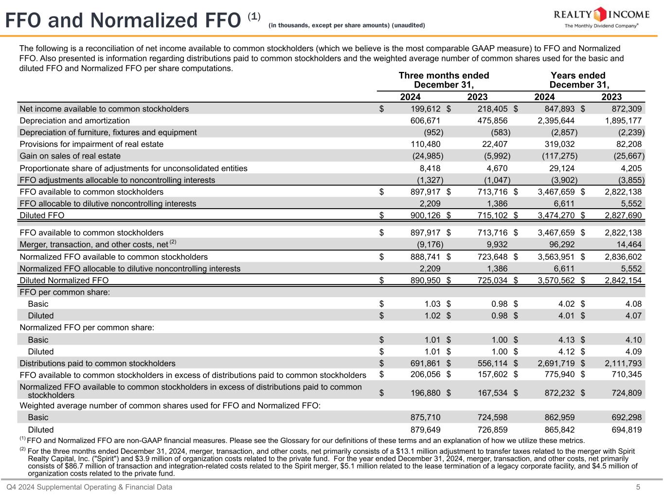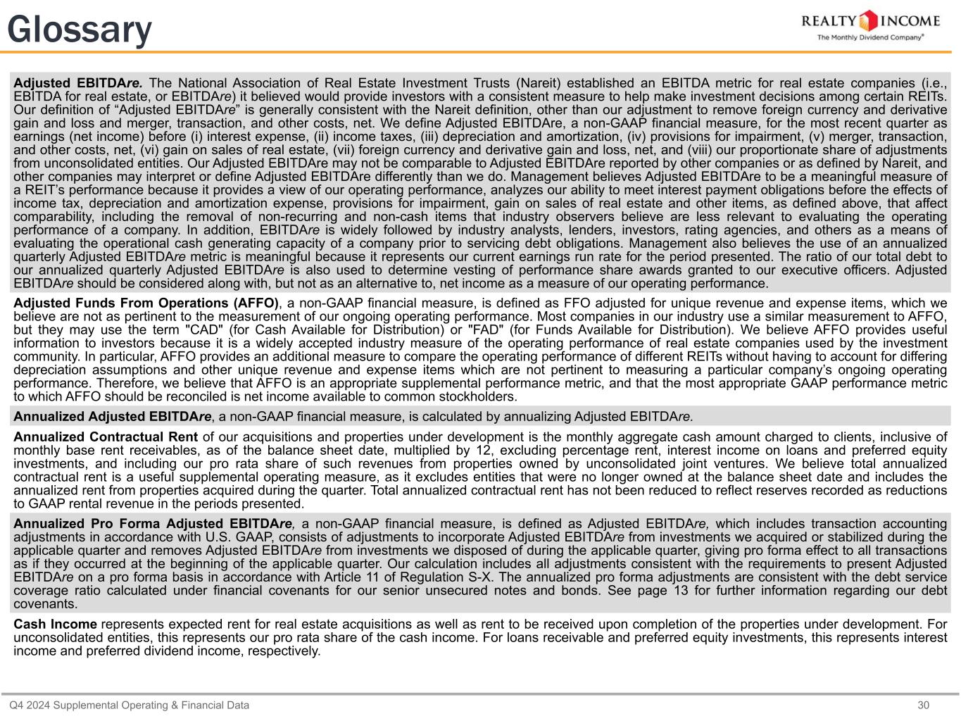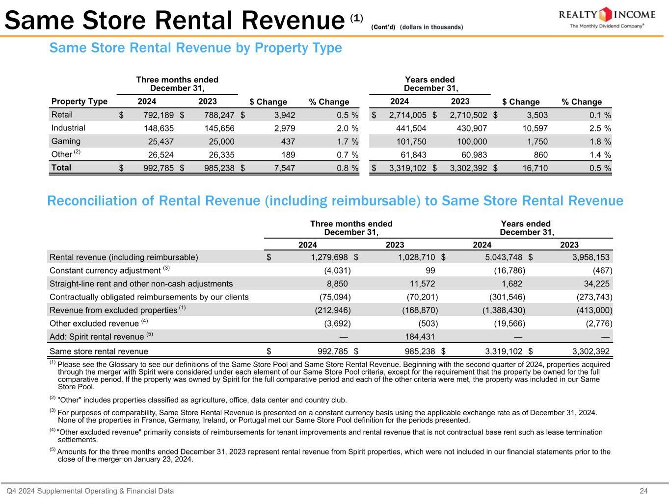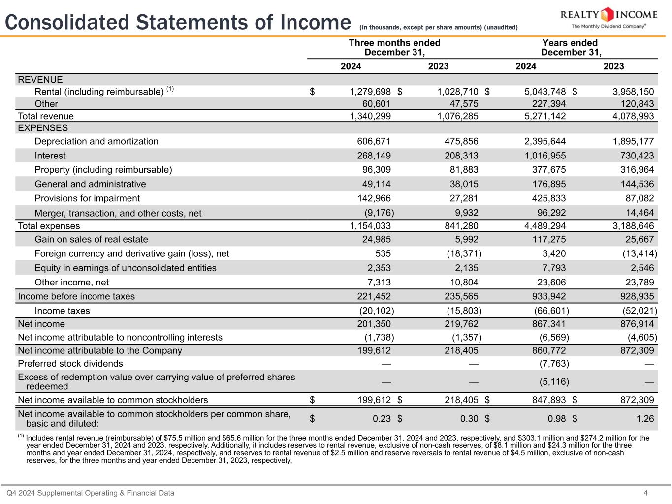 カリフォルニア州サンディエゴ、2025年2月24日...毎月配当会社®であるリアルティ・インカム・コーポレーション(リアルティ・インカム、NYSE:O)は本日、2024年12月31日に終了した3ヶ月間および年間の営業成績を発表しました。本プレスリリースに記載された一株当たり金額は、別段の記載がない限り、希薄化後普通株一株当たりベースです。