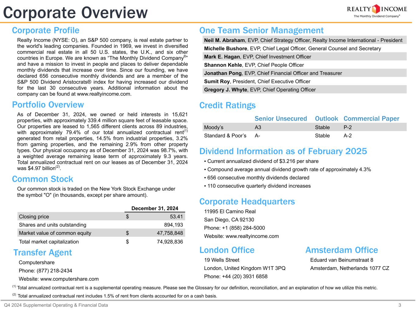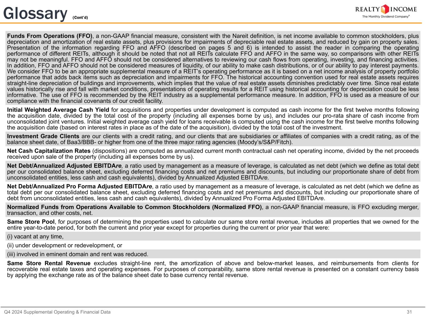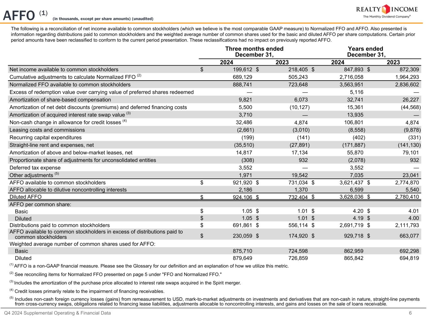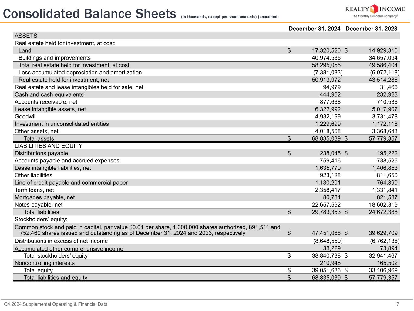 カリフォルニア州サンディエゴ、2025年2月24日...毎月配当会社®であるリアルティ・インカム・コーポレーション(リアルティ・インカム、NYSE:O)は本日、2024年12月31日に終了した3ヶ月間および年間の営業成績を発表しました。本プレスリリースに記載された一株当たり金額は、別段の記載がない限り、希薄化後普通株一株当たりベースです。