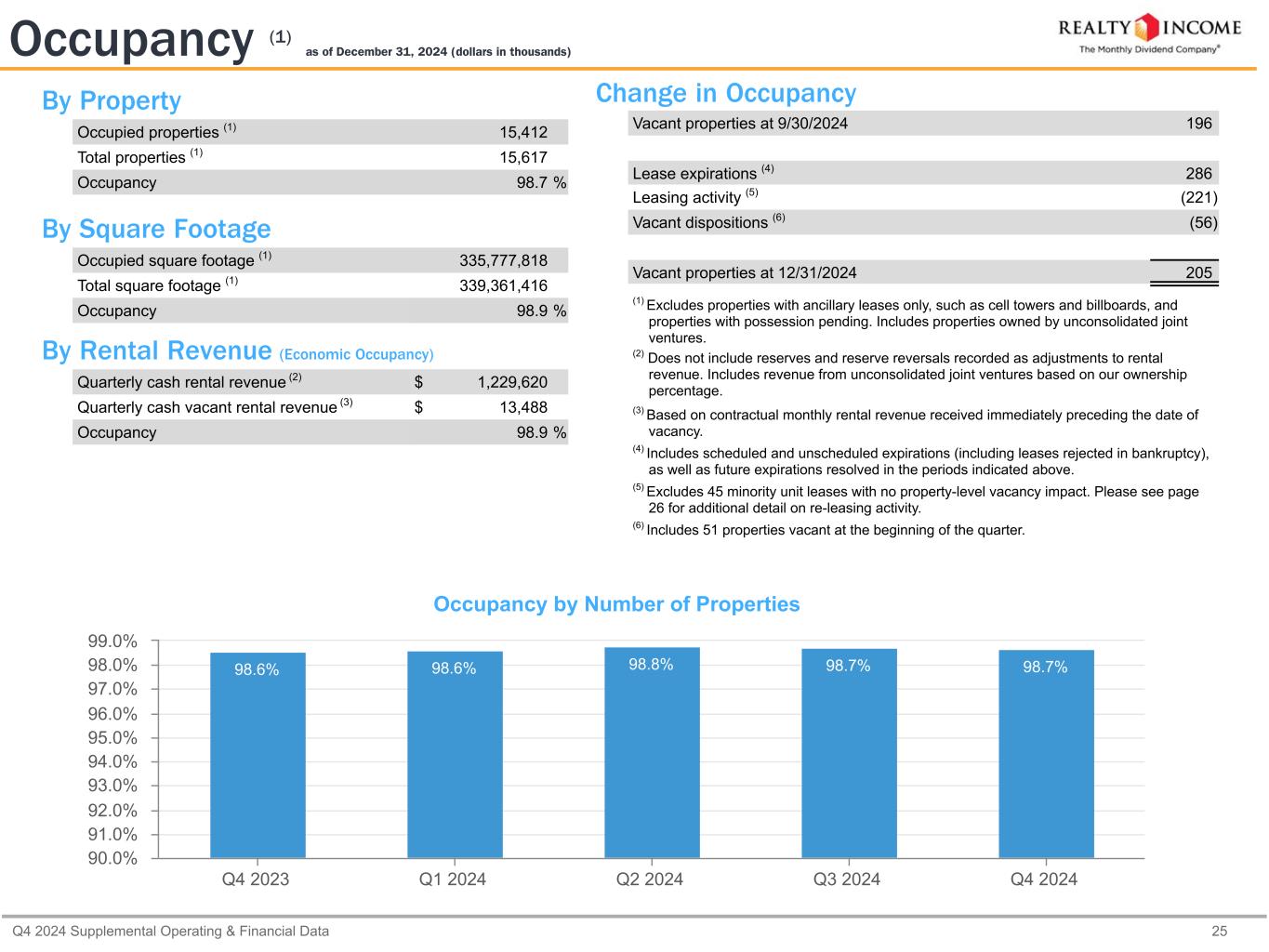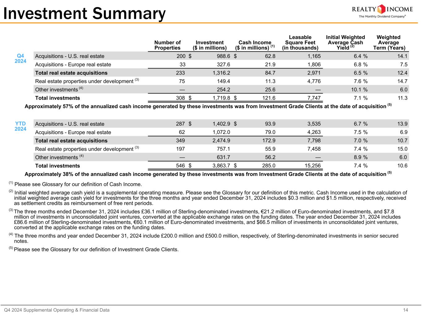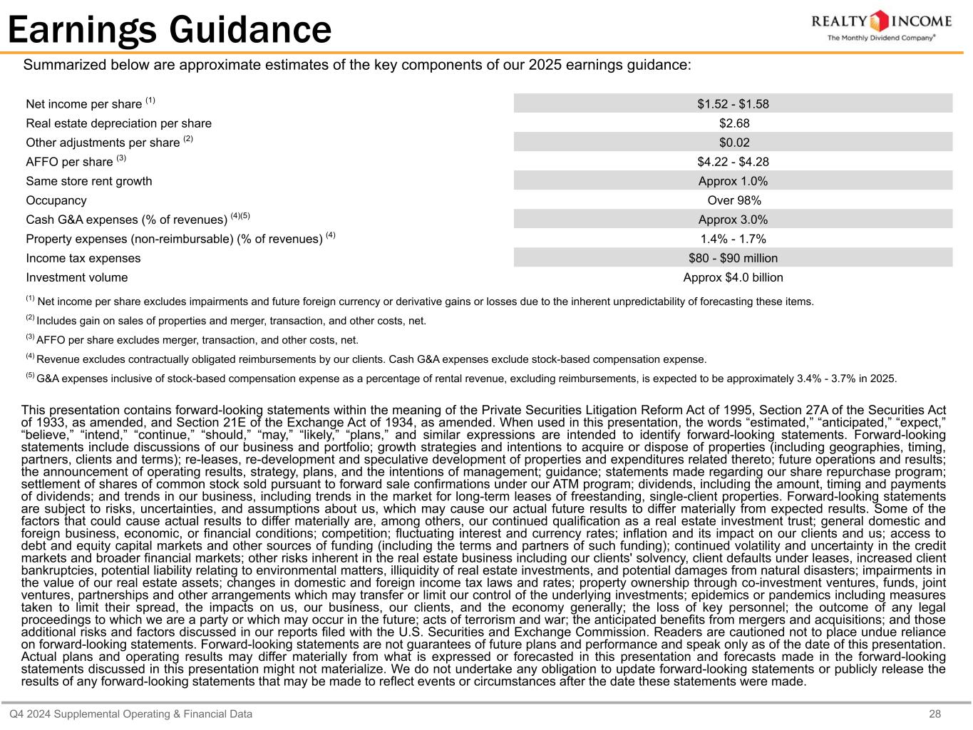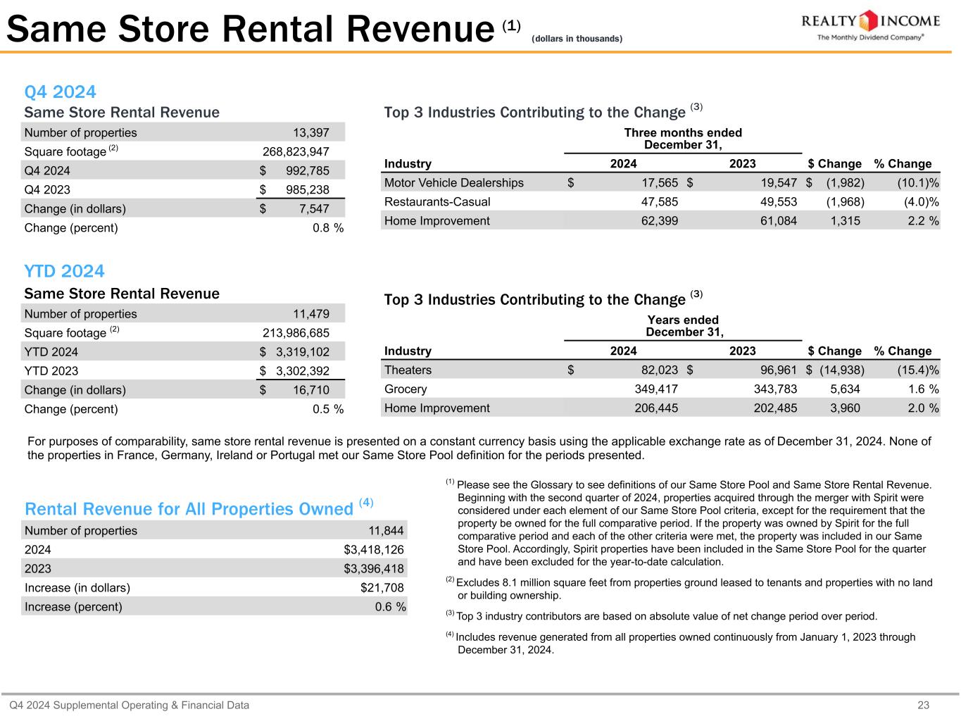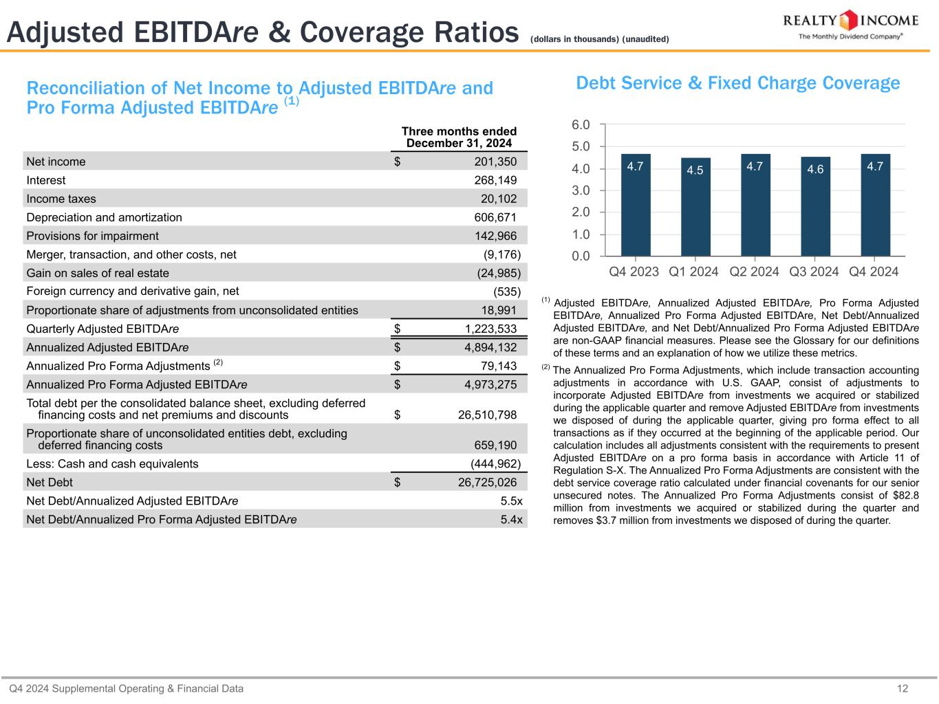 カリフォルニア州サンディエゴ、2025年2月24日...毎月配当会社®であるリアルティ・インカム・コーポレーション(リアルティ・インカム、NYSE:O)は本日、2024年12月31日に終了した3ヶ月間および年間の営業成績を発表しました。本プレスリリースに記載された一株当たり金額は、別段の記載がない限り、希薄化後普通株一株当たりベースです。
