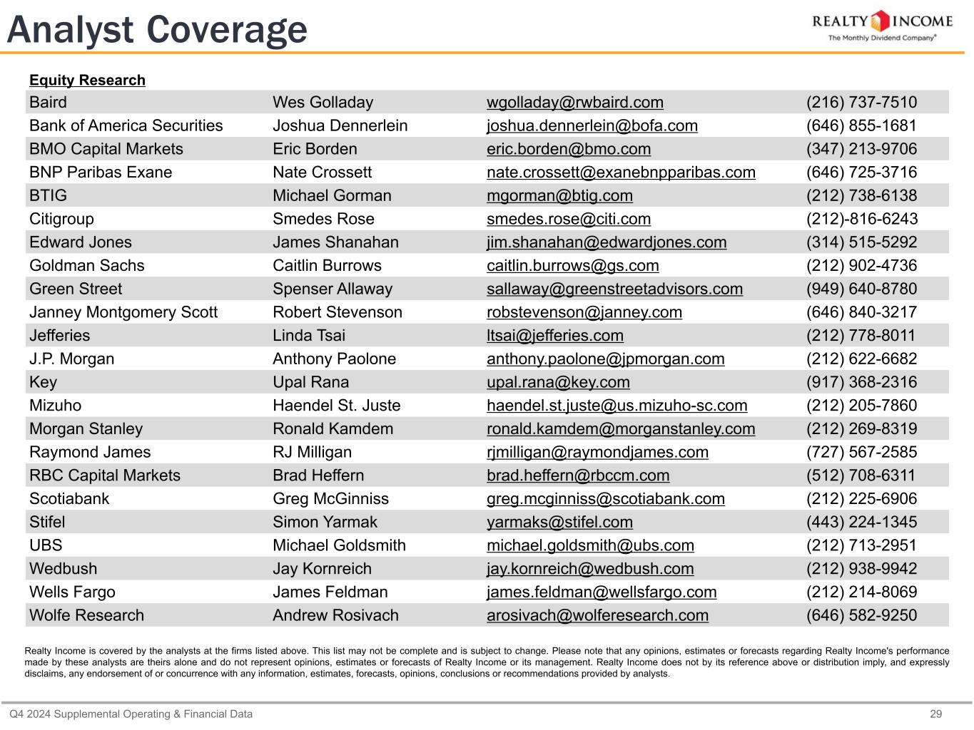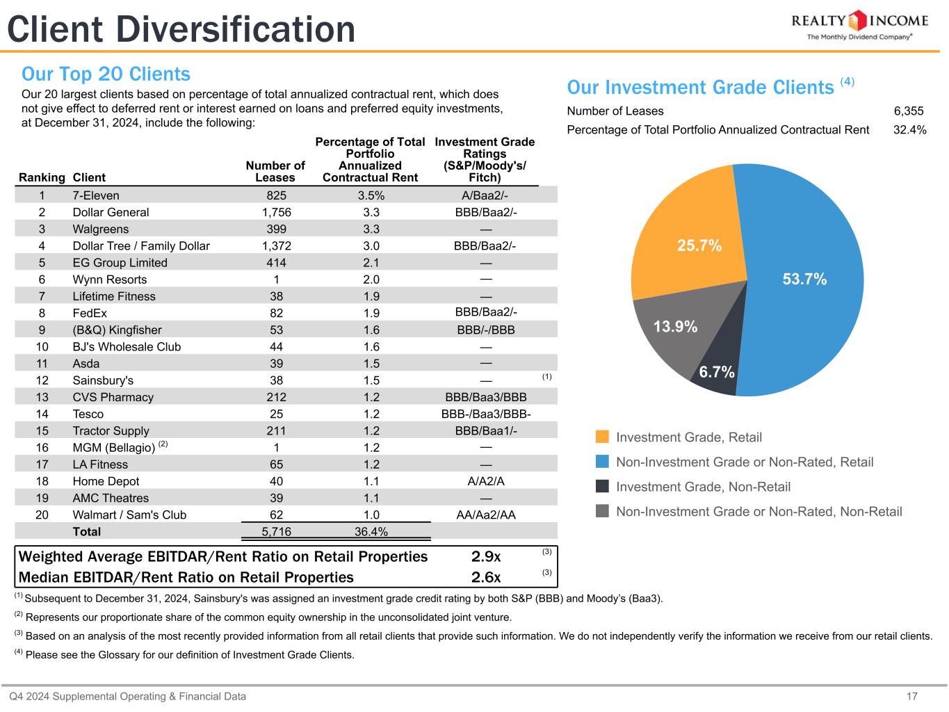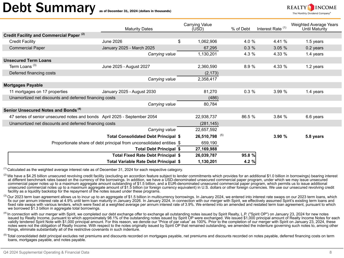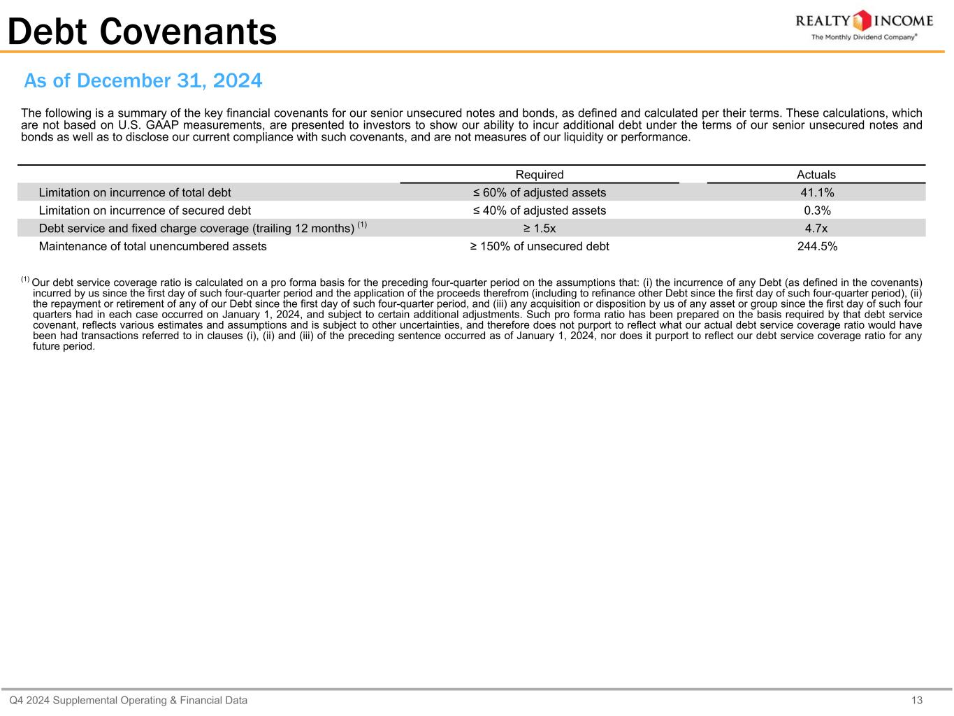 カリフォルニア州サンディエゴ、2025年2月24日...毎月配当会社®であるリアルティ・インカム・コーポレーション(リアルティ・インカム、NYSE:O)は本日、2024年12月31日に終了した3ヶ月間および年間の営業成績を発表しました。本プレスリリースに記載された一株当たり金額は、別段の記載がない限り、希薄化後普通株一株当たりベースです。