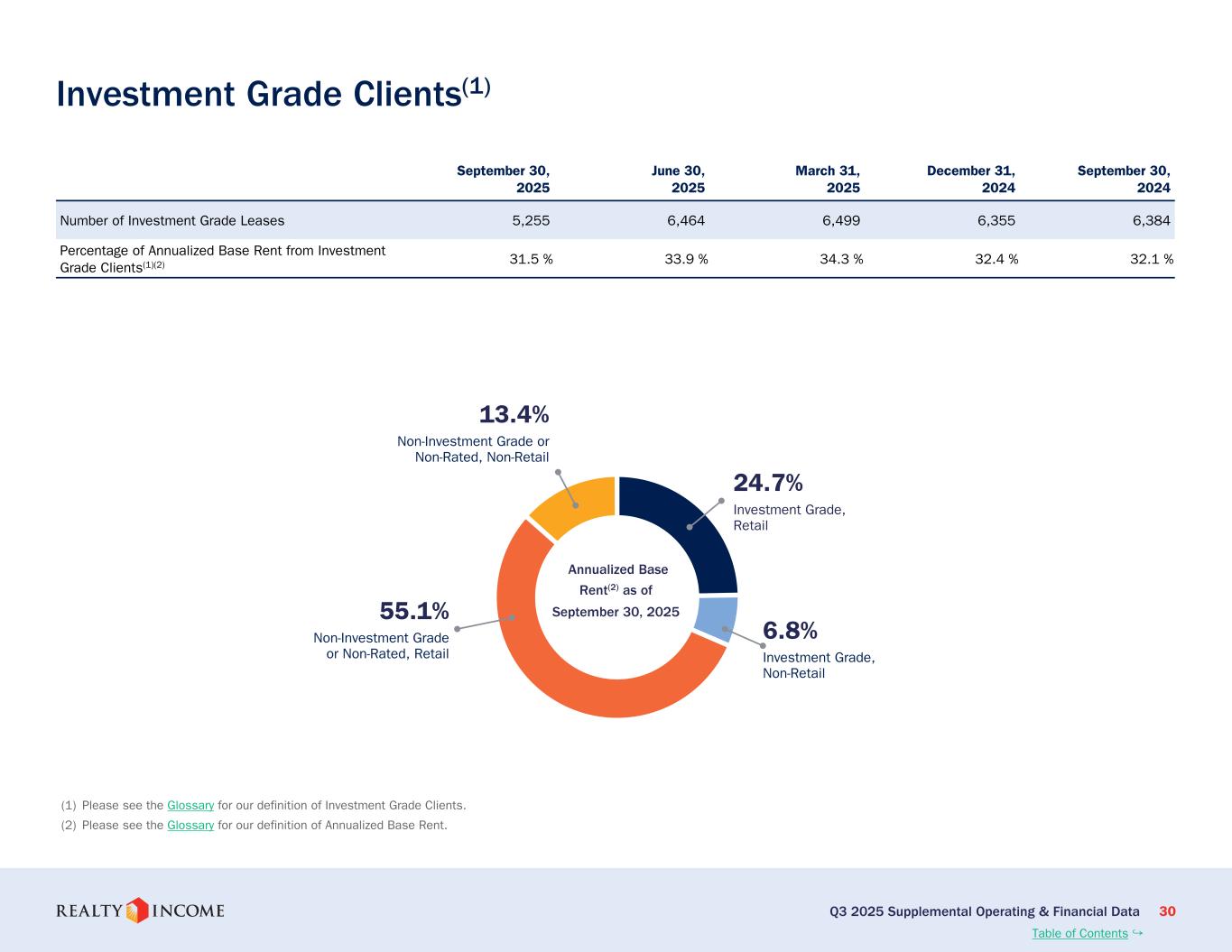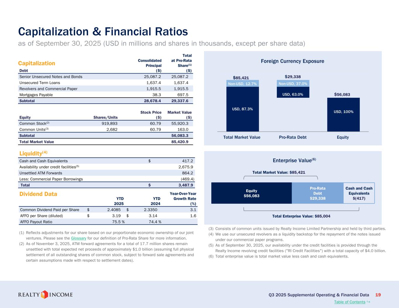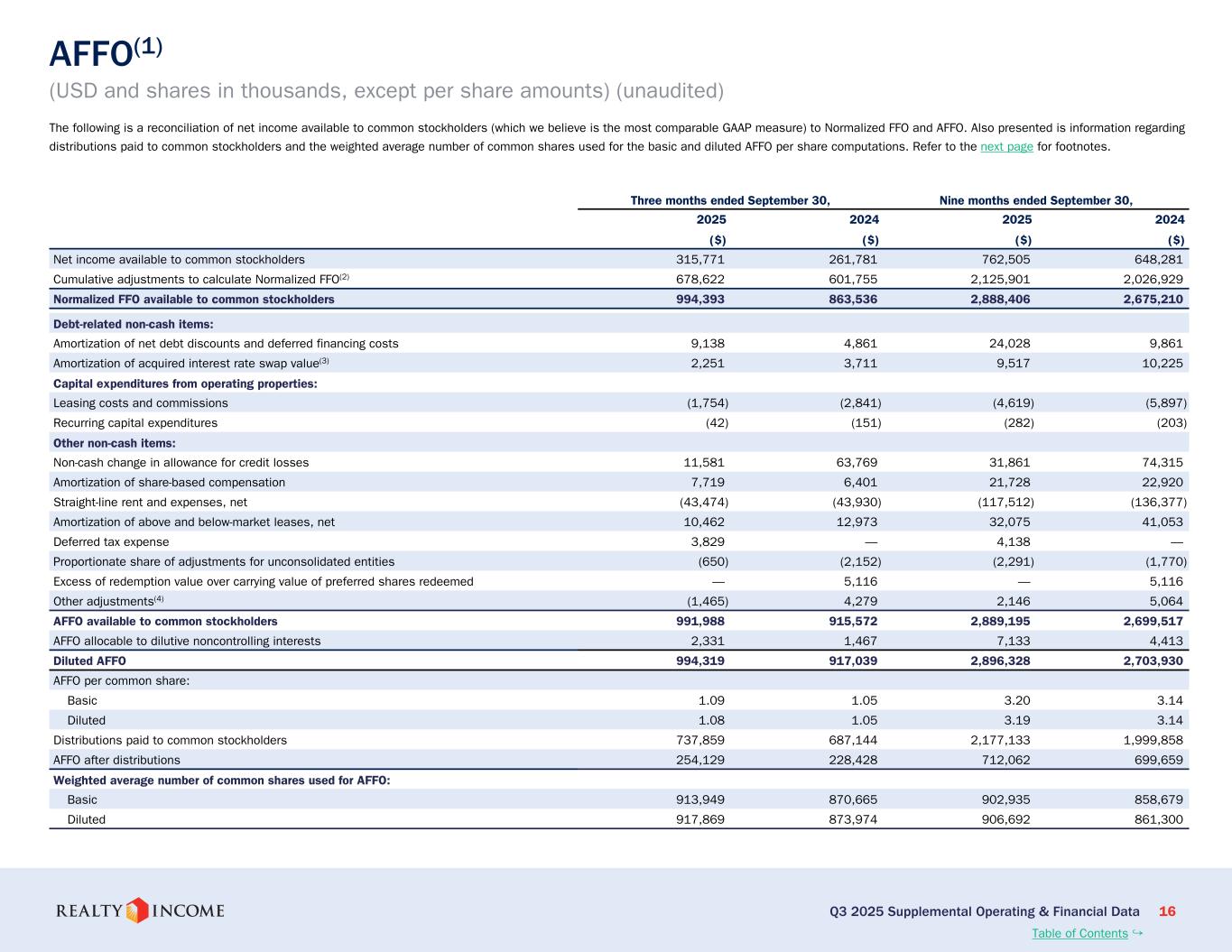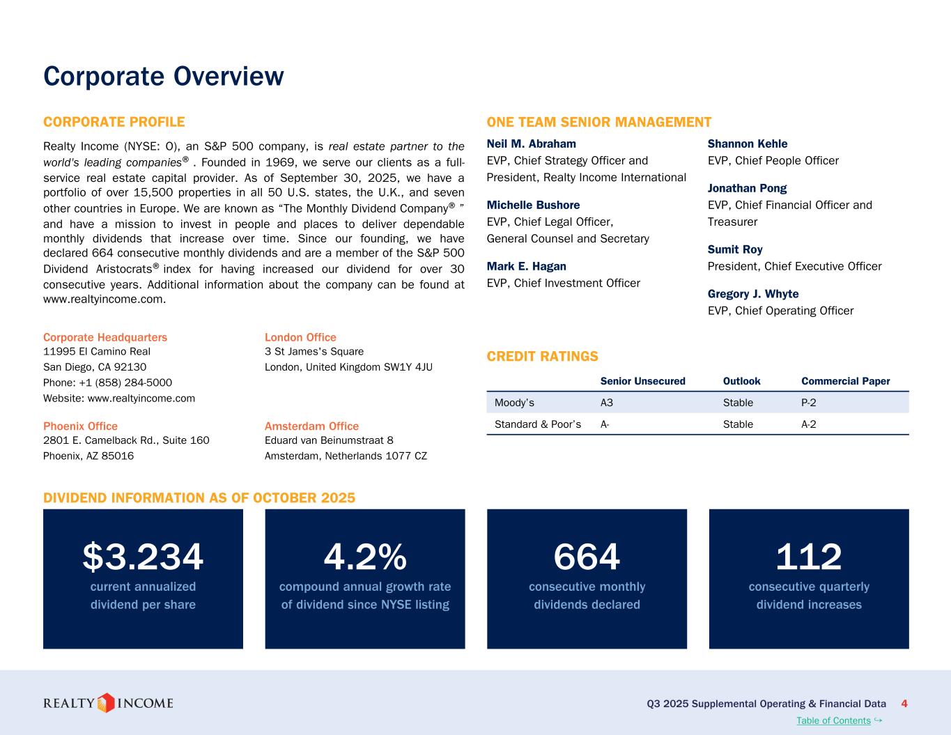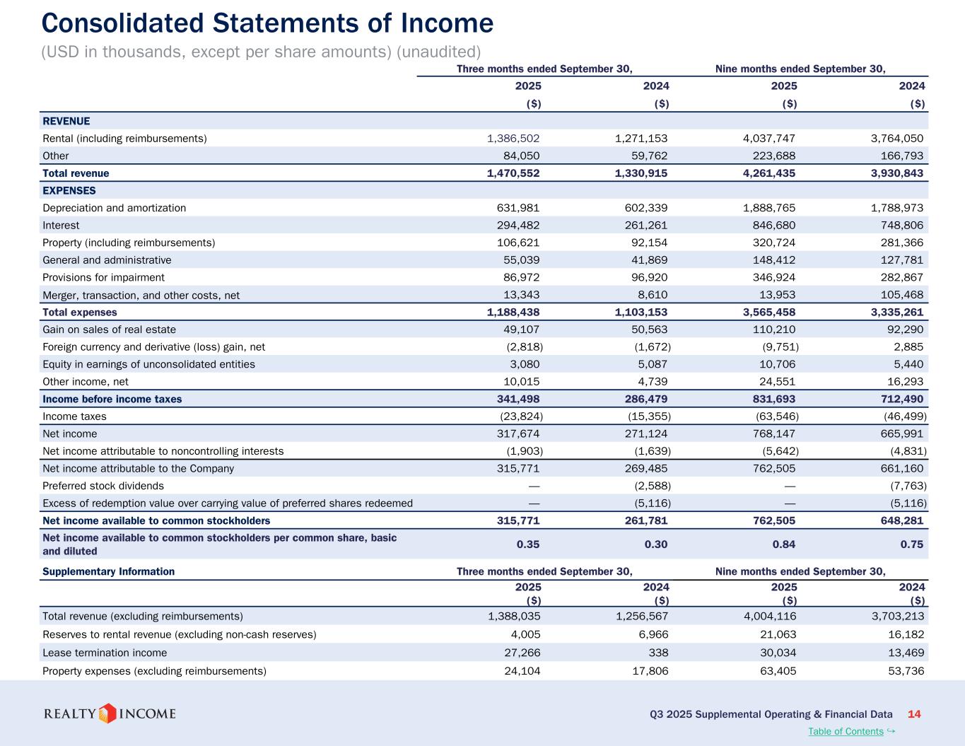 カリフォルニア州サンディエゴ、2025年11月3日...毎月配当会社®であるリアルティ・インカム・コーポレーション(リアルティ・インカム、NYSE:O)は本日、2025年9月30日に終了した3ヶ月間および9ヶ月間の営業成績を発表しました。このプレスリリースに示された一株当たりの金額はすべて、別段の記載がない限り、希薄化普通株一株当たりベースです。