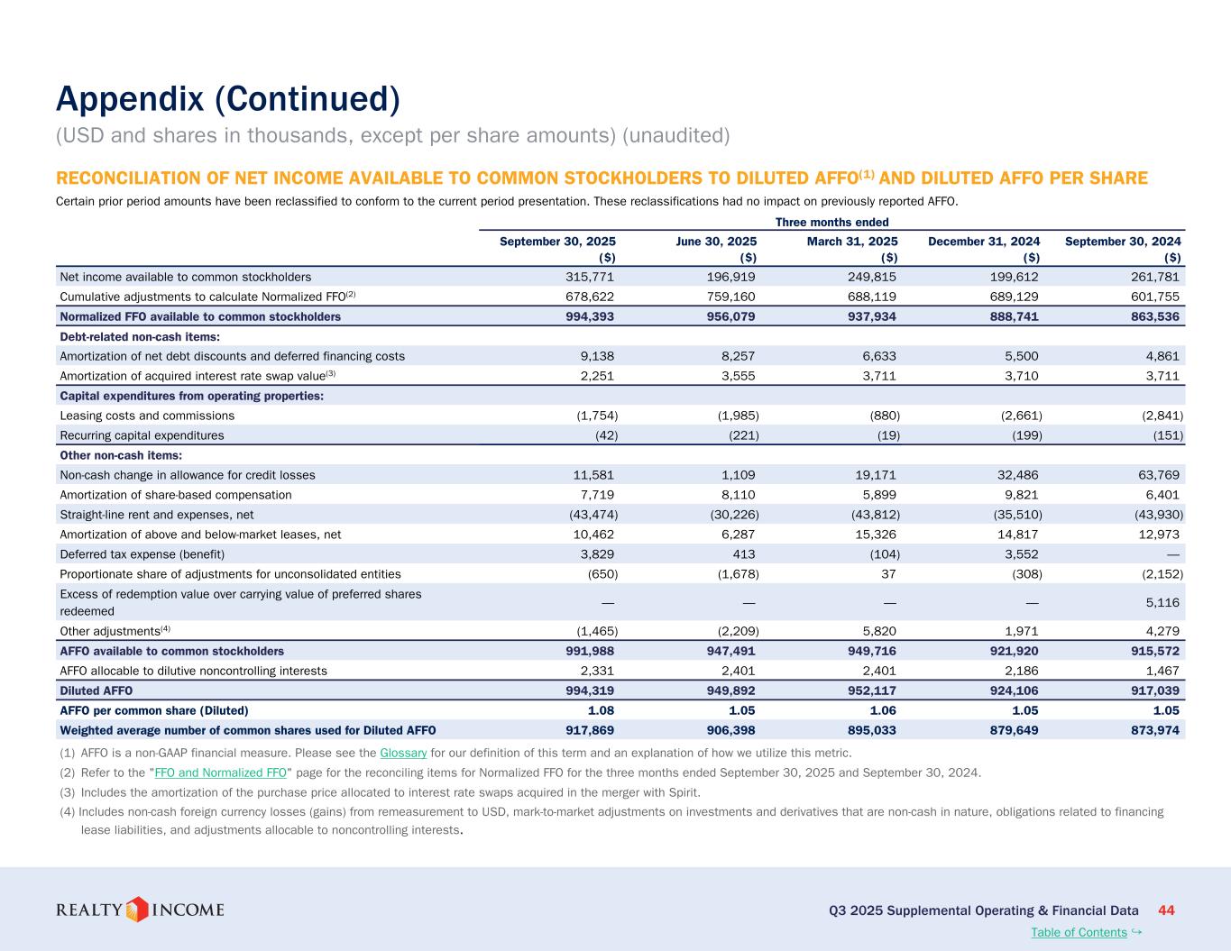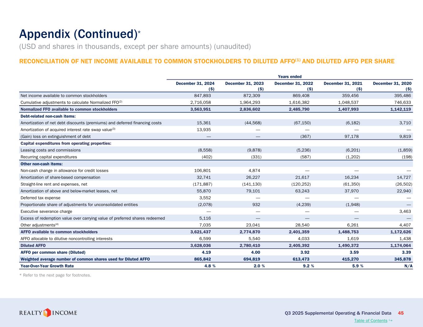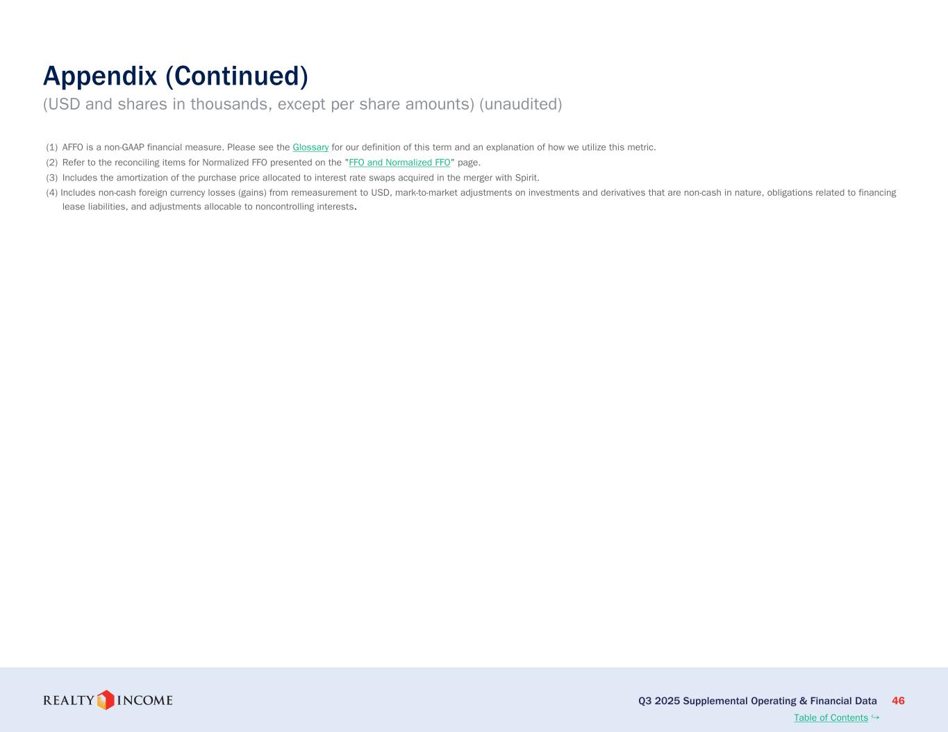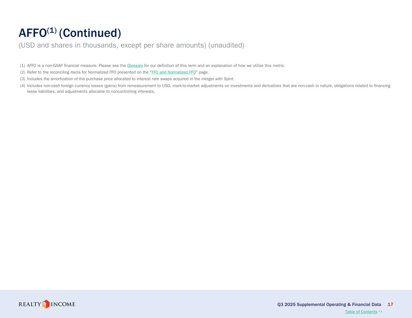 (3) FFO、ノーマライズドFFO、およびAFFOは非GAAPベースの財務指標である。正規化FFOはFFOに基づき、合併費用、取引費用、その他の費用(純額)を除外するよう調整したものであり、AFFOは正規化FFOを独自の収益・費用項目でさらに調整したものである。当社がこれらの指標をどのように利用しているかについては、用語集をご参照ください。最も直接的に比較できるGAAP指標との調整については、本書の10ページおよび11ページをご参照ください。