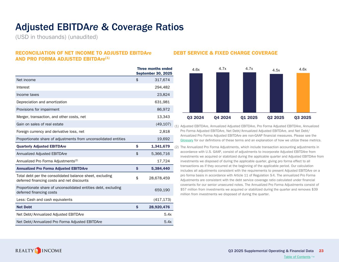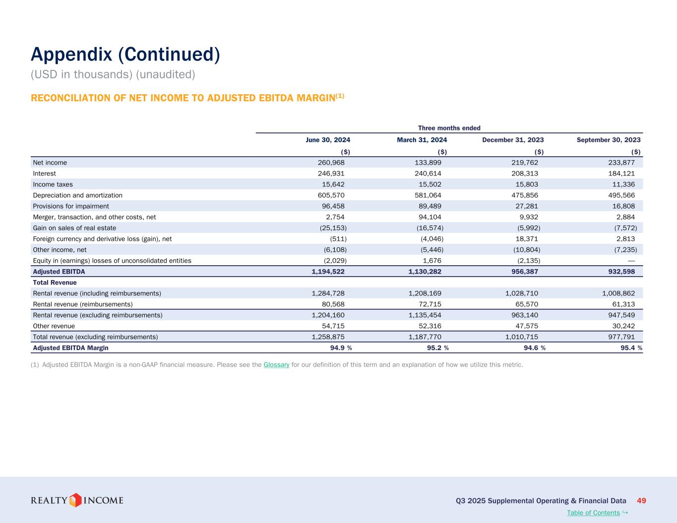 「と、リアルティ・インカムの社長兼最高経営責任者(CEO)、スミト・ロイは語りました。「多様なエクイティ・ソースへの拡大したアクセスと、地域にわたる有利な投資利回りにより、我々のプラットフォームは業界において差別化を示し続けています。欧州投資は引き続き当社の実行ボリュームの重要な部分を占めており、当四半期中に海外で約10億ドル、国内で3億8000万ドルがクローズされました。さらに、ポートフォリオの内部成長も堅調に推移している。再リースされた不動産の103.5%の家賃回収率は、リアルティ・インカムのデータ主導の資産管理プロセスと、当社のよく分散された不動産ポートフォリオの安定性の証です。"