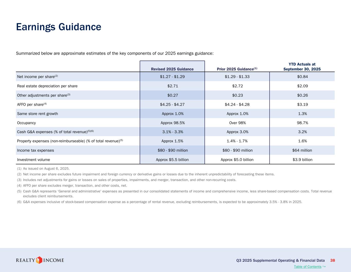 "我々のビジネスの勢いを考慮し、我々は2025年一株当たりAFFOガイダンスを4.25ドルから4.27ドルに更新し、2025年投資量ガイダンスを約55億ドルに更新します。2025年を総括し、将来を展望するとき、柔軟性はリアルティ・インカムの競争優位性であり続け、立地、物件タイプ、産業、あるいは資本源に関係なく拡大する態勢を整えています。"