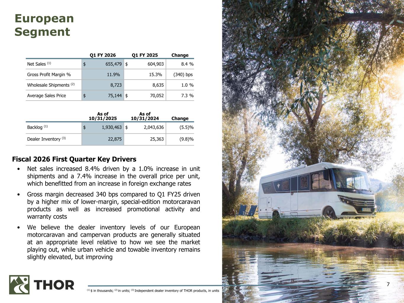 インディアナ州エルクハート、2025年12月3日 - THOR Industries, Inc. (NYSE: THO) は本日、2025年10月31日を期末とする2026年度第1四半期の業績を発表しました。