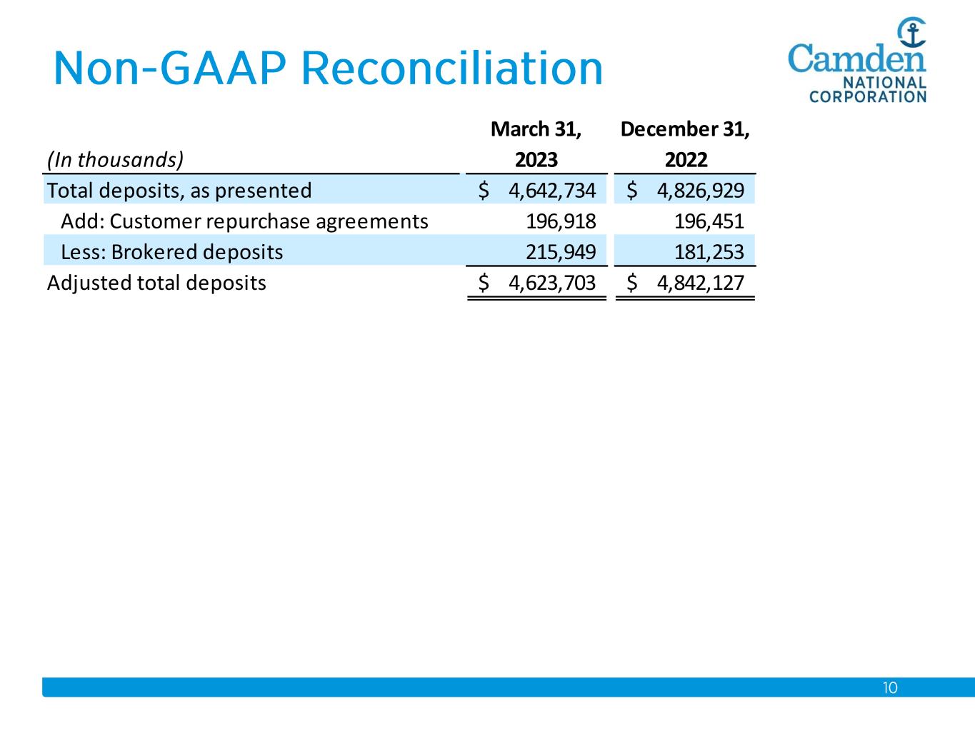 -ブローカー預金は、当社が2022年第4四半期に実施し、2023年第1四半期に再び活用した、金利がさらに上昇するリスクから資金の一部を保護し、コスト的に有利な場合にはオーバーナイト借入を補完するためのラダーブローカーCD戦略に関連して、当四半期に3470万ドル(19%)増加しました。