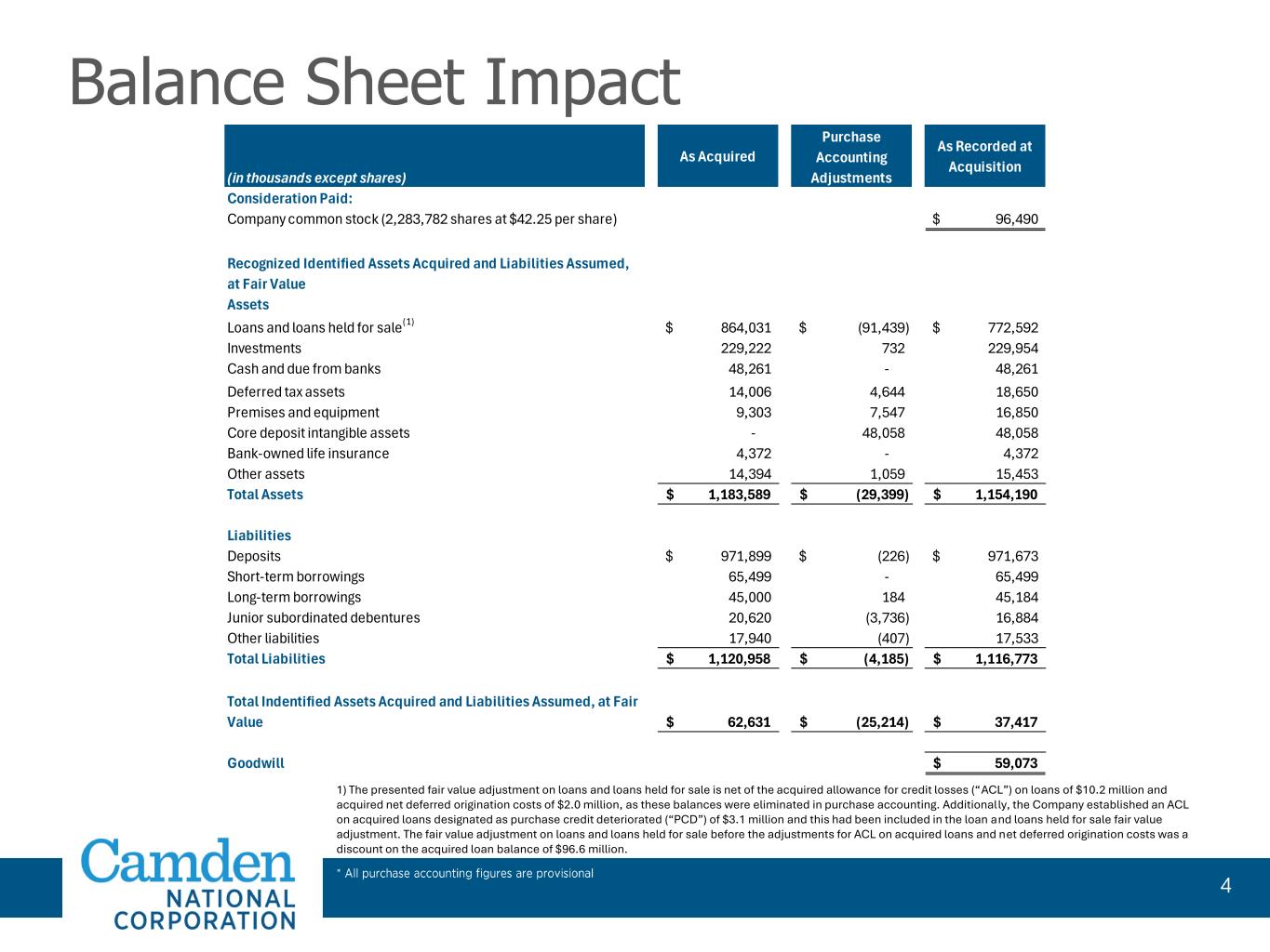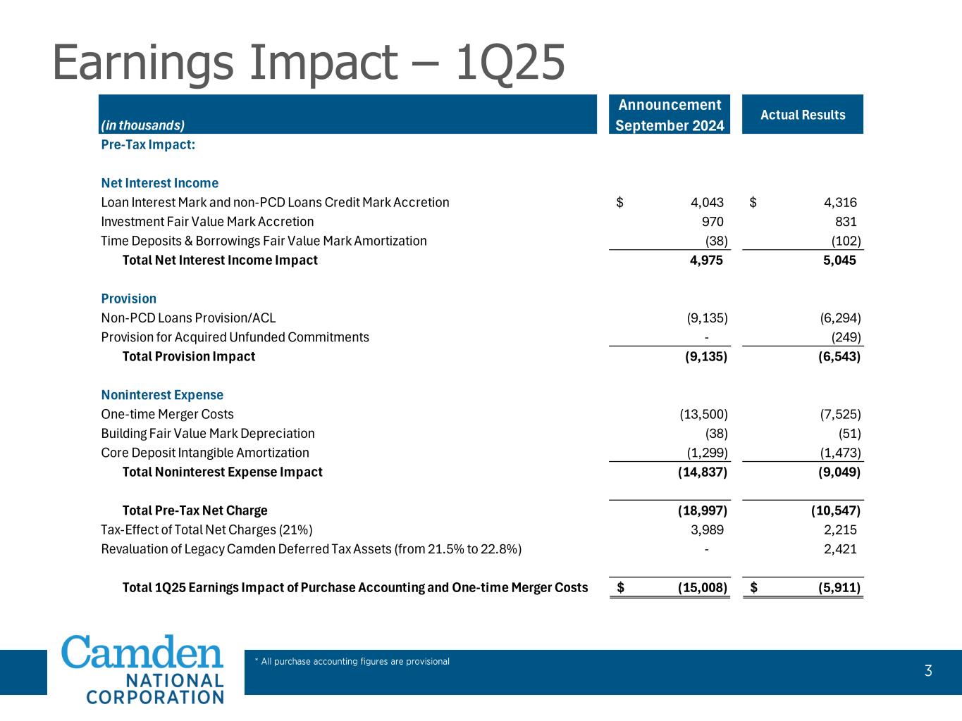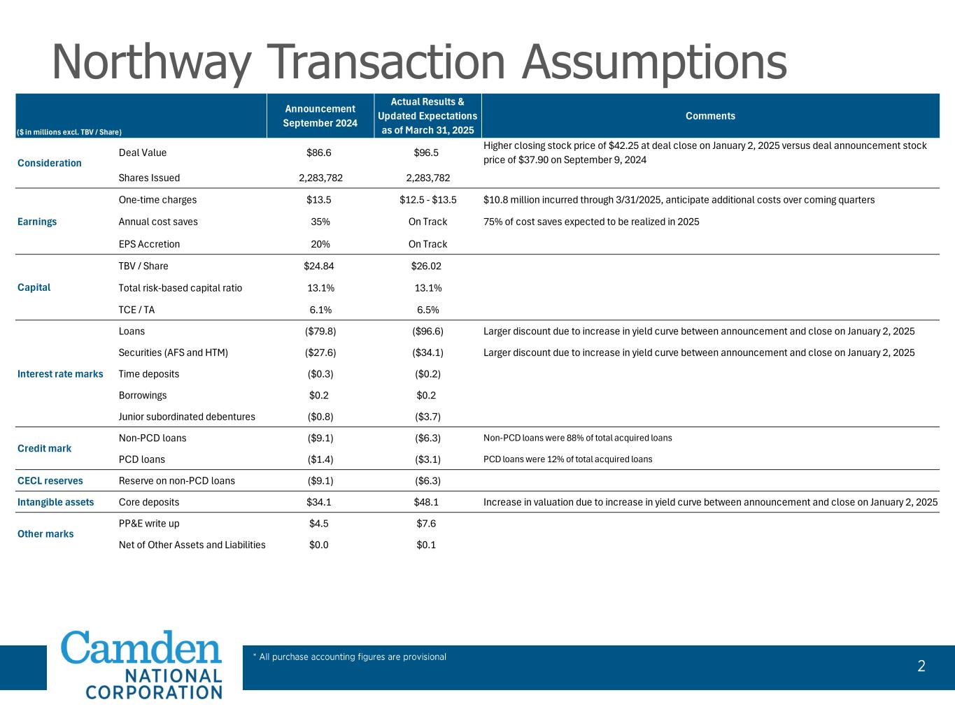 2025年1月2日より前に終了した期間の当社の財務実績は、Camden Nationalの単独ベースの業績を反映しています。その結果、2025 年第 1 四半期の当社の業績は、過去の報告期間と直接比較できない可能性があります。