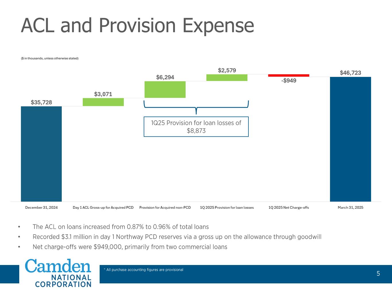 2025年3月31日現在、統合された組織の資産の質は、カムデン・ナショナルと買収したノースウェイのローン・ポートフォリオの継続的な信用力を反映し、堅調であった。