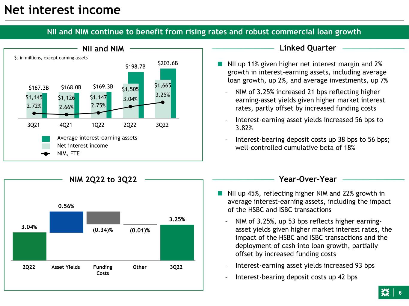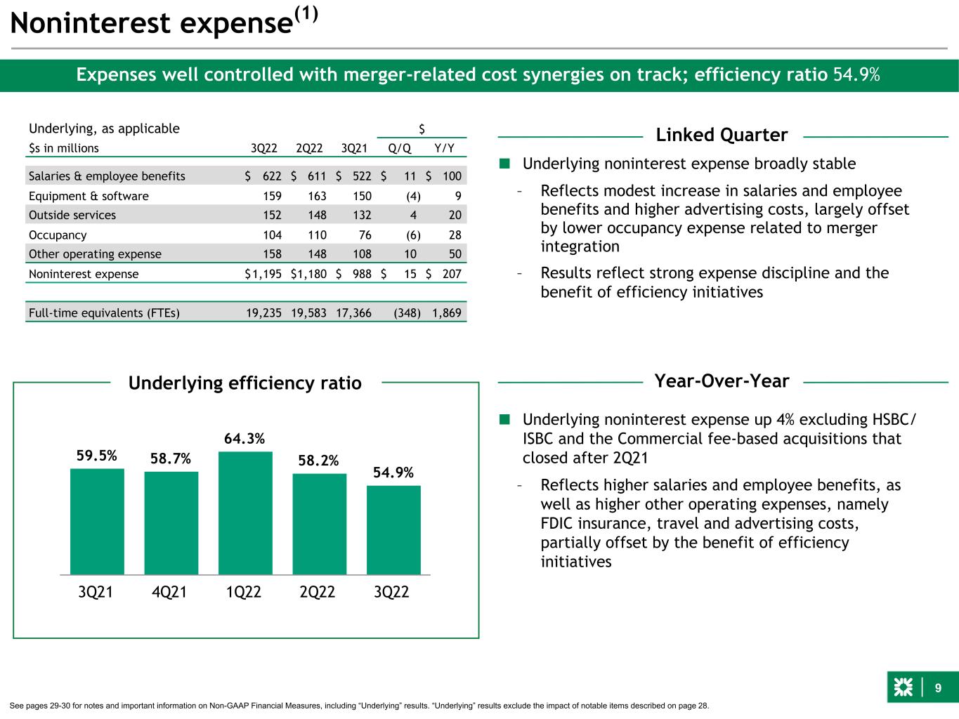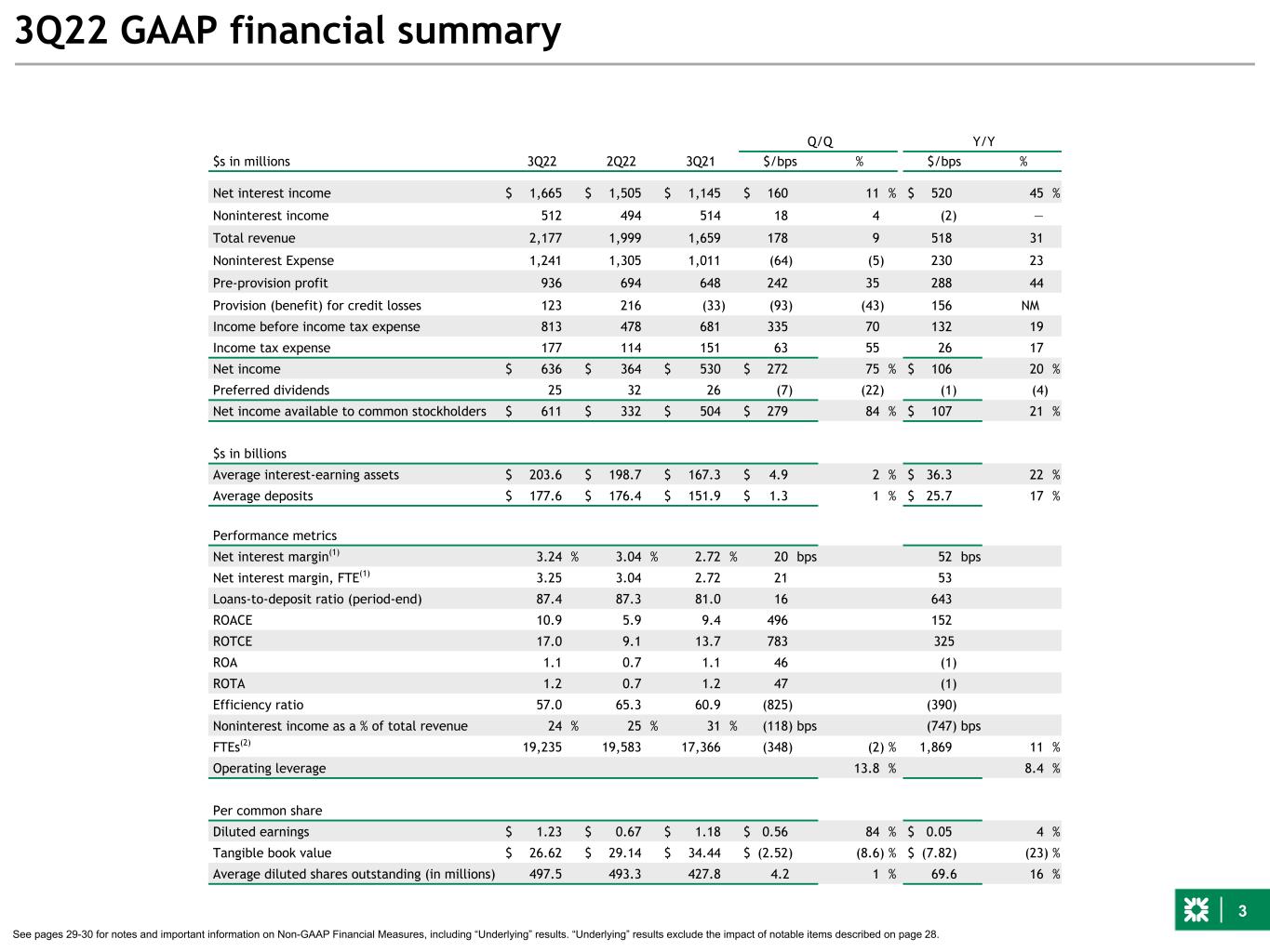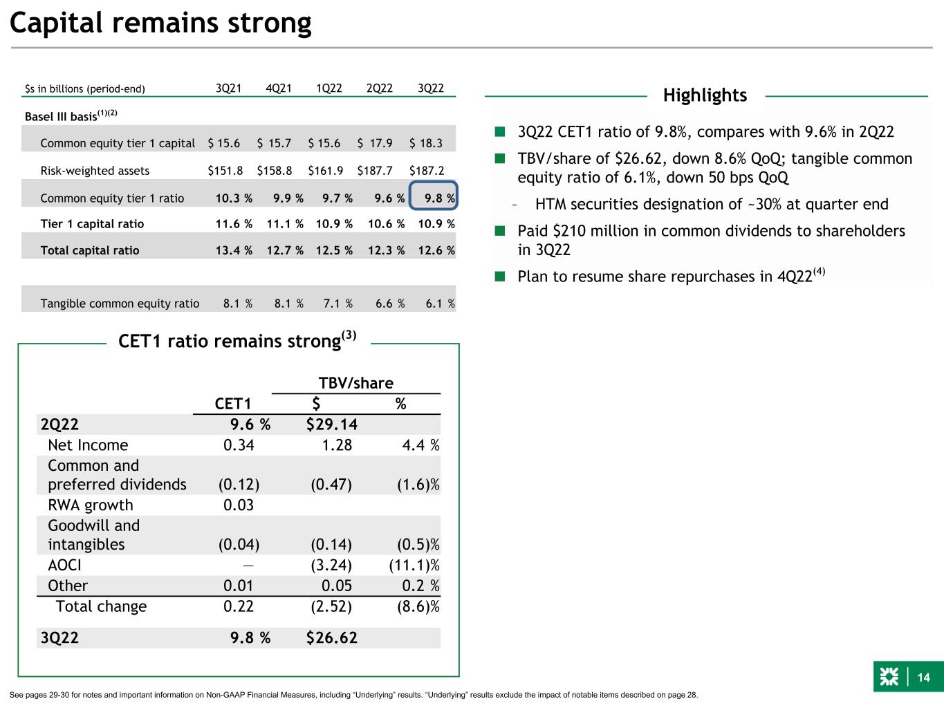 基礎的なEPSは1.30ドル、ROTCEは17.9% ■基礎的なPPNRは982百万ドル、前四半期比16%増 ■純金利マージンの改善(21bps増)と利払い資産の増加によりNIIは前四半期比11%増 ■為替と派生商品の収入が過去最高の前四半期を下回り、手数料は前四半期比2%減 ■費用はよくコントロールされており前四半期比1%増 ■前四半期比で強い正の営業レバレッジ -基礎効率比率は54に向上。平均貸出残高は前期比2%増、期末貸出残高は横ばい -貸出金利回りは前期比62bps上昇 ■平均預金残高は前期比1%増、期末預金残高は横ばい -預金コストは27bps上昇 ■期末LDRは87%、流動性は引き続き高い ■CET1比率は目標の中間点をやや上回る9.8%に ■1株当たりのTBVは26.62ドル、前期比8.6%の低下 ■1株当たり純資産は前期末から2,575億ドル増加 |