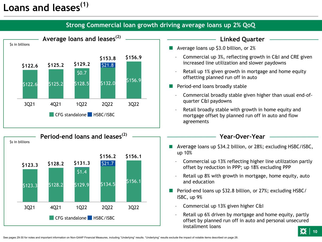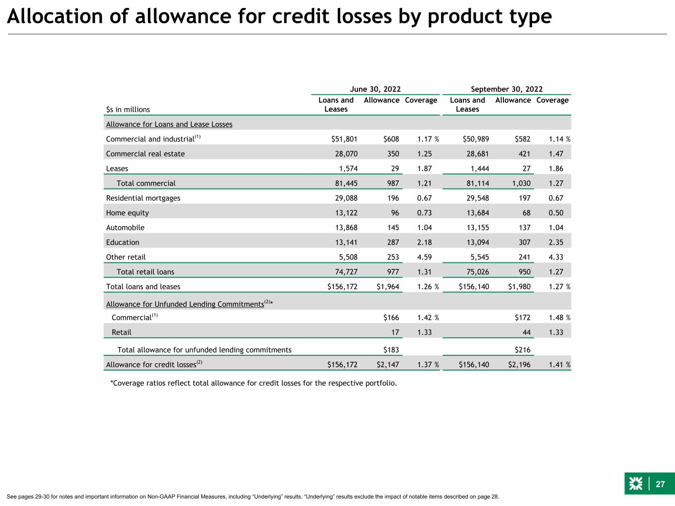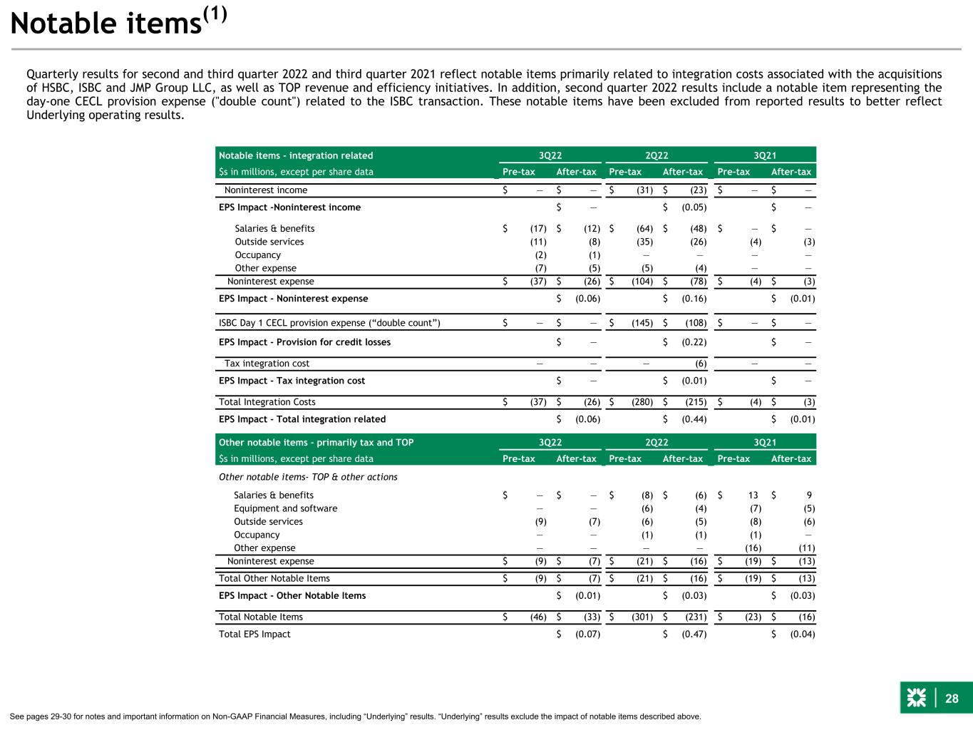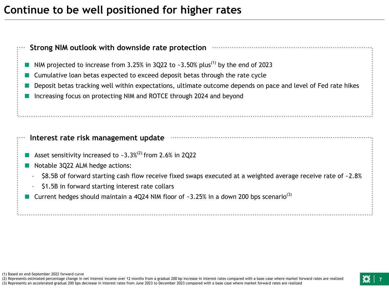 基礎的なEPSは1.30ドル、ROTCEは17.9% ■基礎的なPPNRは982百万ドル、前四半期比16%増 ■純金利マージンの改善(21bps増)と利払い資産の増加によりNIIは前四半期比11%増 ■為替と派生商品の収入が過去最高の前四半期を下回り、手数料は前四半期比2%減 ■費用はよくコントロールされており前四半期比1%増 ■前四半期比で強い正の営業レバレッジ -基礎効率比率は54に向上。平均貸出残高は前期比2%増、期末貸出残高は横ばい -貸出金利回りは前期比62bps上昇 ■平均預金残高は前期比1%増、期末預金残高は横ばい -預金コストは27bps上昇 ■期末LDRは87%、流動性は引き続き高い ■CET1比率は目標の中間点をやや上回る9.8%に ■1株当たりのTBVは26.62ドル、前期比8.6%の低下 ■1株当たり純資産は前期末から2,575億ドル増加 |