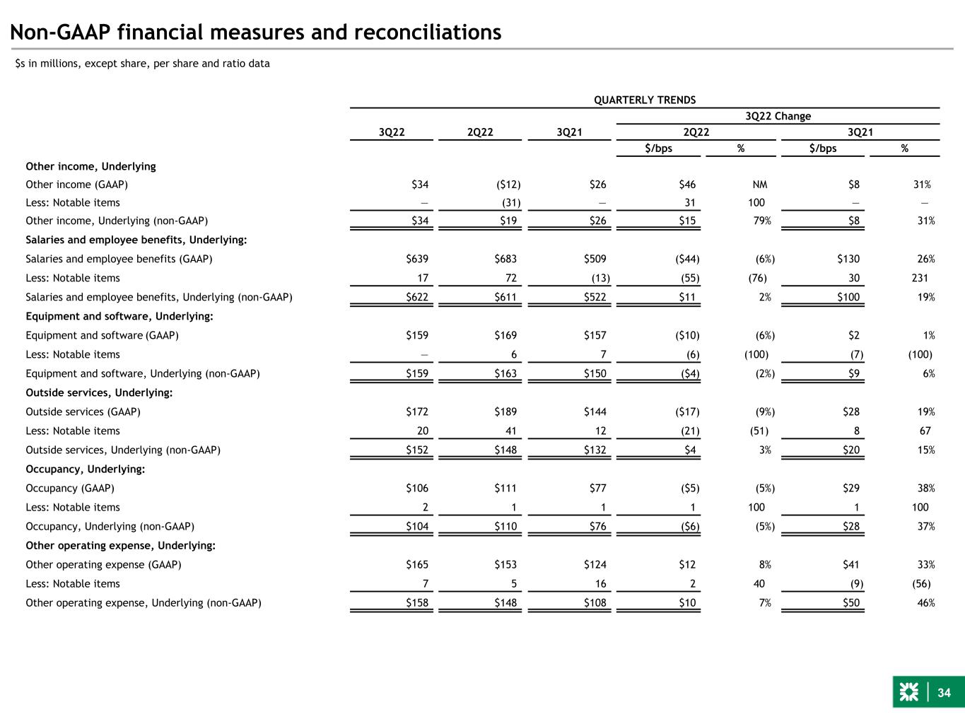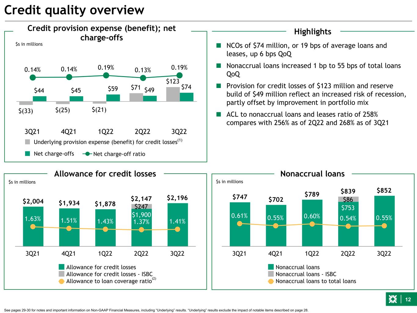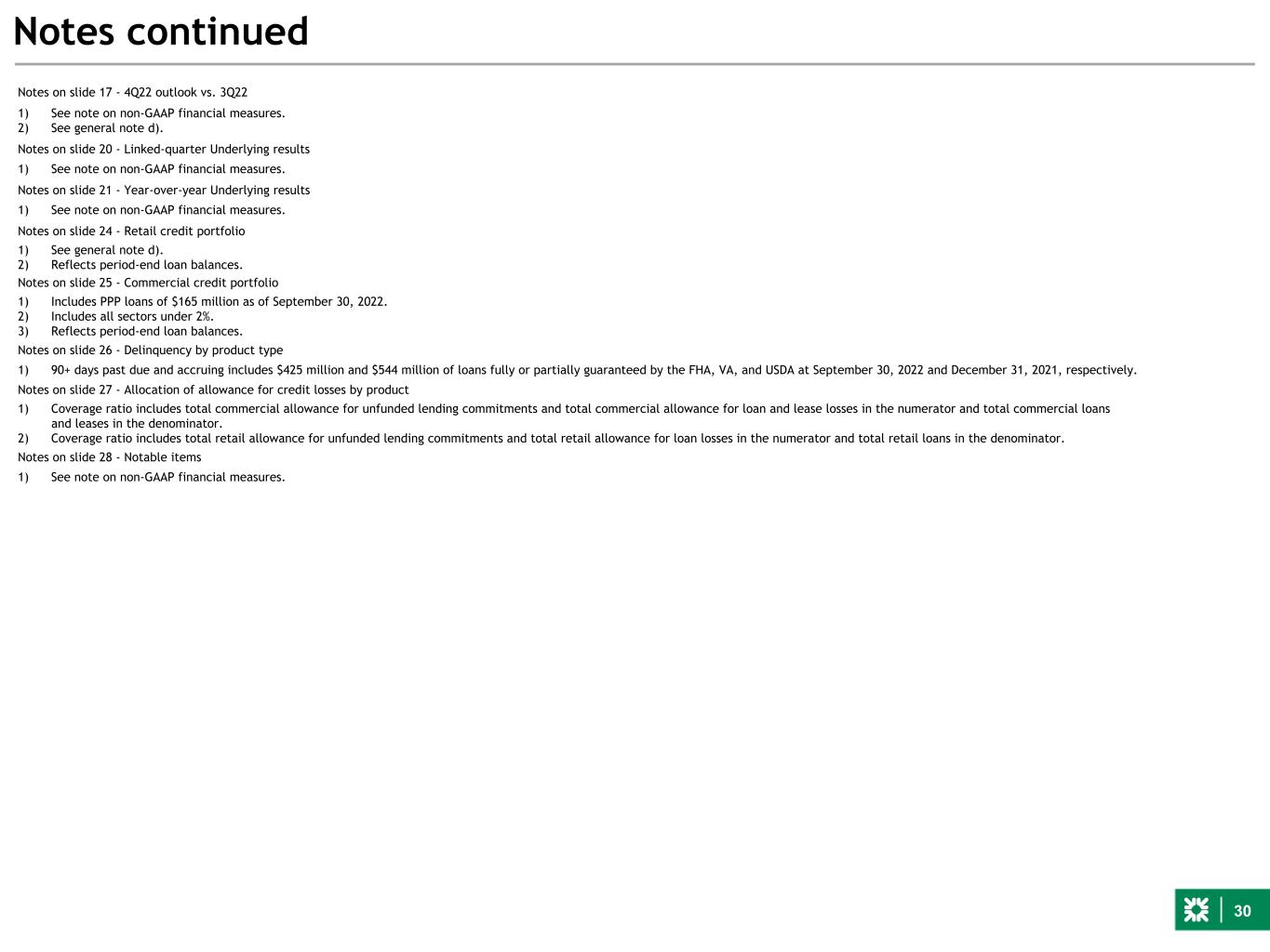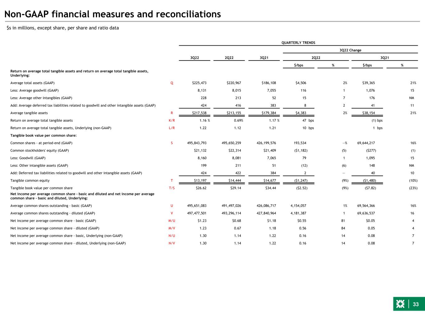 基礎的なEPSは1.30ドル、ROTCEは17.9% ■基礎的なPPNRは982百万ドル、前四半期比16%増 ■純金利マージンの改善(21bps増)と利払い資産の増加によりNIIは前四半期比11%増 ■為替と派生商品の収入が過去最高の前四半期を下回り、手数料は前四半期比2%減 ■費用はよくコントロールされており前四半期比1%増 ■前四半期比で強い正の営業レバレッジ -基礎効率比率は54に向上。平均貸出残高は前期比2%増、期末貸出残高は横ばい -貸出金利回りは前期比62bps上昇 ■平均預金残高は前期比1%増、期末預金残高は横ばい -預金コストは27bps上昇 ■期末LDRは87%、流動性は引き続き高い ■CET1比率は目標の中間点をやや上回る9.8%に ■1株当たりのTBVは26.62ドル、前期比8.6%の低下 ■1株当たり純資産は前期末から2,575億ドル増加 |