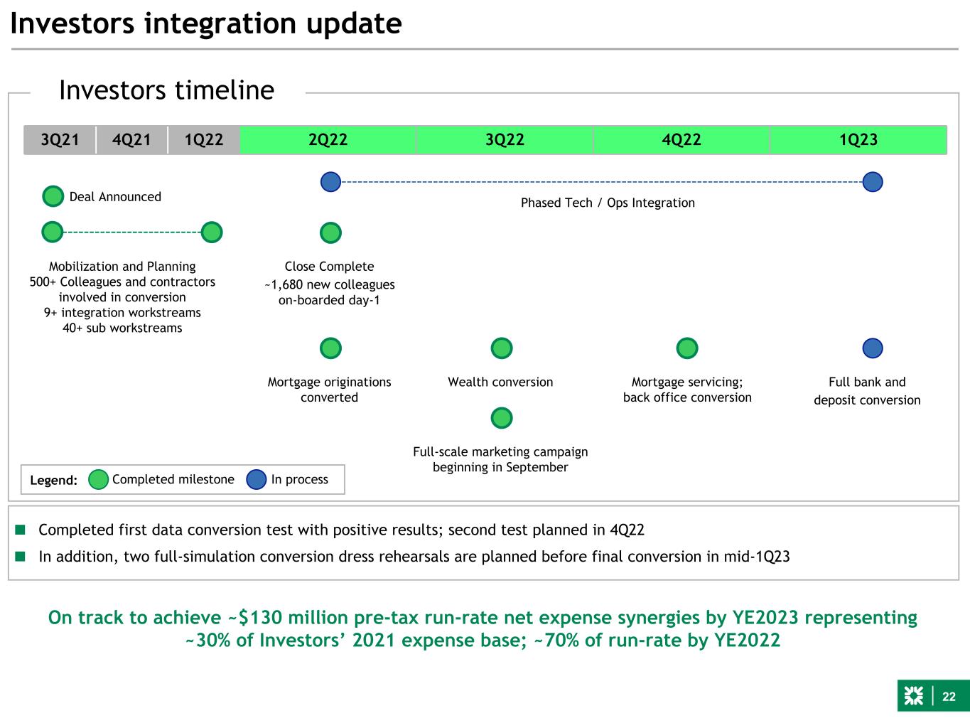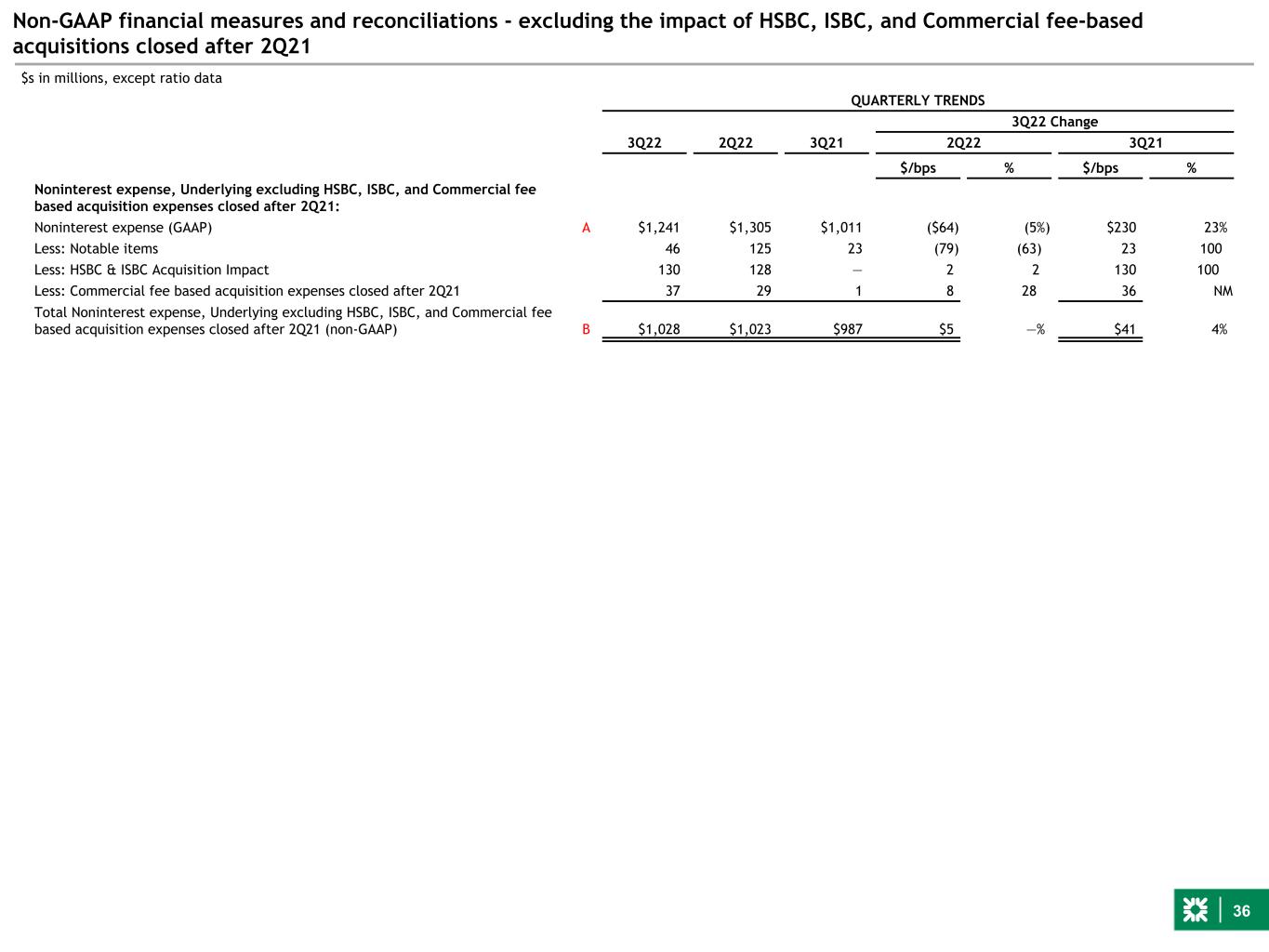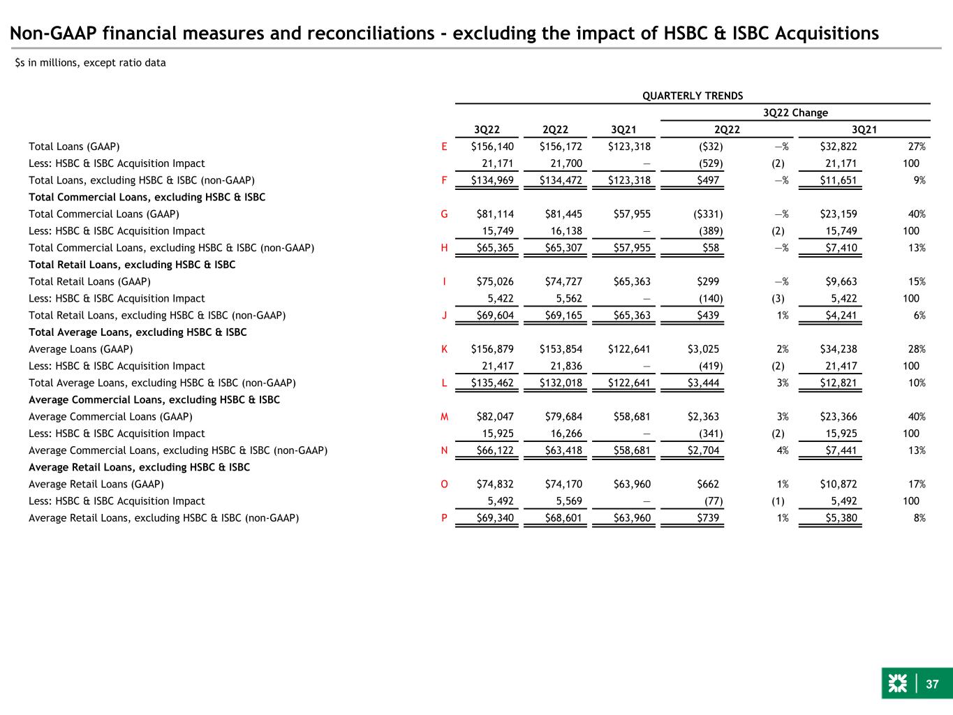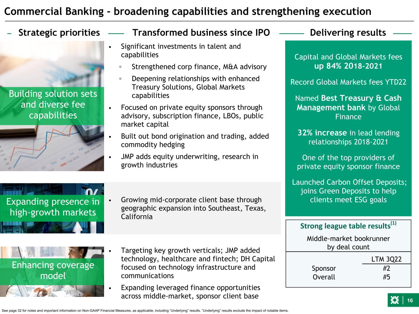 基礎的なEPSは1.30ドル、ROTCEは17.9% ■基礎的なPPNRは982百万ドル、前四半期比16%増 ■純金利マージンの改善(21bps増)と利払い資産の増加によりNIIは前四半期比11%増 ■為替と派生商品の収入が過去最高の前四半期を下回り、手数料は前四半期比2%減 ■費用はよくコントロールされており前四半期比1%増 ■前四半期比で強い正の営業レバレッジ -基礎効率比率は54に向上。平均貸出残高は前期比2%増、期末貸出残高は横ばい -貸出金利回りは前期比62bps上昇 ■平均預金残高は前期比1%増、期末預金残高は横ばい -預金コストは27bps上昇 ■期末LDRは87%、流動性は引き続き高い ■CET1比率は目標の中間点をやや上回る9.8%に ■1株当たりのTBVは26.62ドル、前期比8.6%の低下 ■1株当たり純資産は前期末から2,575億ドル増加 |