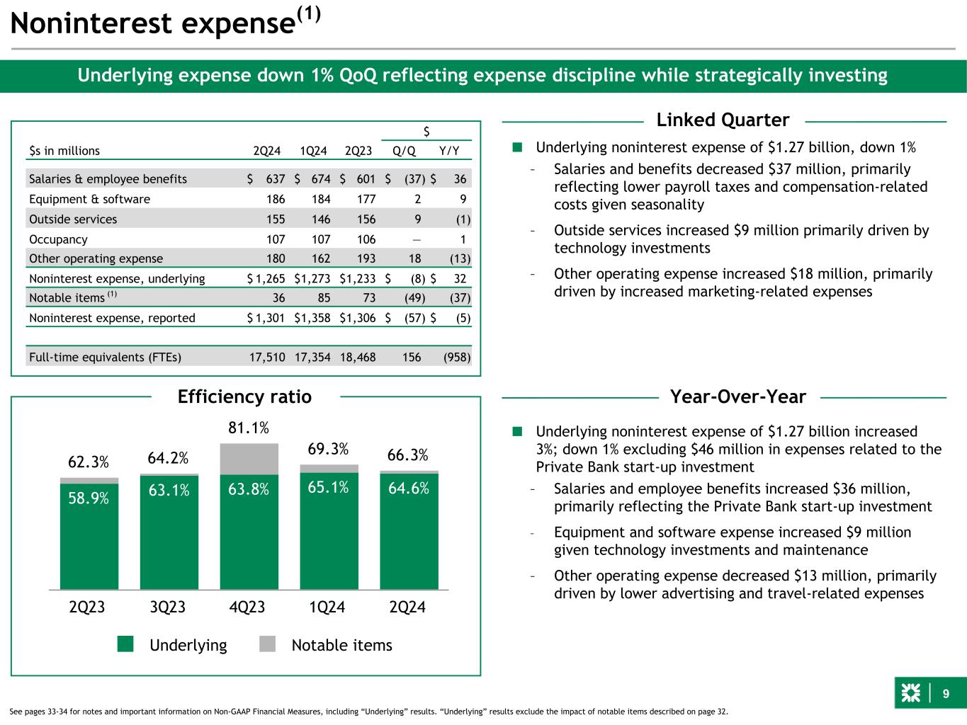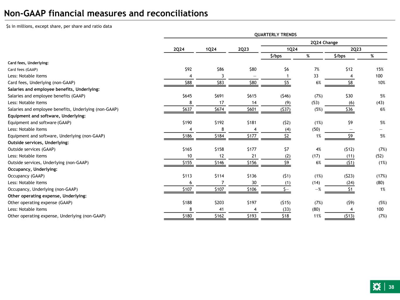 | Salaries and employee benefits, Underlying (non-GAAP) | $637 | $674 | $635 | $654 | $601 | ($37) | (5 | %) | $36 | 6 | % | $1,311 | $1,243 | $68 | 5 | % | ||||||||||||||||||||||||||||||||||||||||||||||||||||||||||||||||